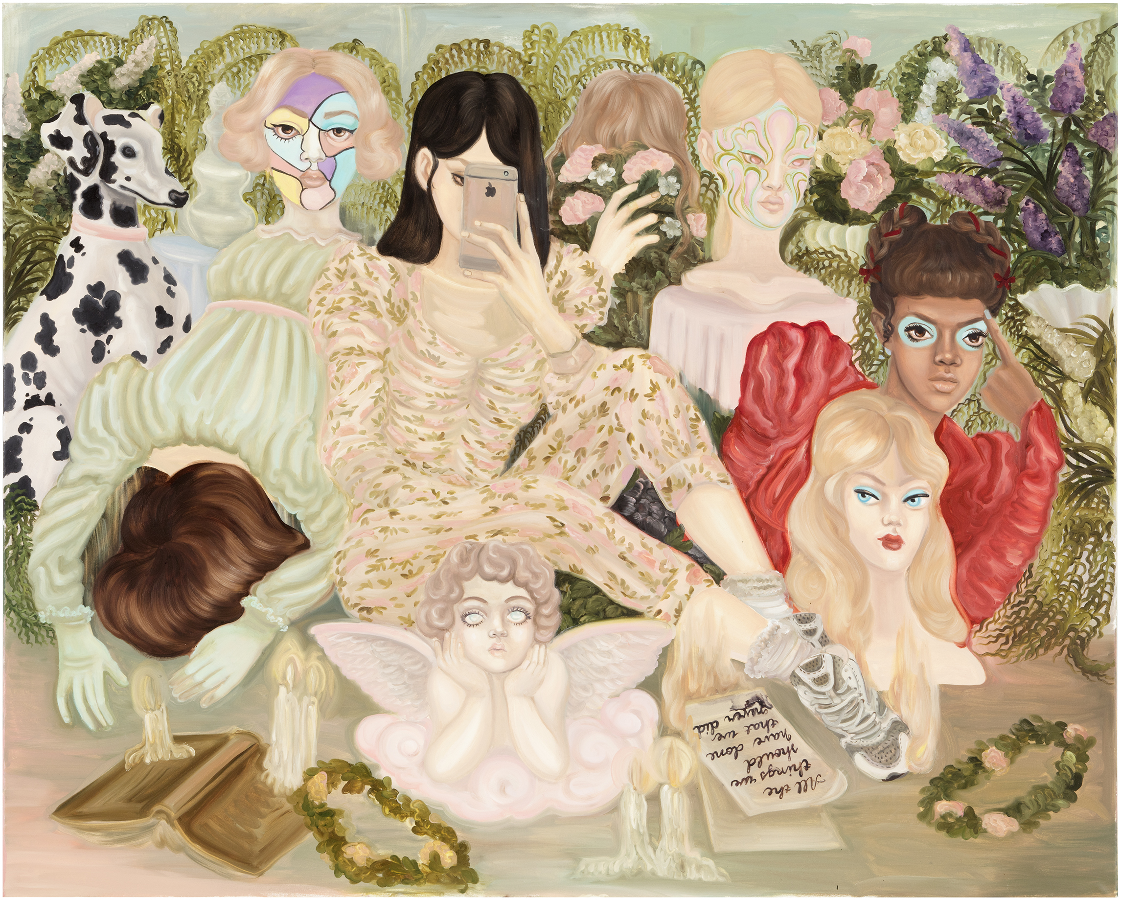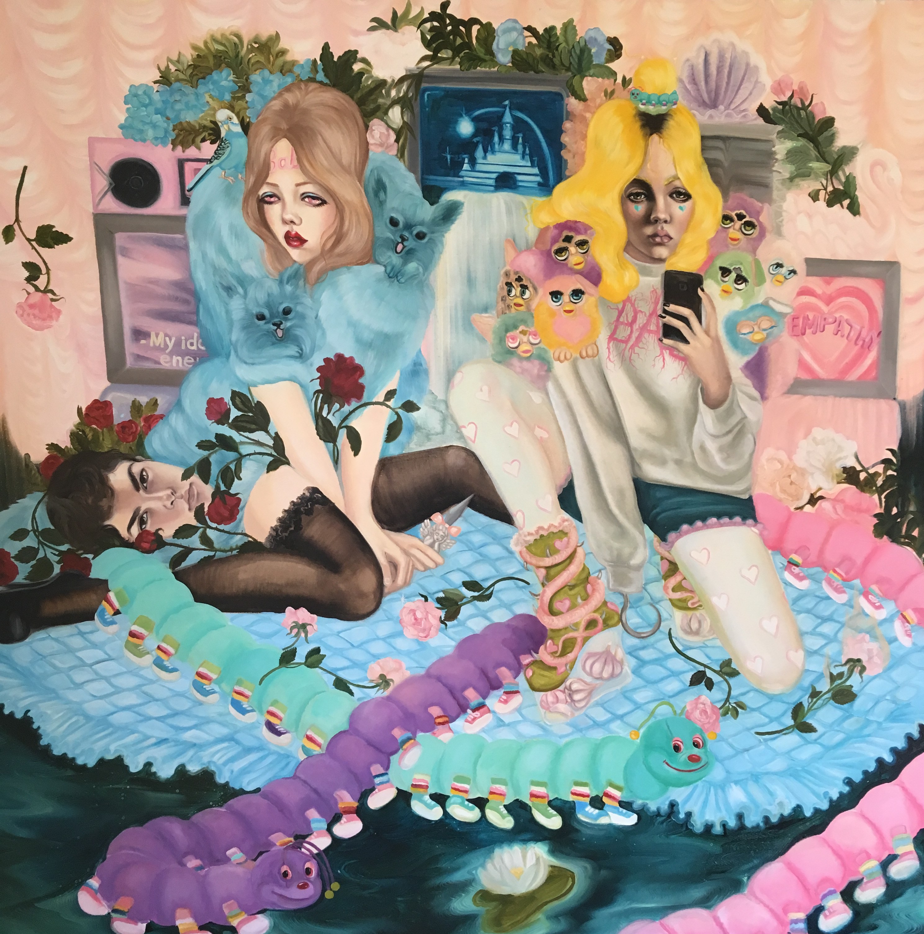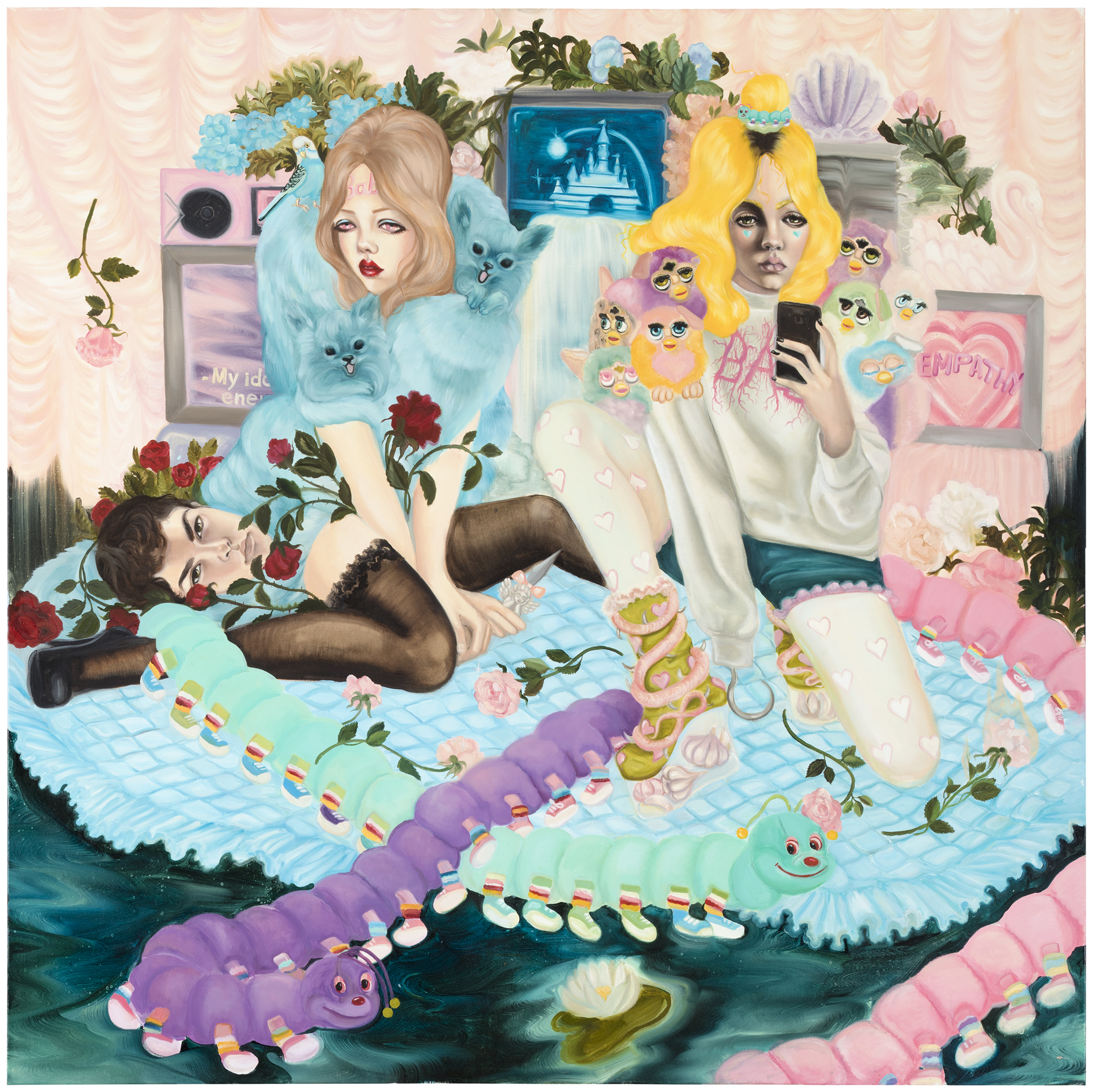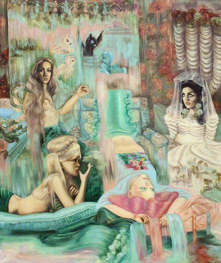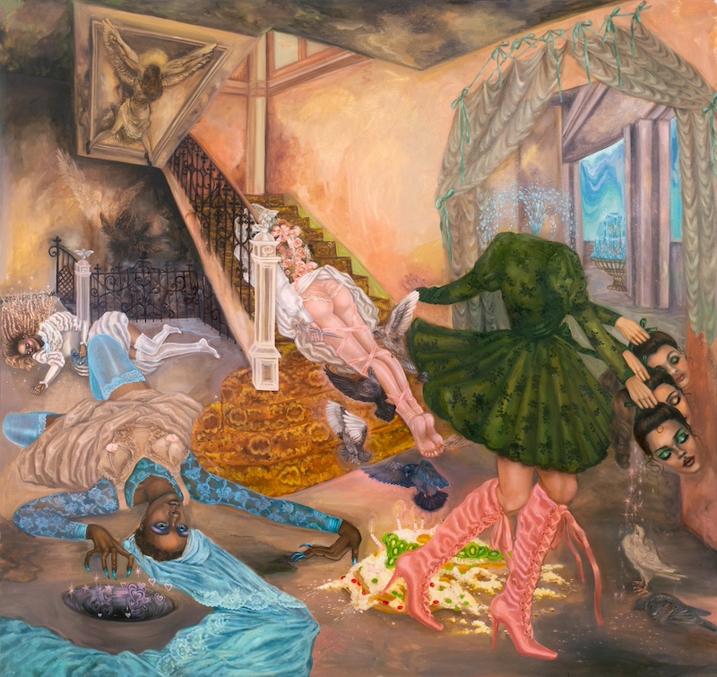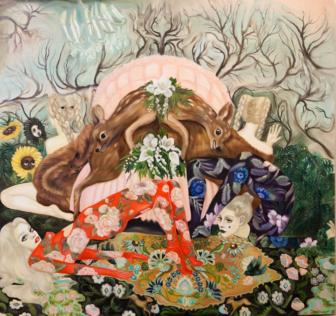 Emma Ainala is known for her intricate, detailed works that explore mythologies and a variety of spaces, both physical and digital – some even imagined. The human body, with its ambivalent gestures and expressions, is at the center of the works, being the object of the gaze and objectification are recurring themes. Her dreamlike paintings are at the same time very much in the present and contain references to art and cultural history. The thoughtful symbolism of the interiors of the works and the fragmented, dense surface enable several different interpretations and visits to parallel realities. Ainala's carefully stylized paintings are like performances of some unfinished and mysterious situation.