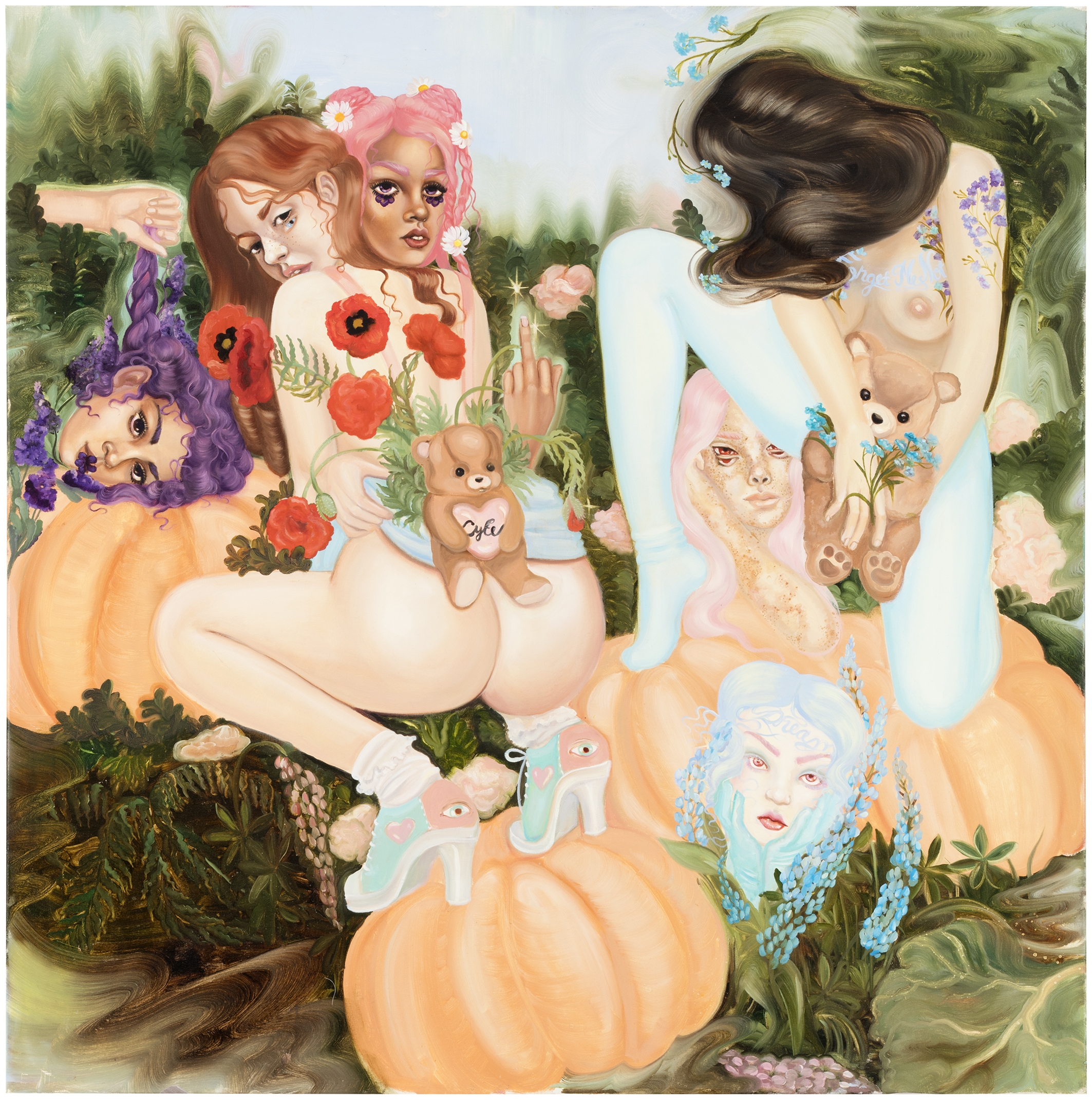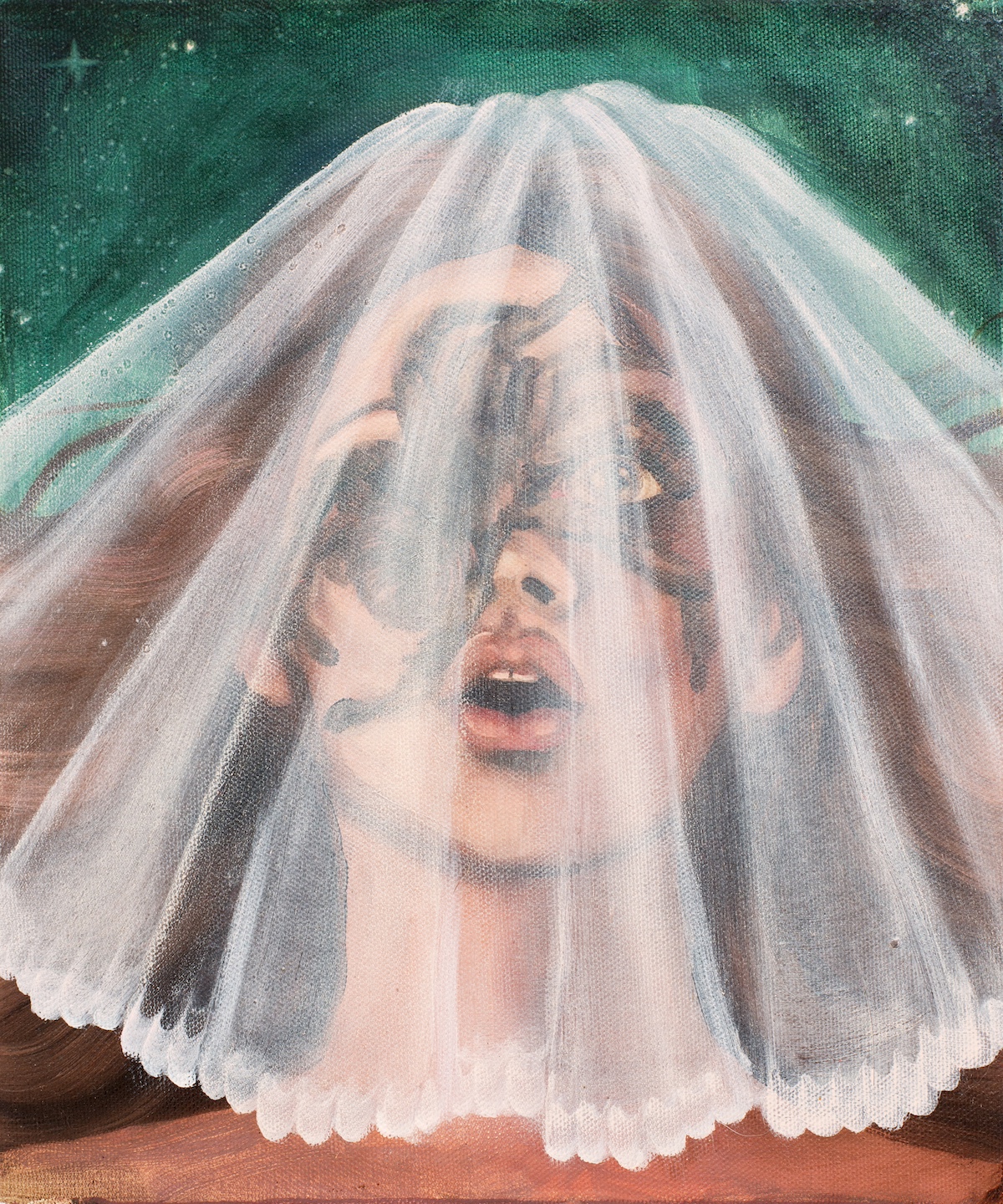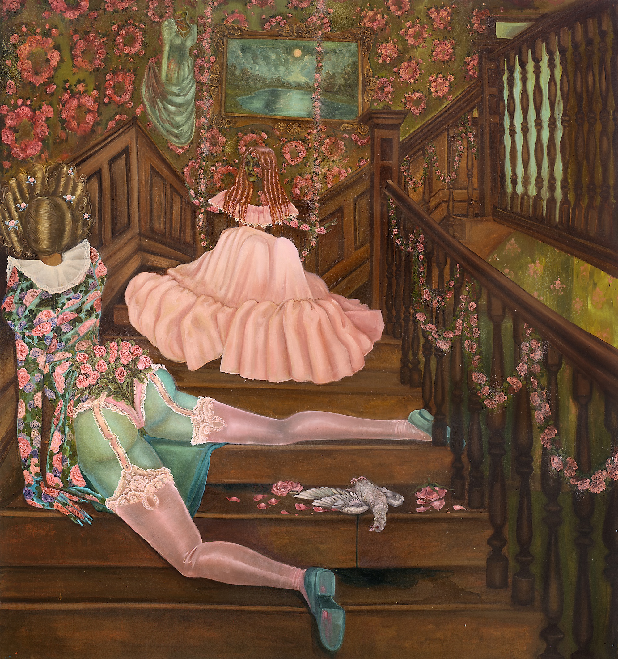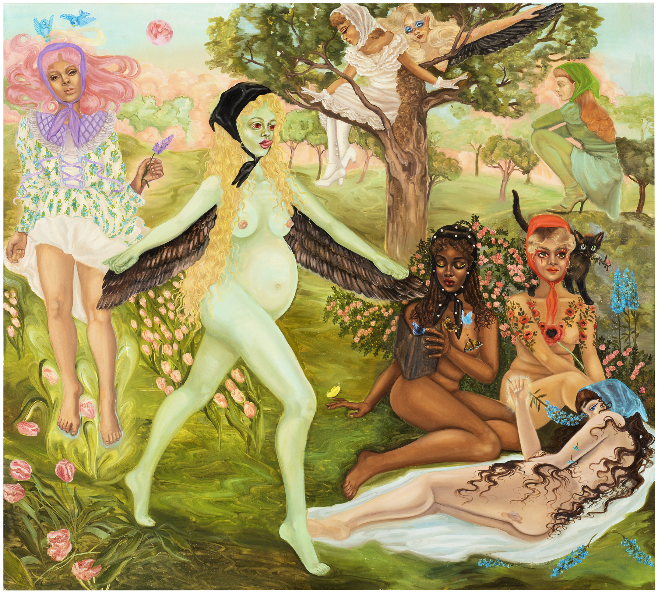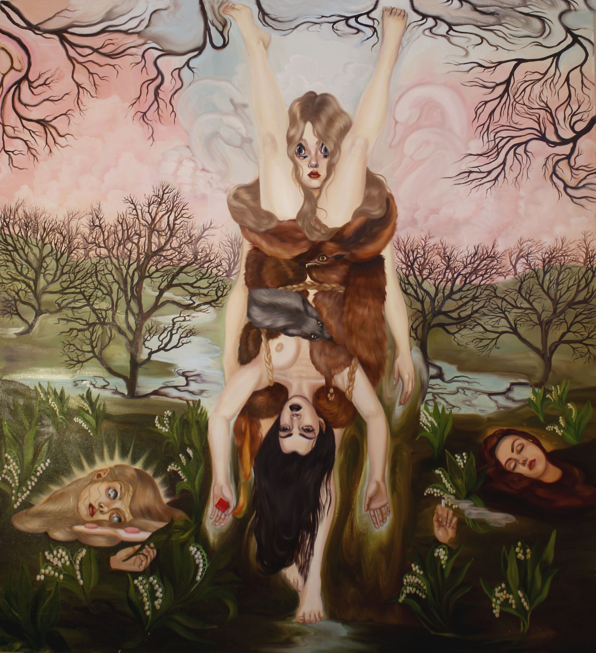 Emma Ainala is known for her intricate, detailed works that explore mythologies and a variety of spaces, both physical and digital – some even imagined. The human body, with its ambivalent gestures and expressions, is at the center of the works, being the object of the gaze and objectification are recurring themes. Her dreamlike paintings are at the same time very much in the present and contain references to art and cultural history. The thoughtful symbolism of the interiors of the works and the fragmented, dense surface enable several different interpretations and visits to parallel realities. Ainala's carefully stylized paintings are like performances of some unfinished and mysterious situation.