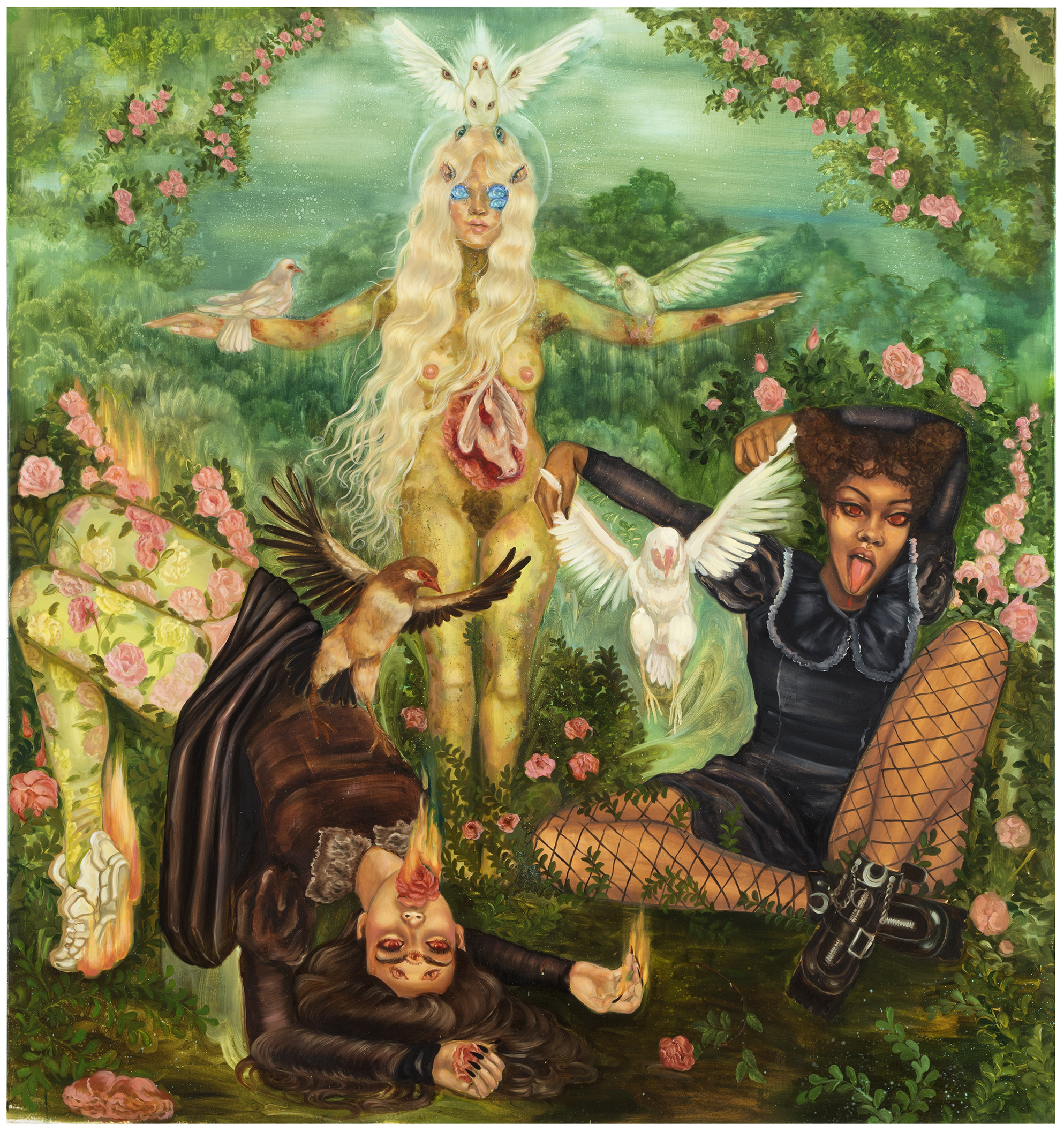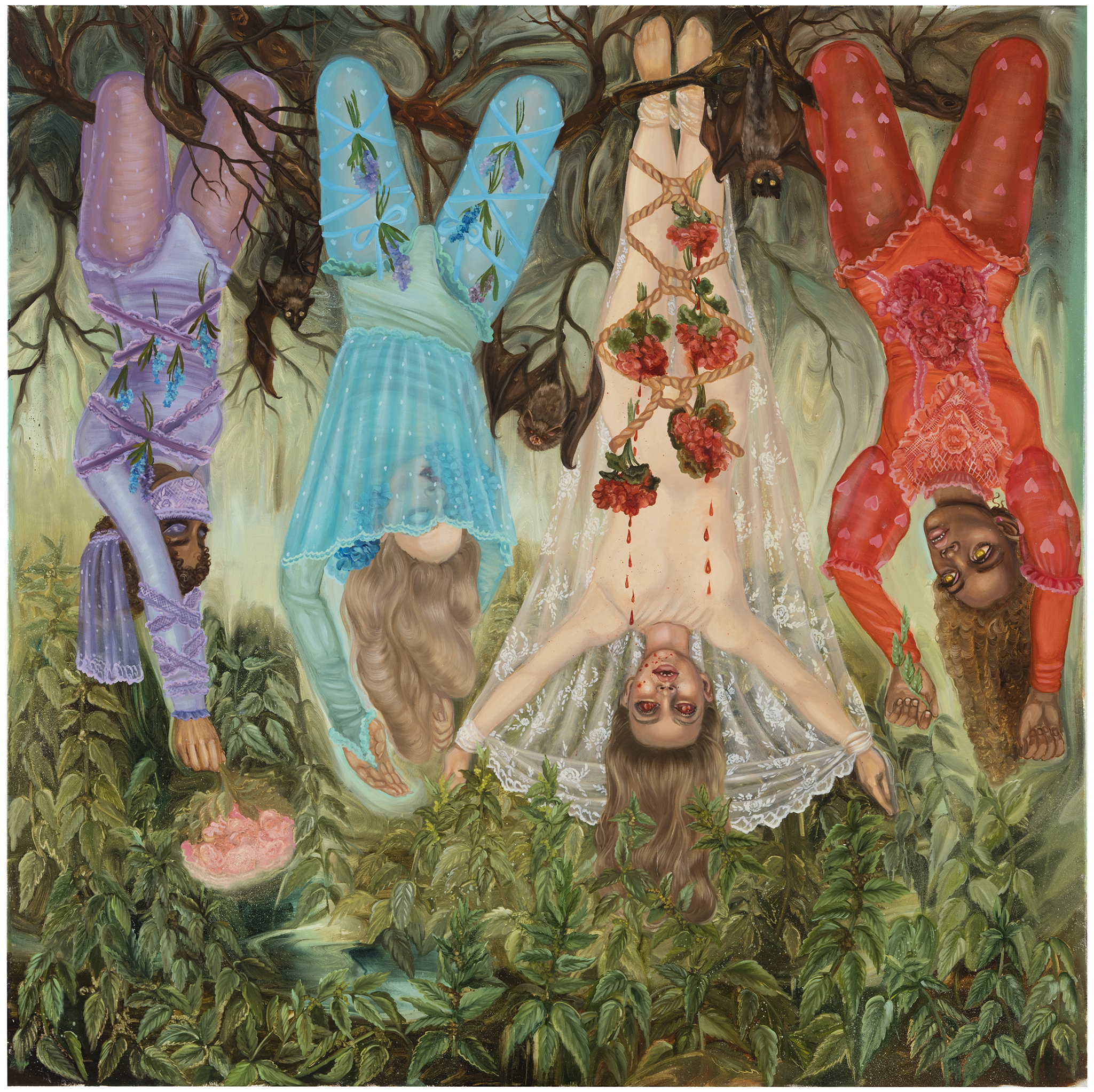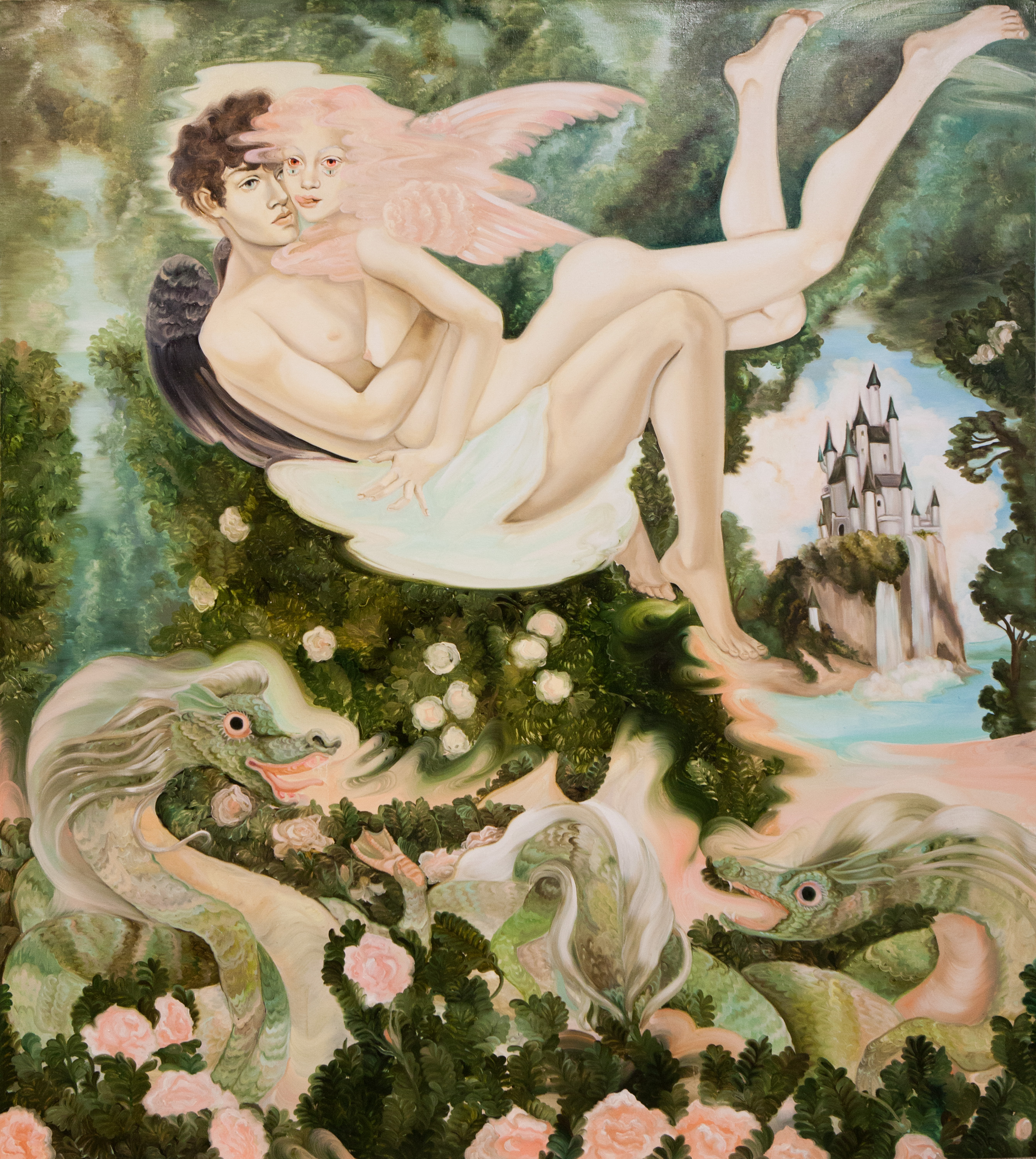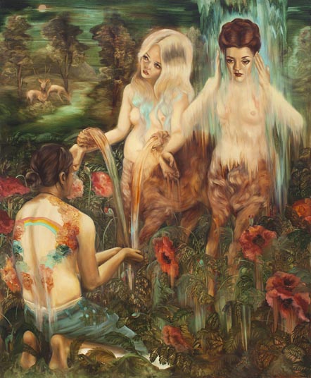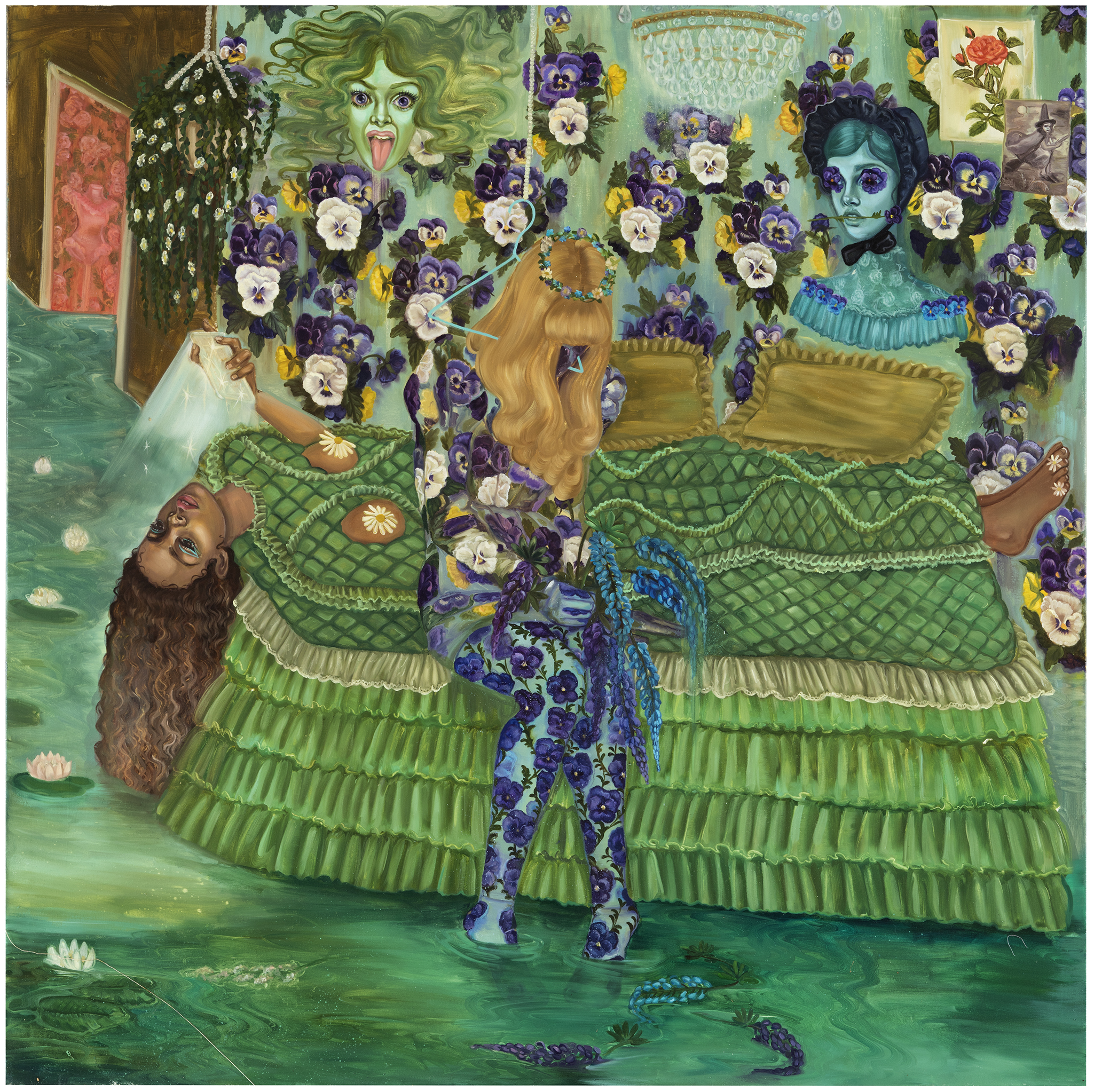 Emma Ainala is known for her intricate, detailed works that explore mythologies and a variety of spaces, both physical and digital – some even imagined. The human body, with its ambivalent gestures and expressions, is at the center of the works, being the object of the gaze and objectification are recurring themes. Her dreamlike paintings are at the same time very much in the present and contain references to art and cultural history. The thoughtful symbolism of the interiors of the works and the fragmented, dense surface enable several different interpretations and visits to parallel realities. Ainala's carefully stylized paintings are like performances of some unfinished and mysterious situation.