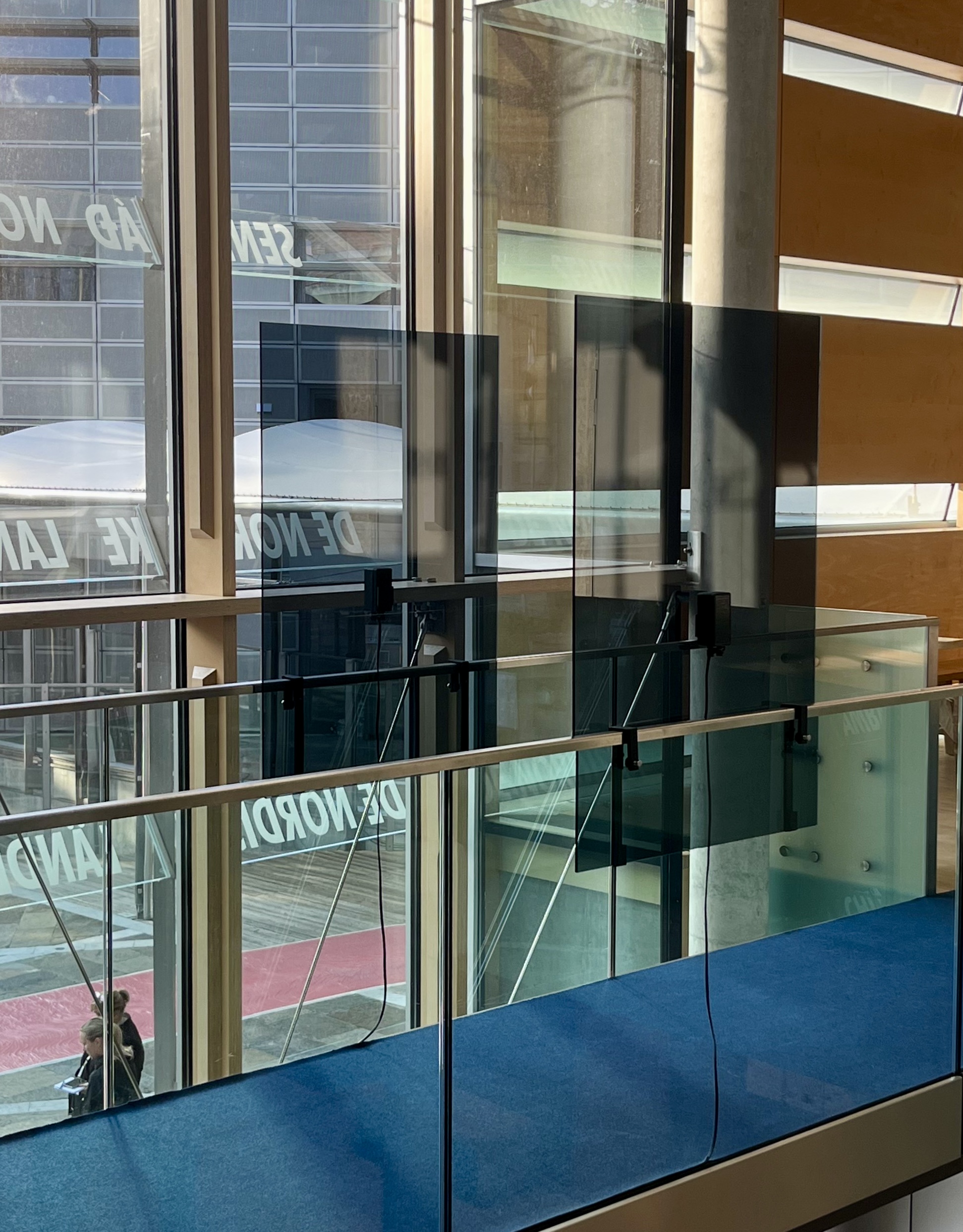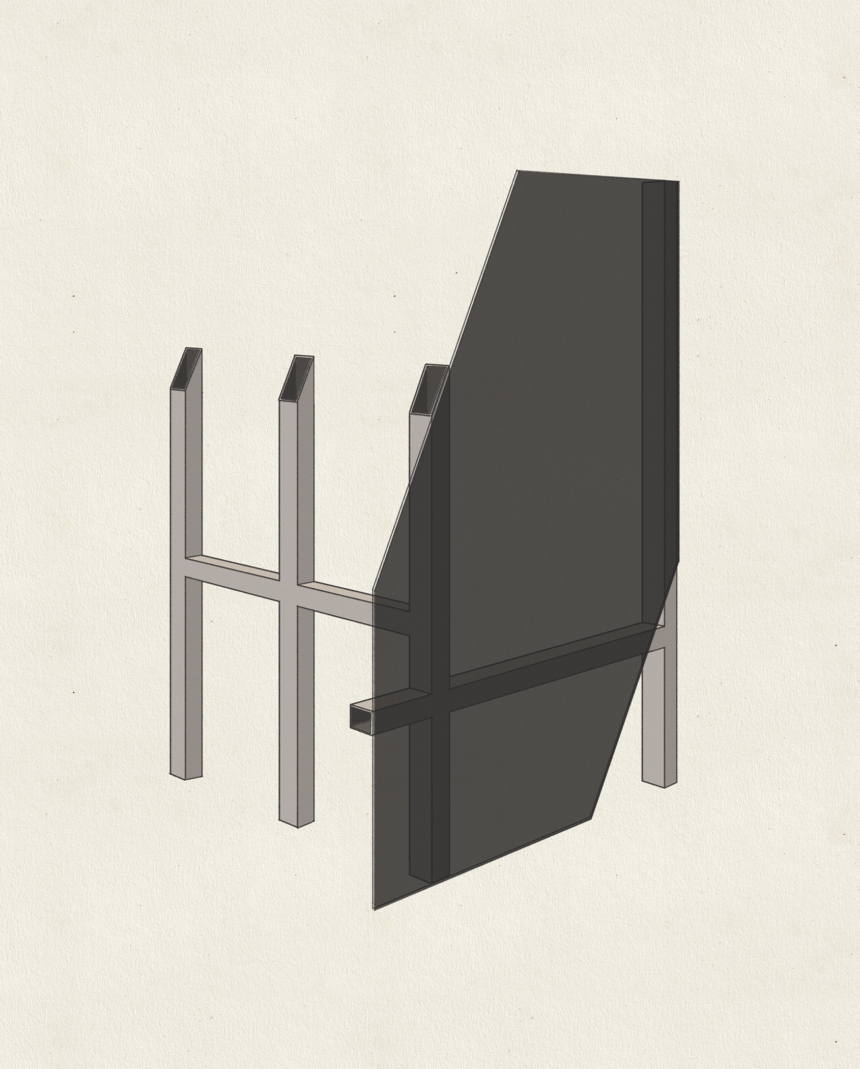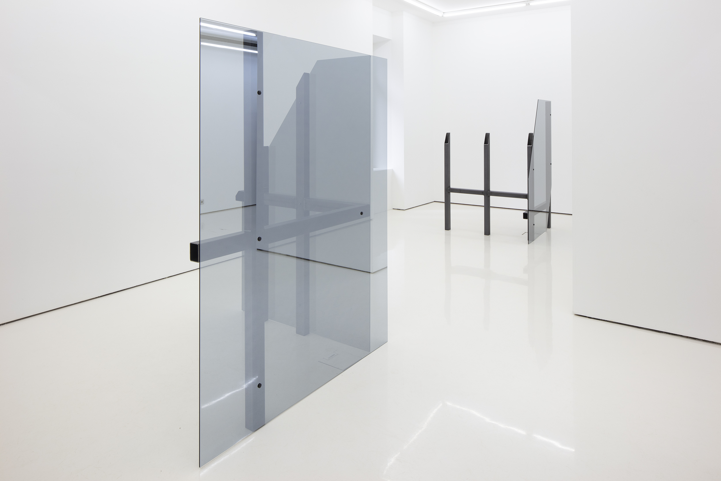 installation in three parts, semi-reflective glass, steel