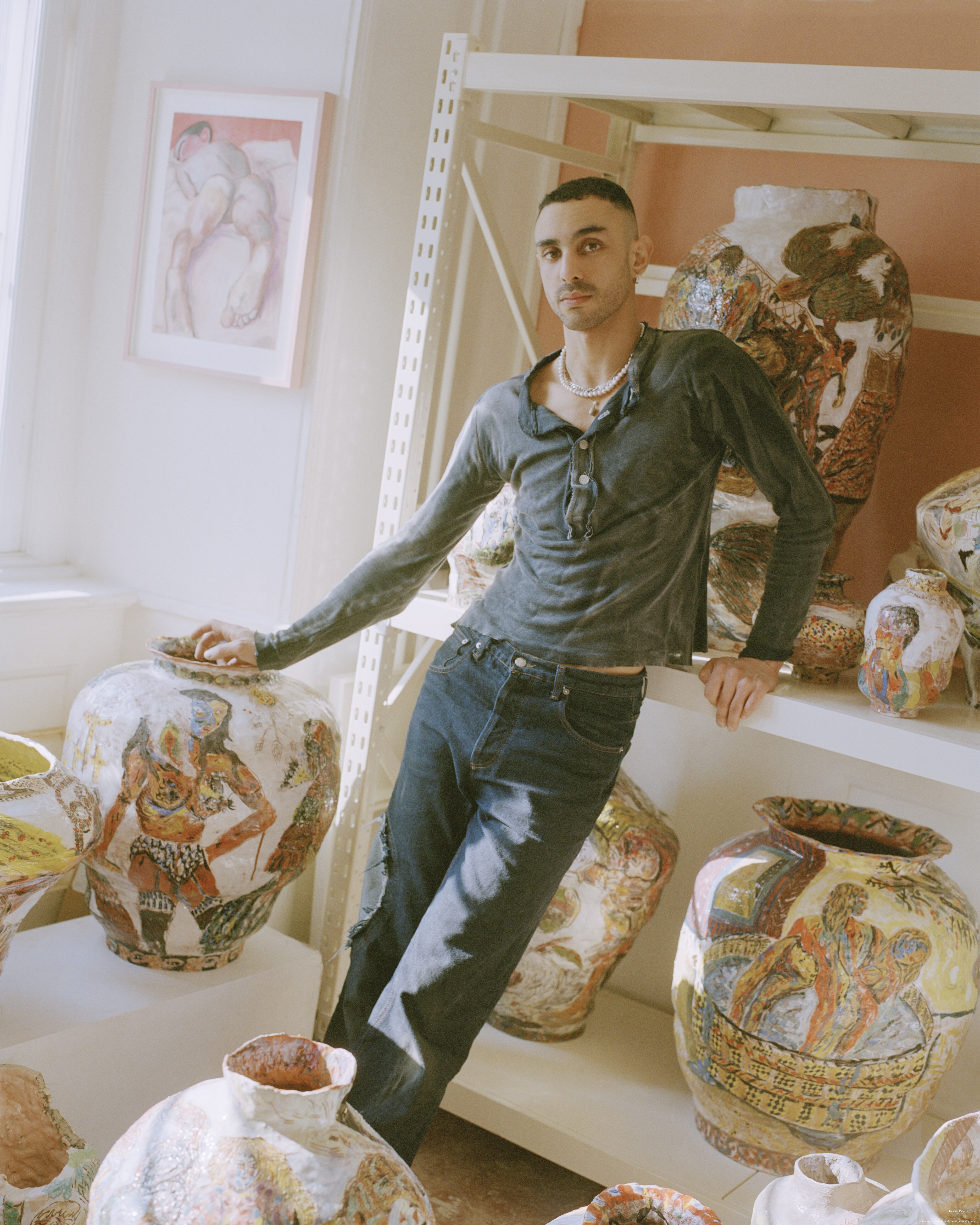 Boumjimar challenges social hierachies and norms through performance, painting, sculpture, installation, and drawing. His works explore queer communities and interspecies kinship and investigate the complex relationship between nature, culture, and identity.