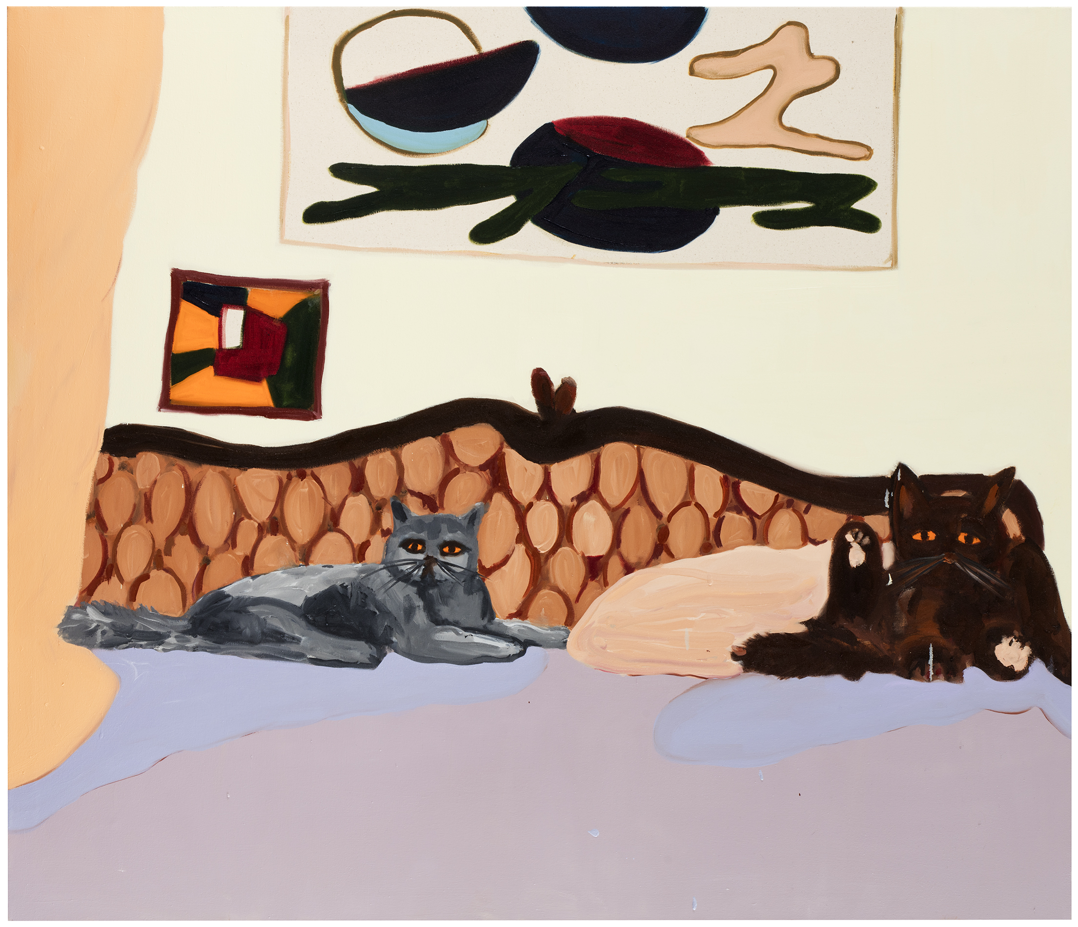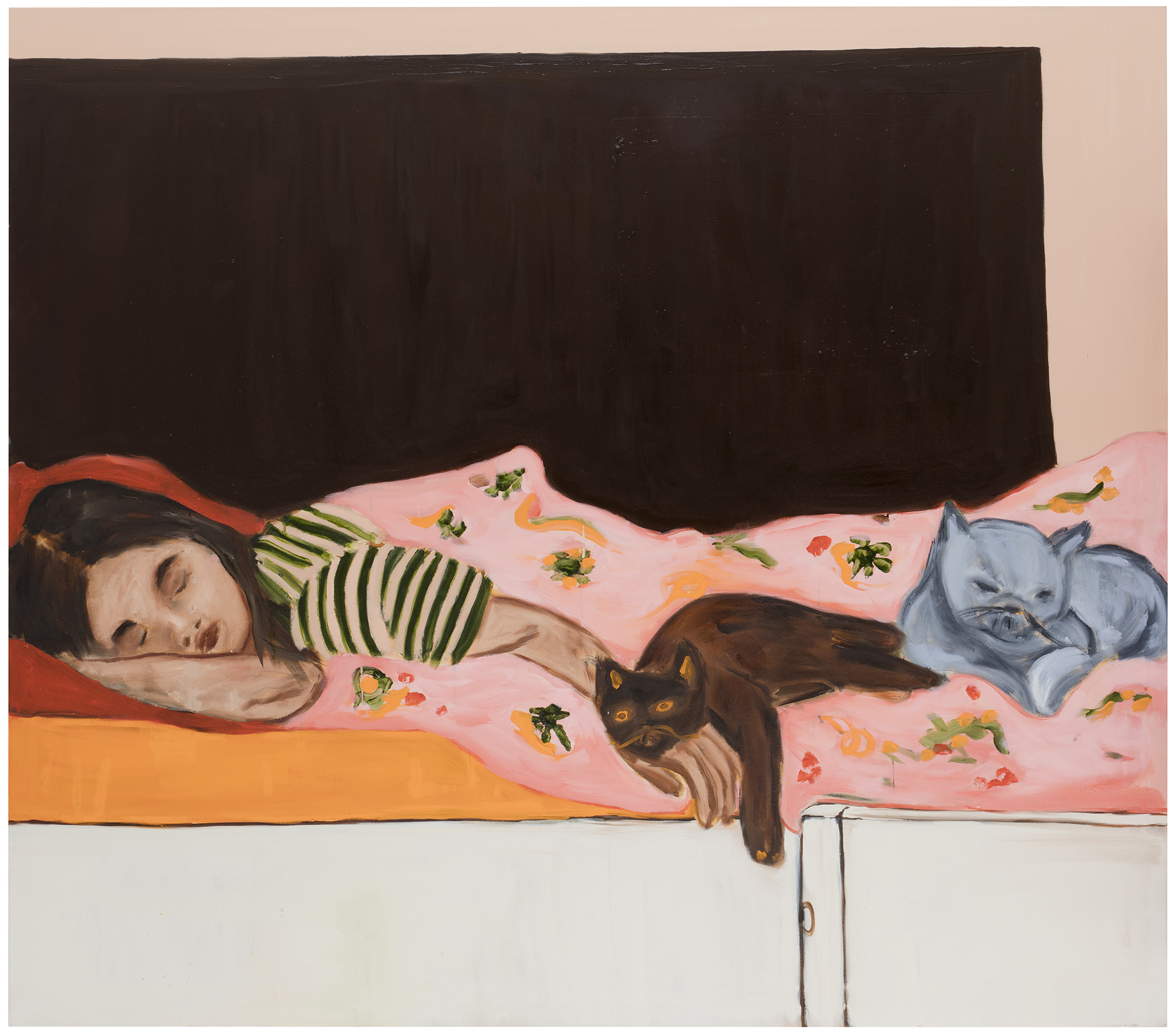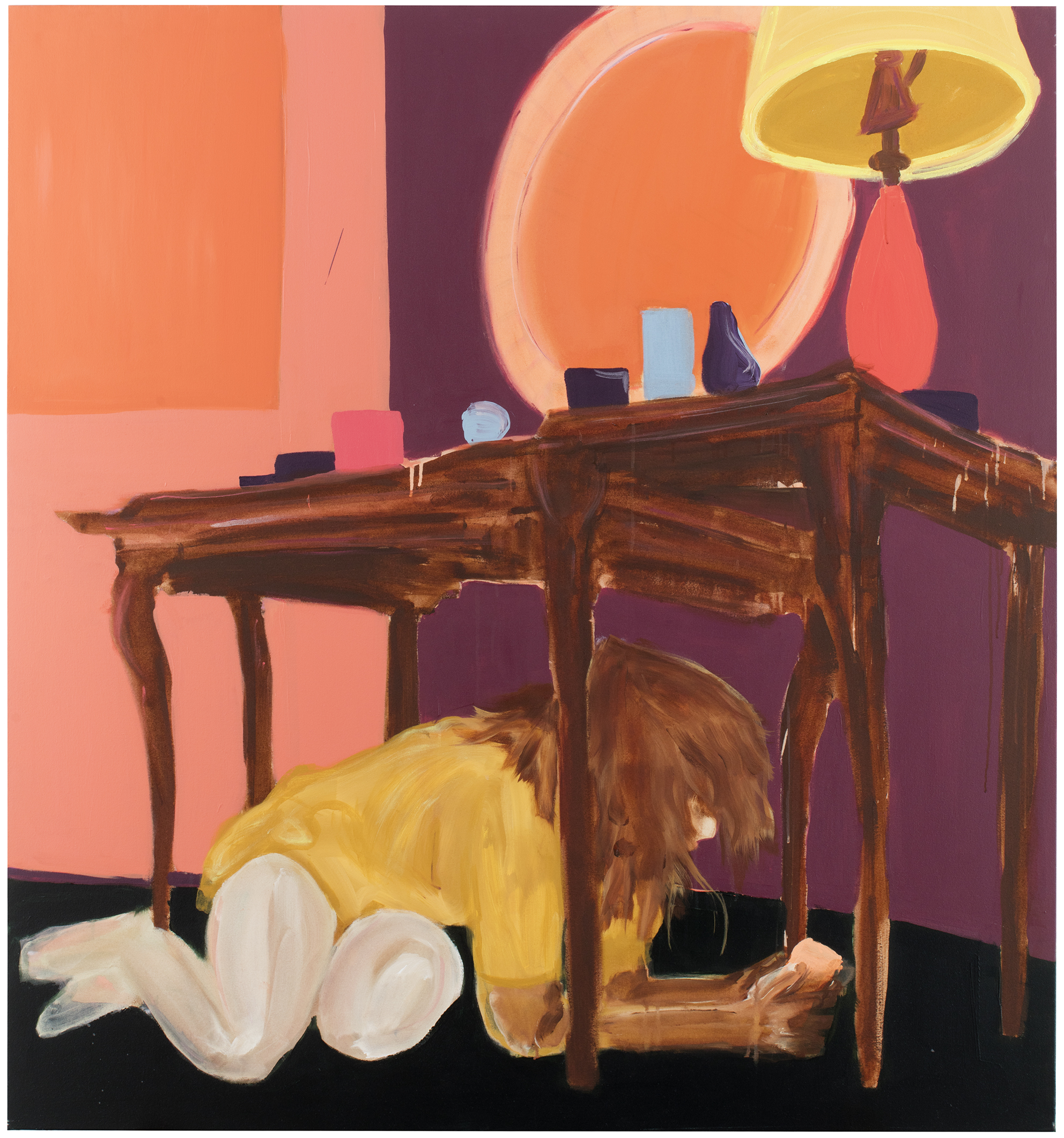 In her works, family members, loved ones, pets, art objects and household objects form surprising spatial compositions with each other. The moments, or situations, in the works resemble compositions captured on camera that are later depicted on canvas in the artist's studio. Mäkilä carefully plans her paintings in advance but also leaves room for surprises and chance - the painting has room to become an event in its own way, through the means of painting. Mäkilä mainly uses colour-saturated oil colours with occasional use of more earthy oil tones.