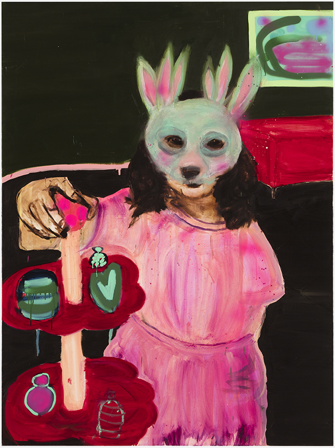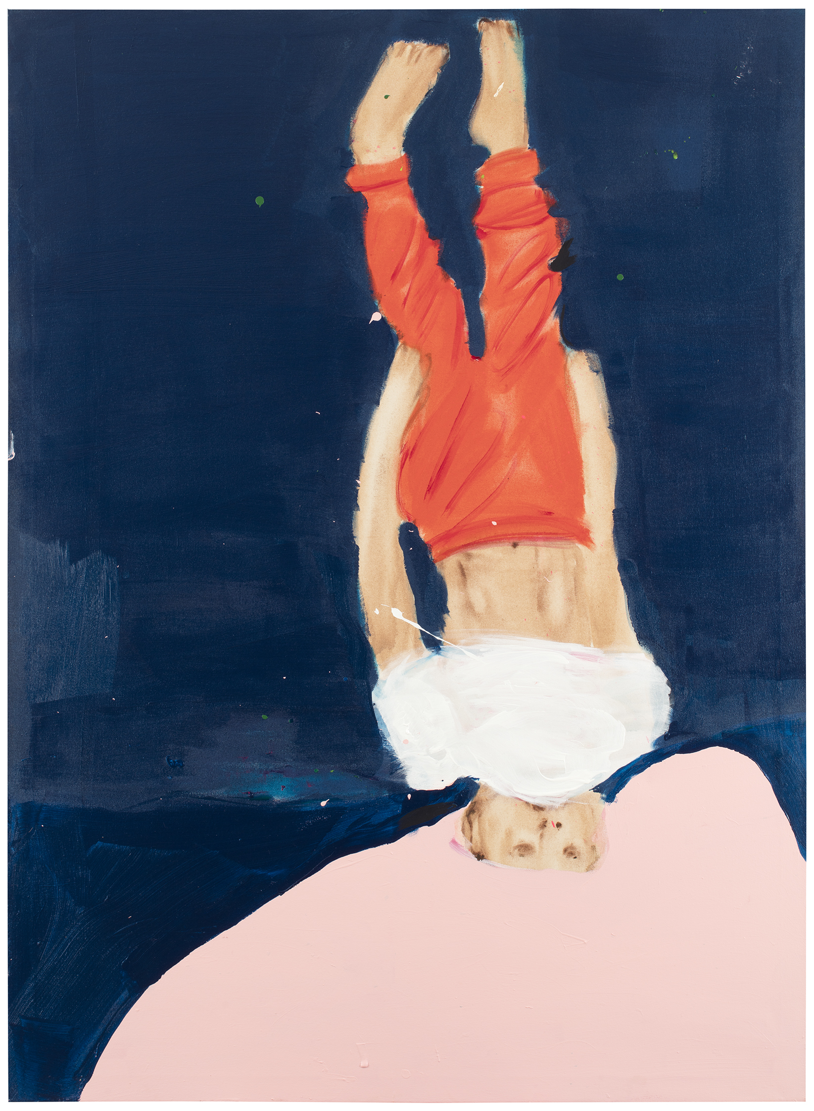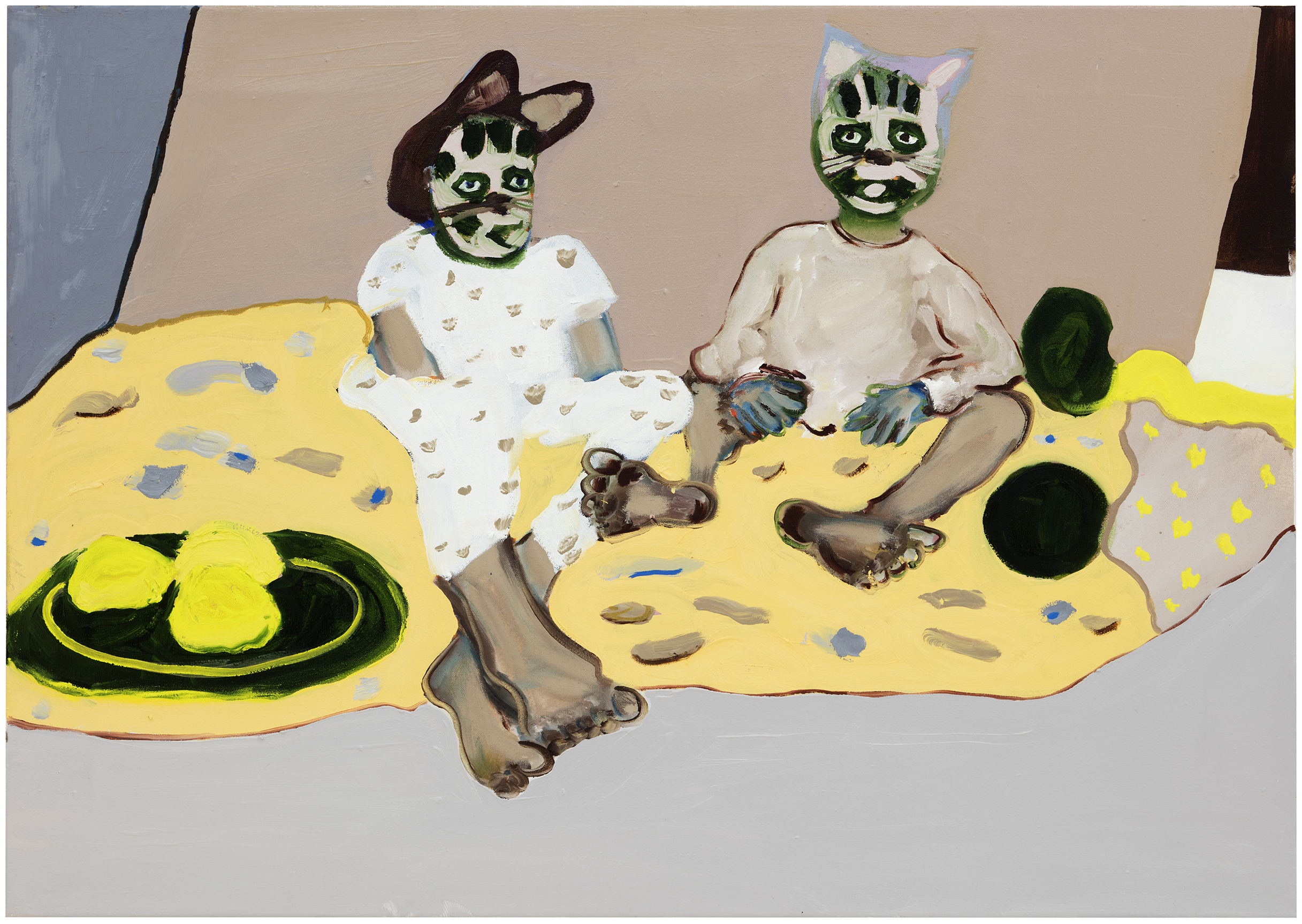In her works, family members, loved ones, pets, art objects and household objects form surprising spatial compositions with each other. The moments, or situations, in the works resemble compositions captured on camera that are later depicted on canvas in the artist's studio. Mäkilä carefully plans her paintings in advance but also leaves room for surprises and chance - the painting has room to become an event in its own way, through the means of painting. Mäkilä mainly uses colour-saturated oil colours with occasional use of more earthy oil tones.
