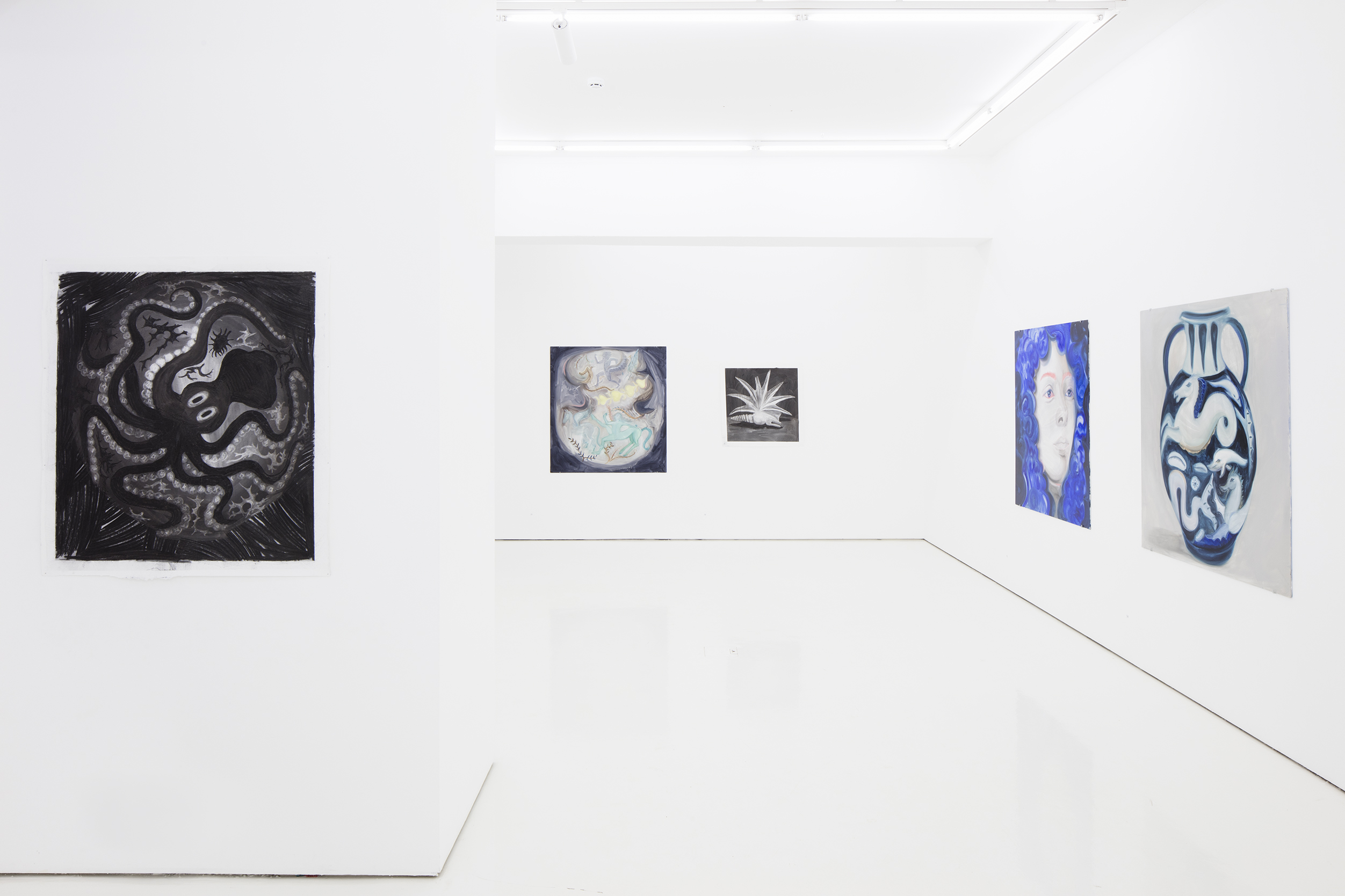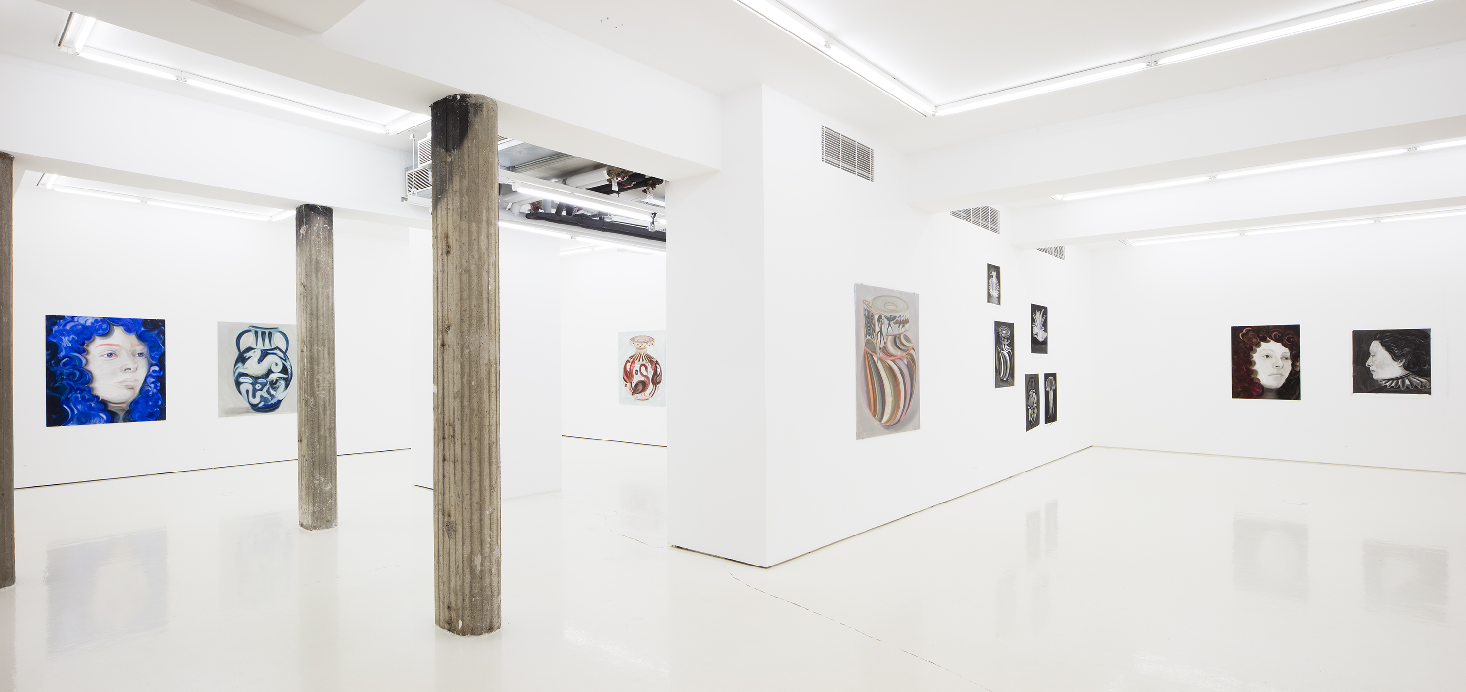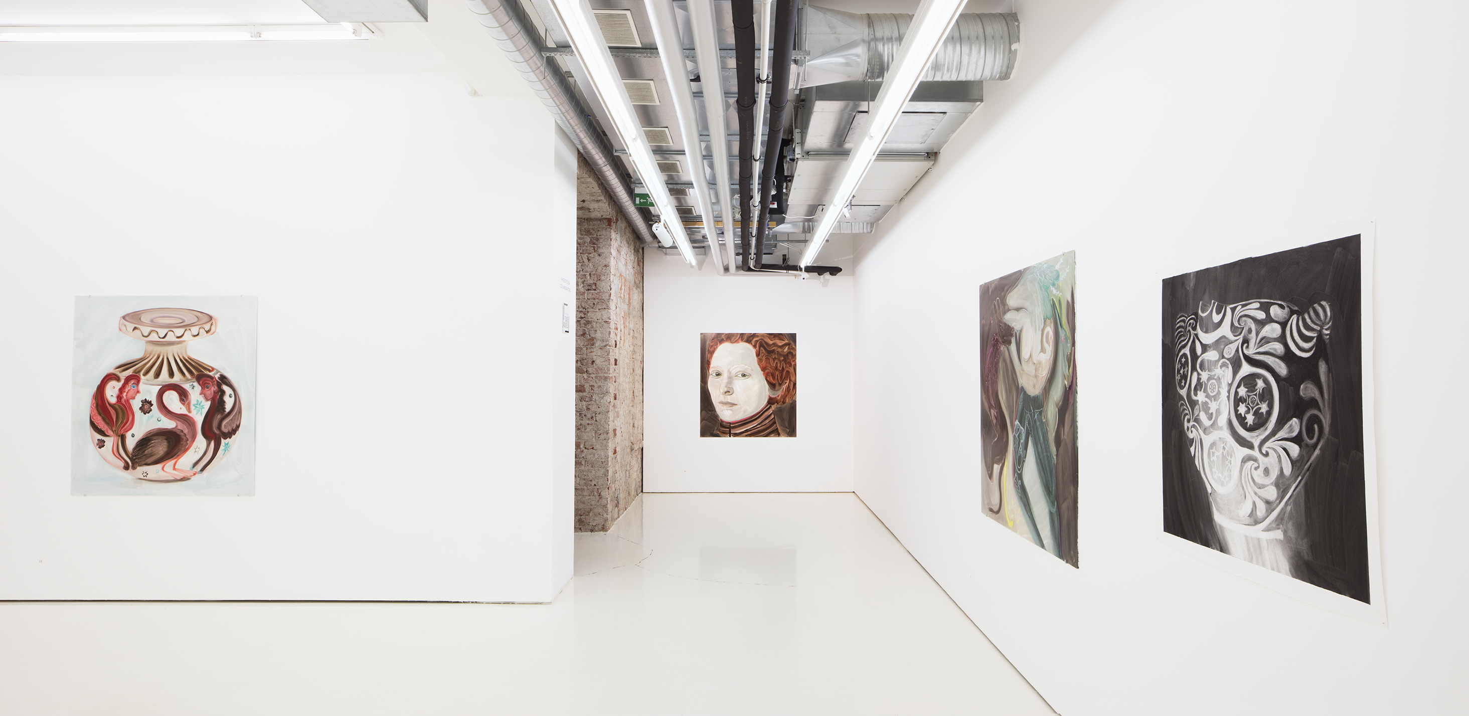 The timelessness of painting and the eternal nature of charcoal are reflected in literary references, which bring their own temporal perspective on the exhibition, on the history of women and on the modern world. Two novels – Margaret Cavendish’s The Description of a New World, Called The Blazing-World from 1666, which has been called the first sci-fi work, and Virginia Woolf’s Orlando from 1928 – and the materials that Heiska uses tie this body of works to her earlier production. Questions about humanity and its limits, especially in relation to other animals, are echoed in the states of flux and half-formed shapes in the depictions of unstable hybrids. With its themes Blazing World lives powerfully in our time, but past and future are also simultaneously present. The exhibition is like an imaginary collection of different found objects, imagined and existent – a relic of a utopia that is perhaps only just coming into being, or perhaps is already in the past.