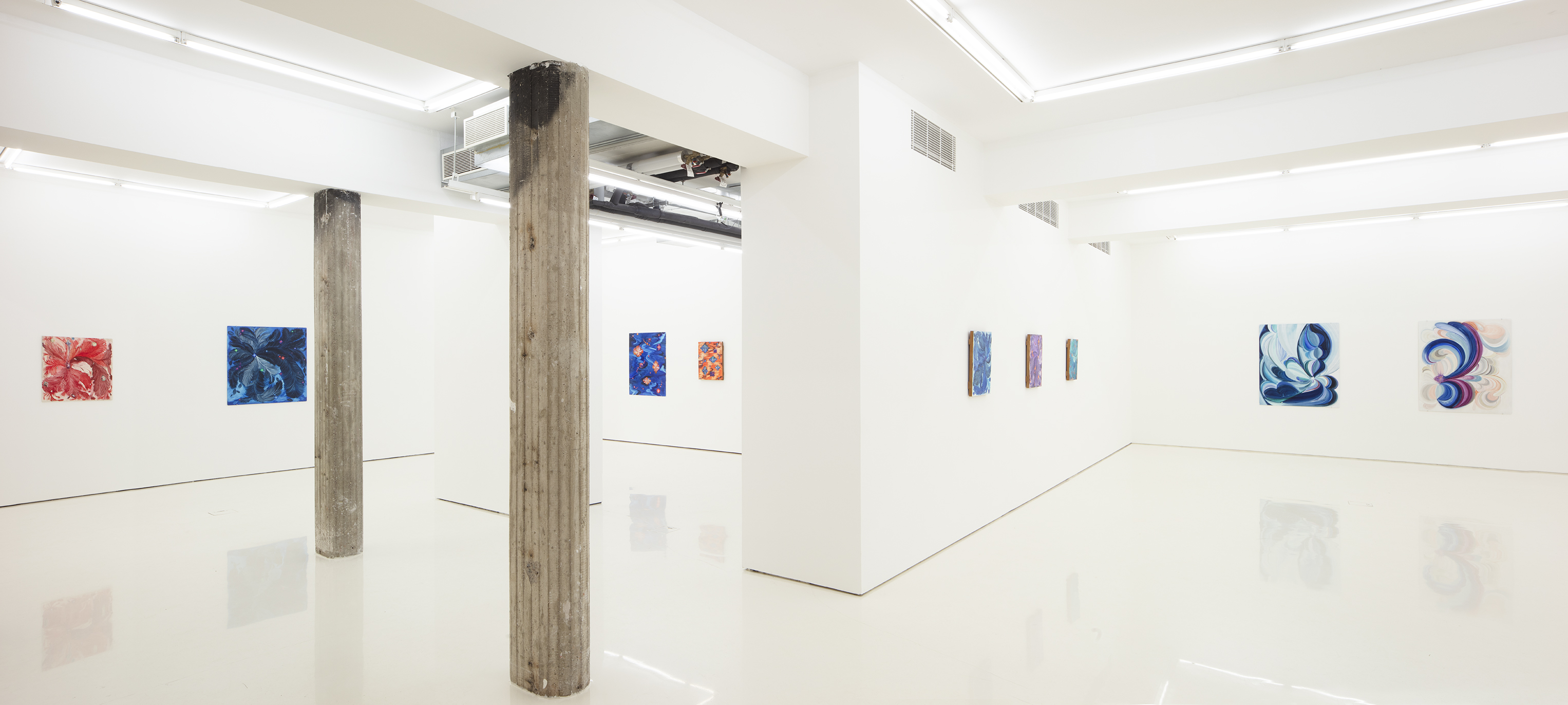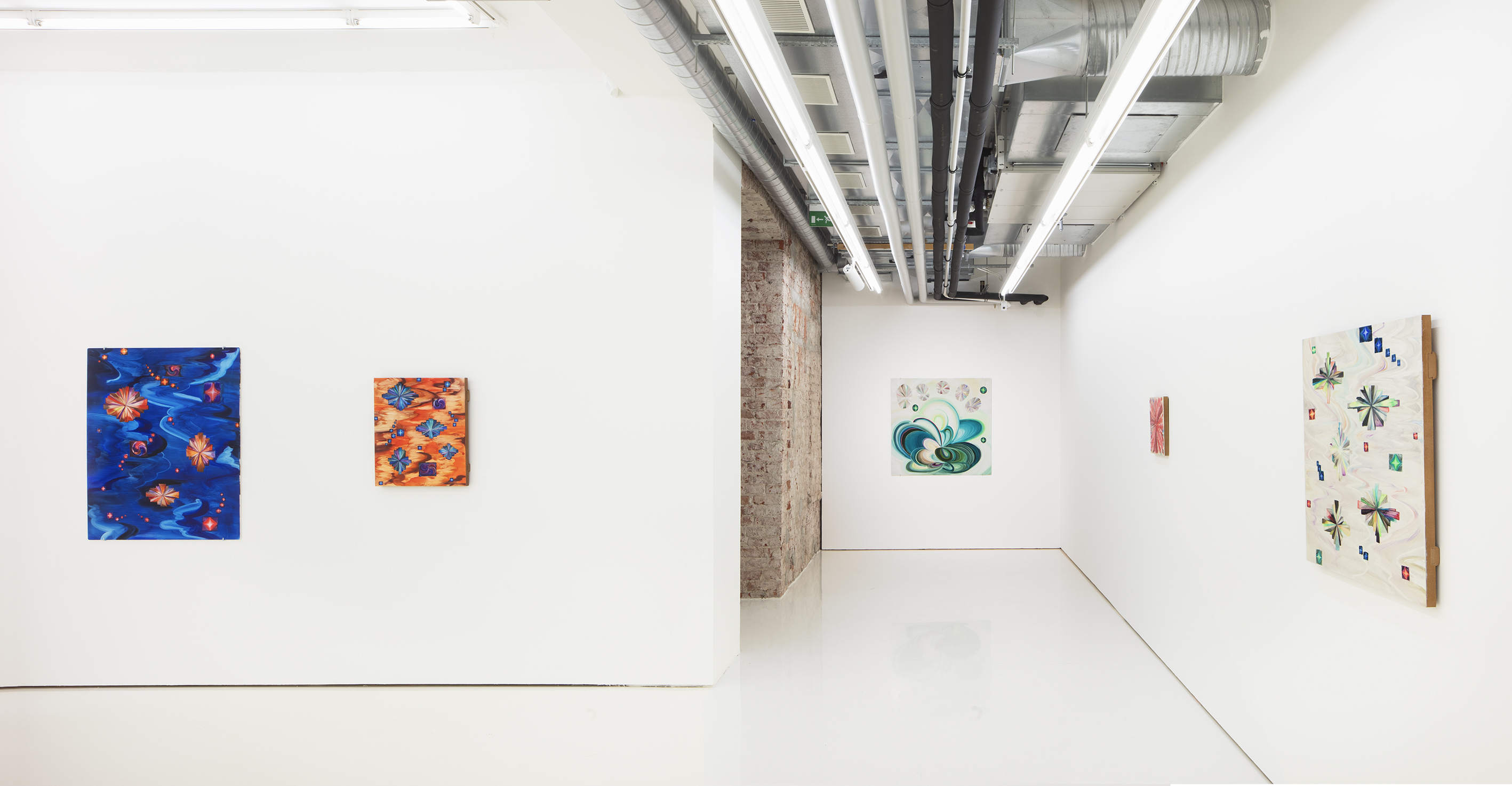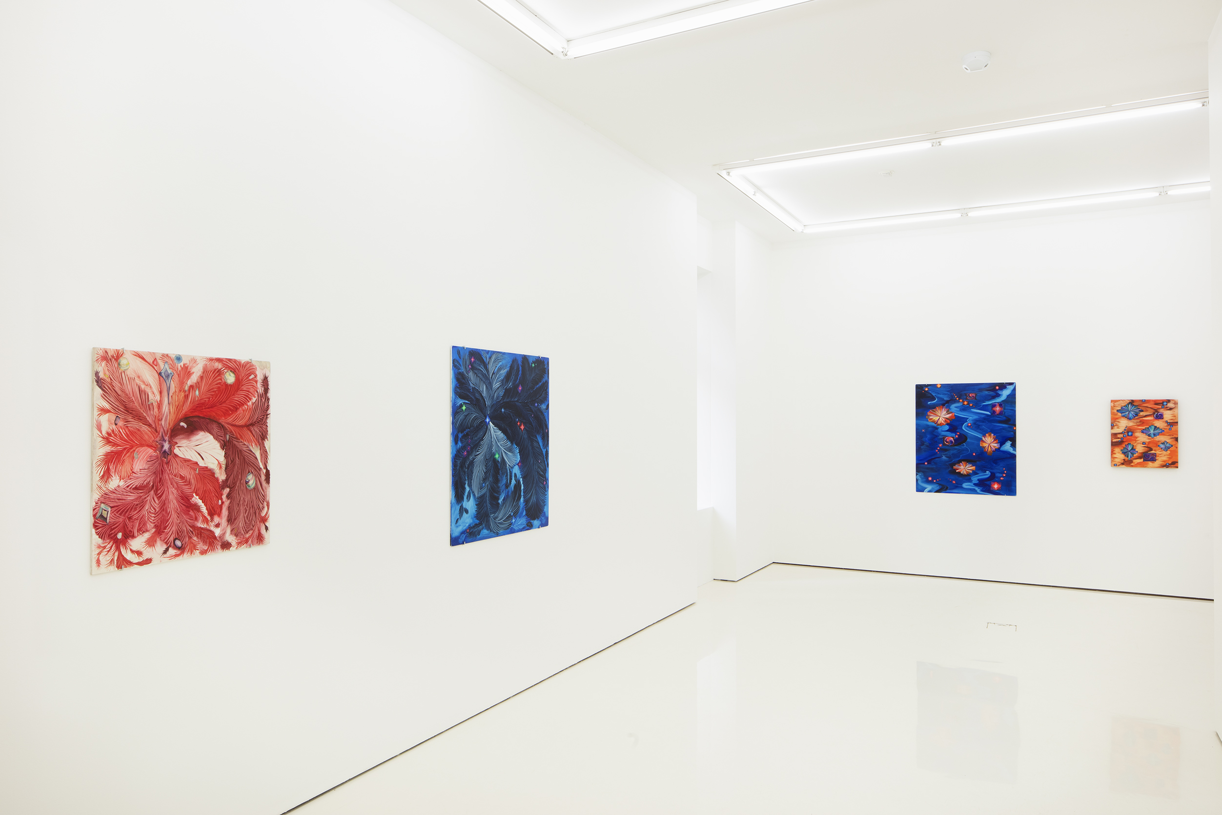 Hannaleena Heiska’s new solo exhibition Celestial Question Mark presents the versatile artist’s new, radiantly hued paintings. Her colours derive their intensity both from their juxtapositions and from her way of using the whiteness of the chalk ground as a source of light, producing a kind of inner glow in the painting. Recurring universal shapes such as arcs, twists, and swirls run through her work, combined with colours that glow like bright stars.