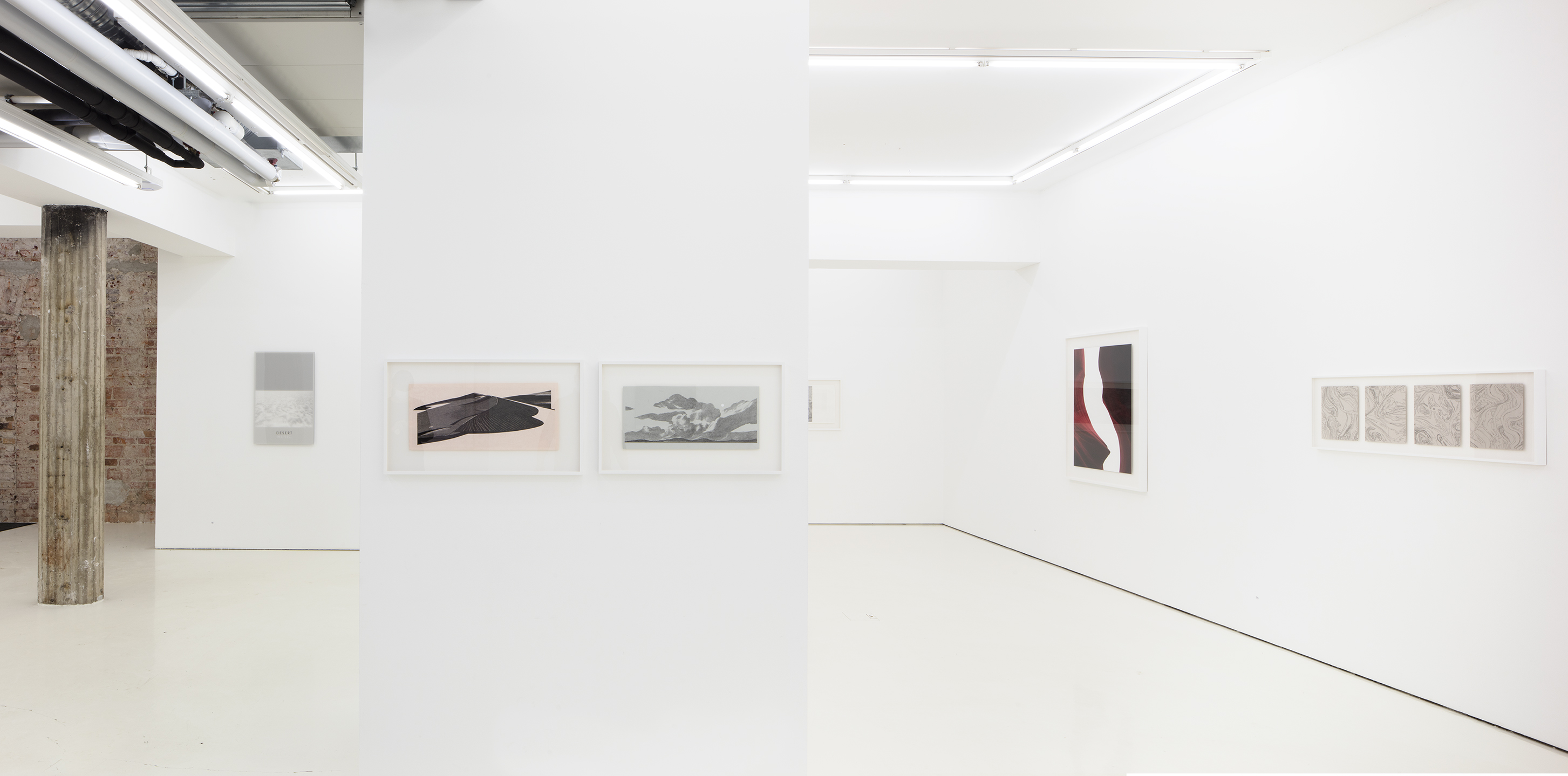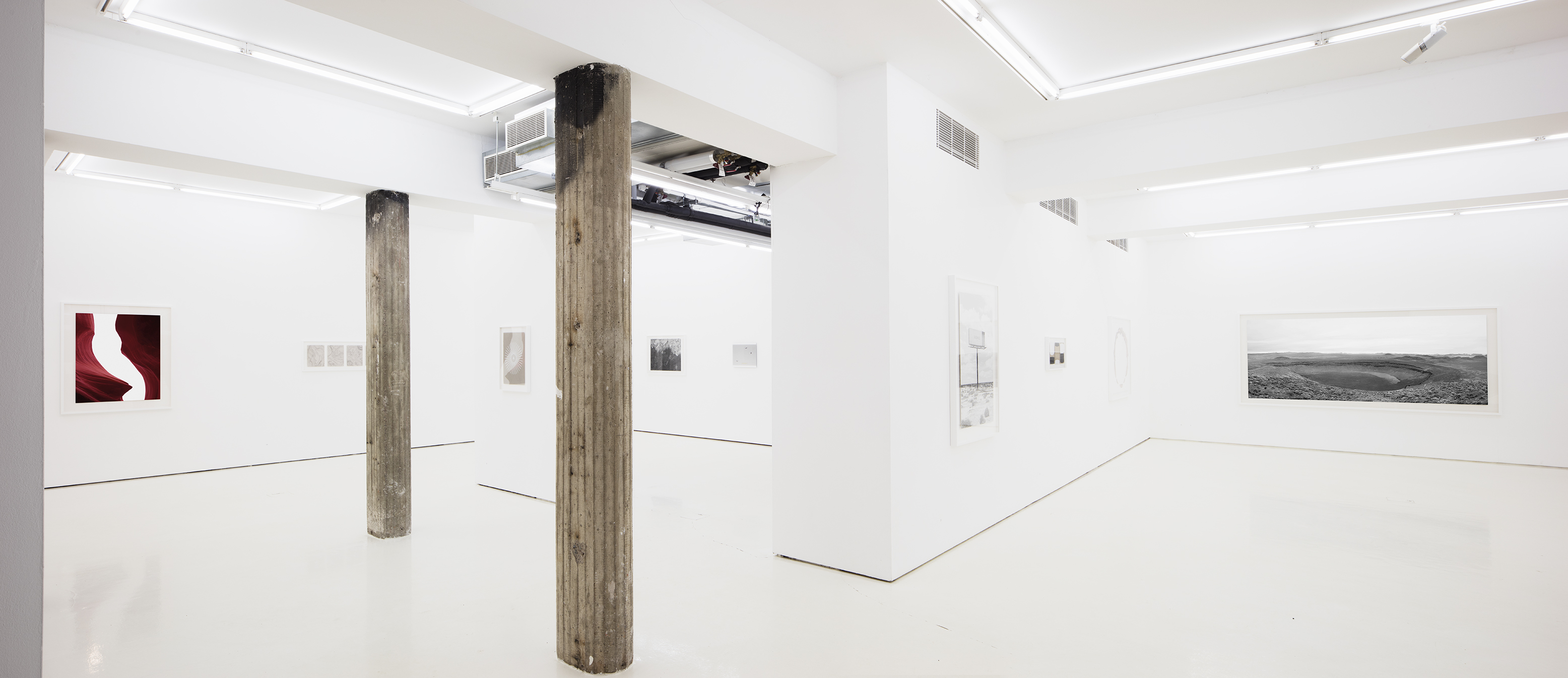 The exhibition consists of photographs, digitally manipulated images, drawings and works made using adhesive vinyl. Andersson is a versatile maker, and his exhibition is characterized not only by its mode of execution, but also by variations in size, texture and subject matter. There thus arises a dynamic and a rhythm that structure the viewing experience. The contrasts arise out of a juxtaposition of edgeless forms with sinuous and straight lines. The black-and-white photographs balance out the whole, giving it a feeling of documentarity alongside the images manipulated using totally digital technology. After a long break, colour, too, has crept back in: carmine red and pieces of paper in earthy colours disrupt the otherwise subdued black-and-white expression.