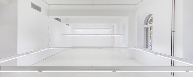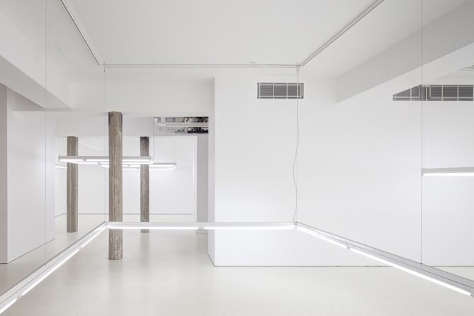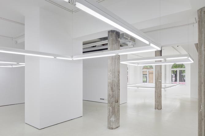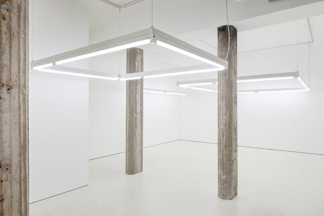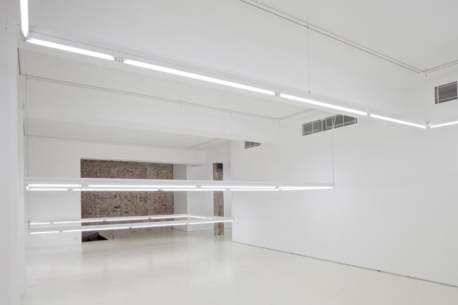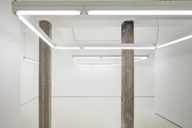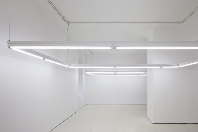 “The space is polymorphous and interesting in itself, so I finally decided not to bring anything else into the space, but to use the existing lights and the gallery space itself as the material for the work. For me an artwork comes about in an encounter, so what is important to me is trying to create as strong as possible a tension between the lights, the space and the viewer. In this work I am interested in how an apparently empty space can be made into a work, i.e. making use of the elements in the space as the circumstances allow.”