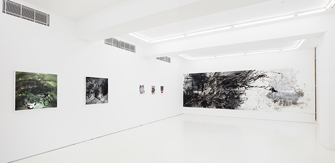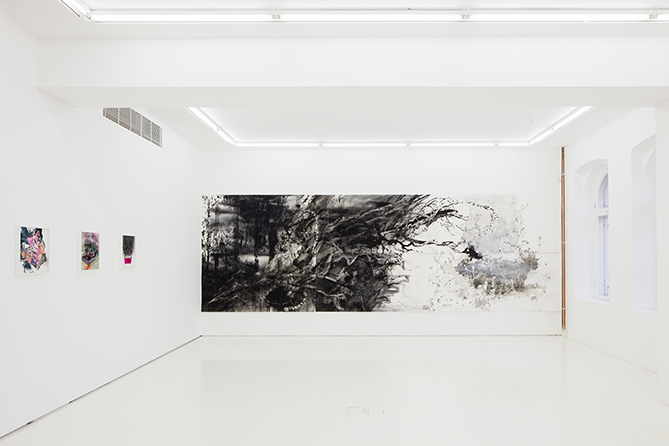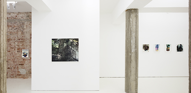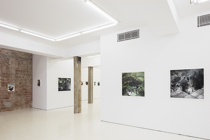 The other body of works in the exhibition depicts human attempts to turn a wilderness into a beautiful garden. In the large, black-and-white ink and watercolour paintings in the Korpi vastaan puutarha (Wilderness Versus Garden) series the forest and garden grow on top of and in between each other. Even if the garden has vanished from view, the flora – a midsummer rose (Rosa spinosissima ‘Plena’) or an apple tree planted in some strange places – have made a home for themselves in the midst of the forest. The biggest painting in the Kasvimaa (Vegetable Garden) series fills a whole wall, as if poking fun at the miniature worlds sitting in the safety of their frames in Leikkimetsä (Play Forest).