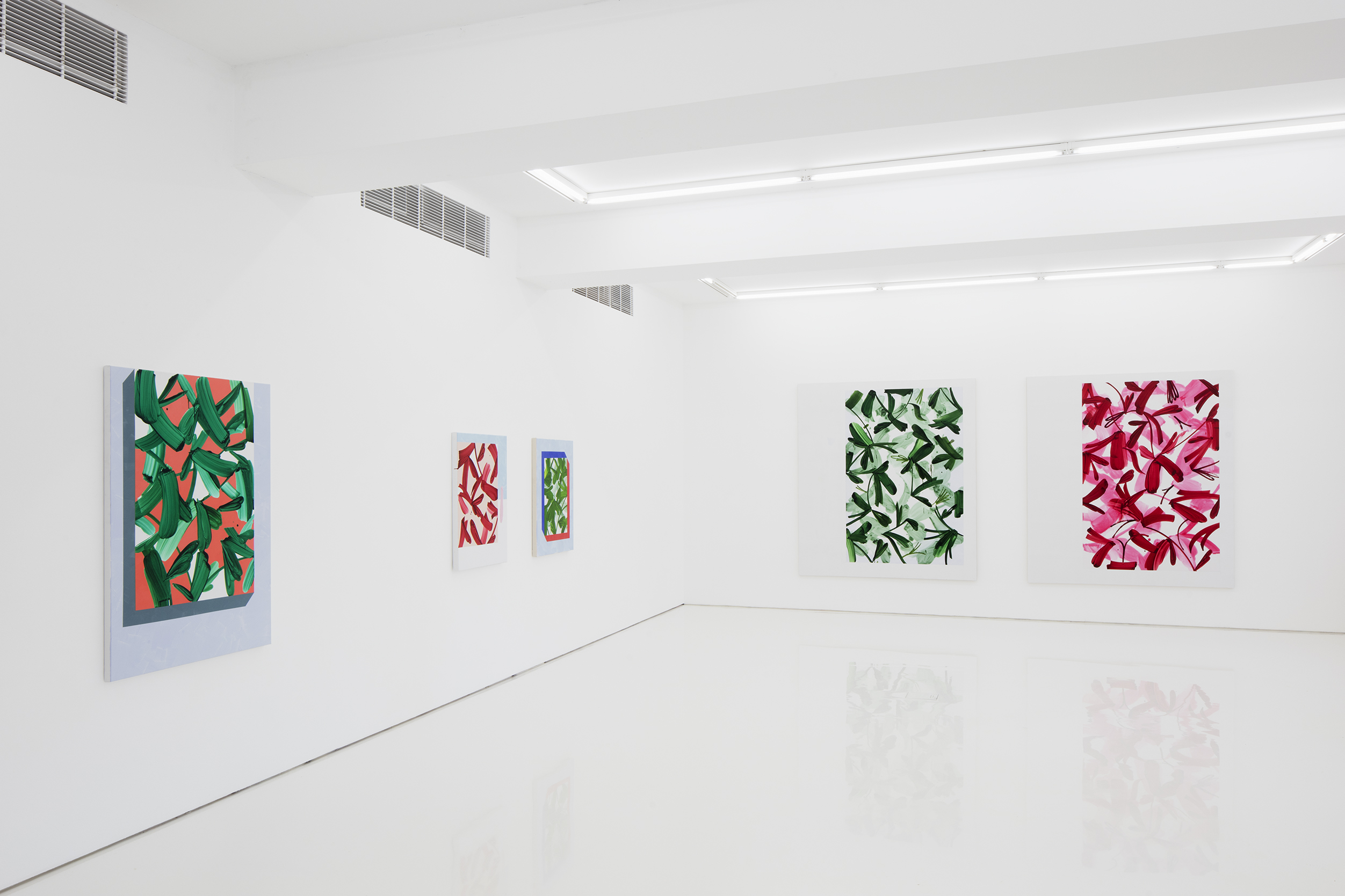 Alternating opaque and transparent layers of paint create an impression of movement through the surface and in depth. The densest strokes add to the impression of three-dimensionality. Some of the paintings are composed of colour contrasts or with a minimalist palette of only two or three colours. The exhibition includes a few works without the artist’s favourite colour, the symbol of growth and renewal, green. Red, the complementary colour to green, is gradually gaining ground.