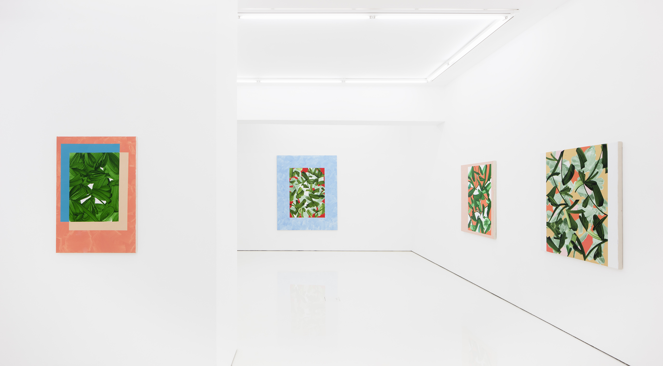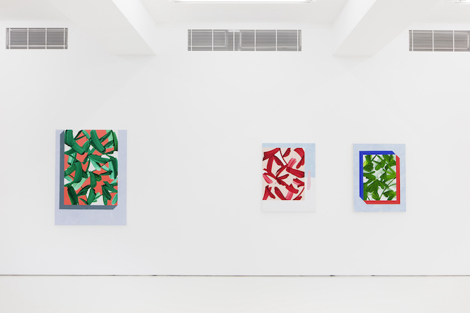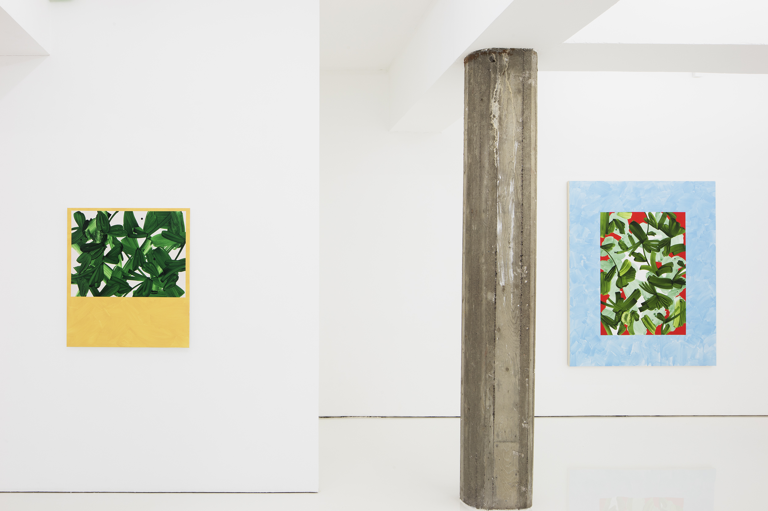 In one of the exhibition’s key works, Green Door, a rectangular painting is positioned at the right edge of the canvas, and the left side remains empty. A human-sized hole invites the viewer to approach, peek behind the foliage curtain and into the painting’s depths. Hautamäki focuses inside the image by detaching it from the background, at the same time shifting the emphasis from the middle to the edges. Hautamäki has approached the theme of spatiality with a new type of composition, creating a viewing experience and harmony that enable the viewers to immerse themselves in their subconsciousness.