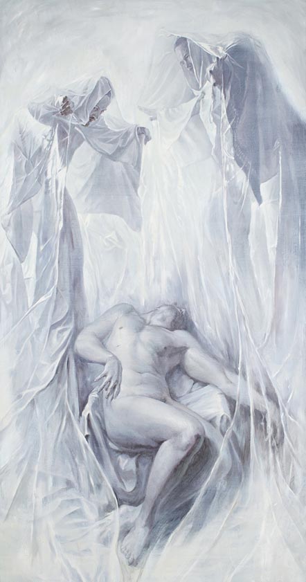 “The language of my paintings comes out of the traditions of Eastern icon art and Western church art, and also out of the imagery and visual narrative of both contemporary painting and the contemporary field of comics. My imagery deals with the healing character of suffering, the human being’s fight and struggle within the self and its contradictions. I think of my art as being theological contemporary art, as a space in the painting process for contemplative prayer, painting as a part of spirituality.”
