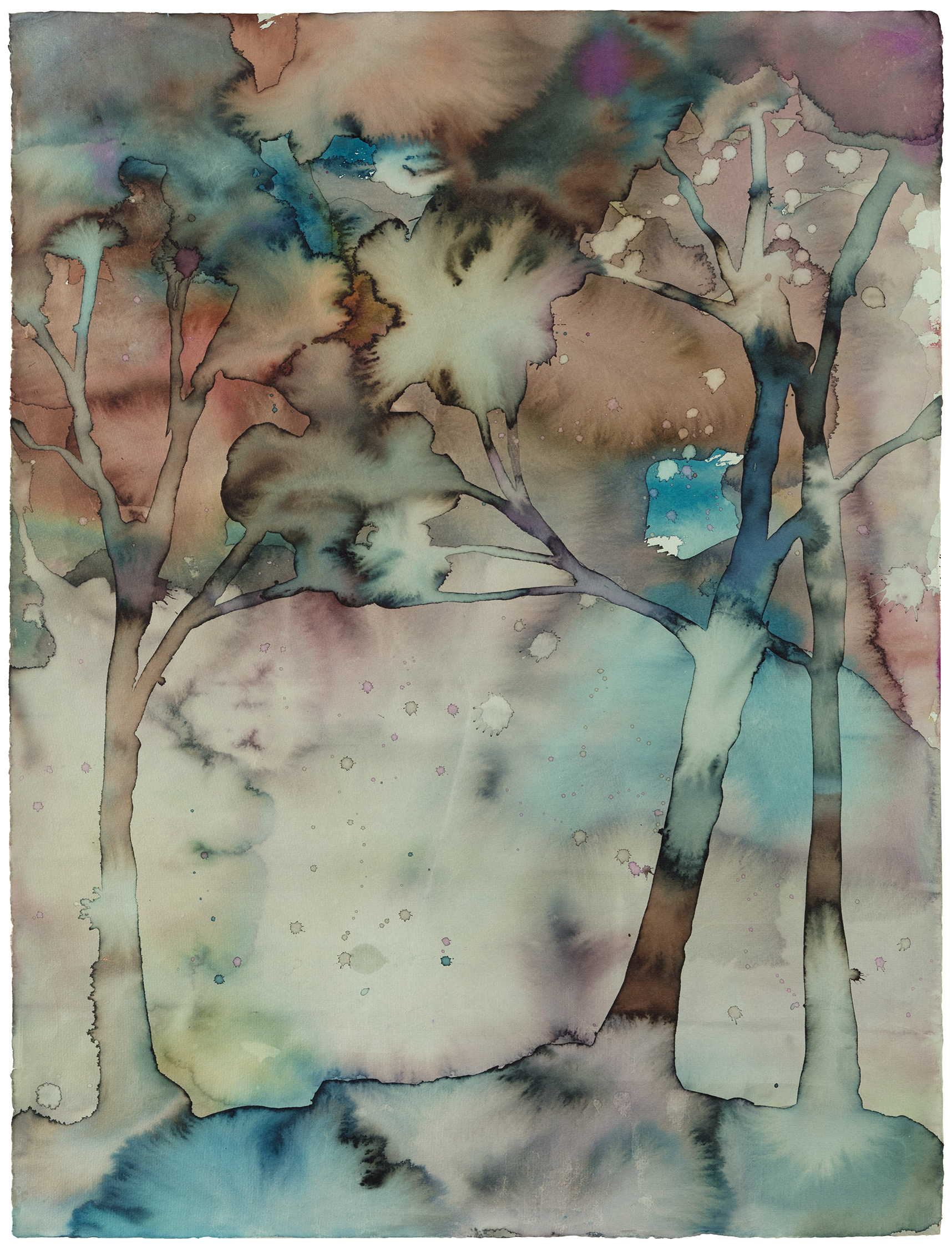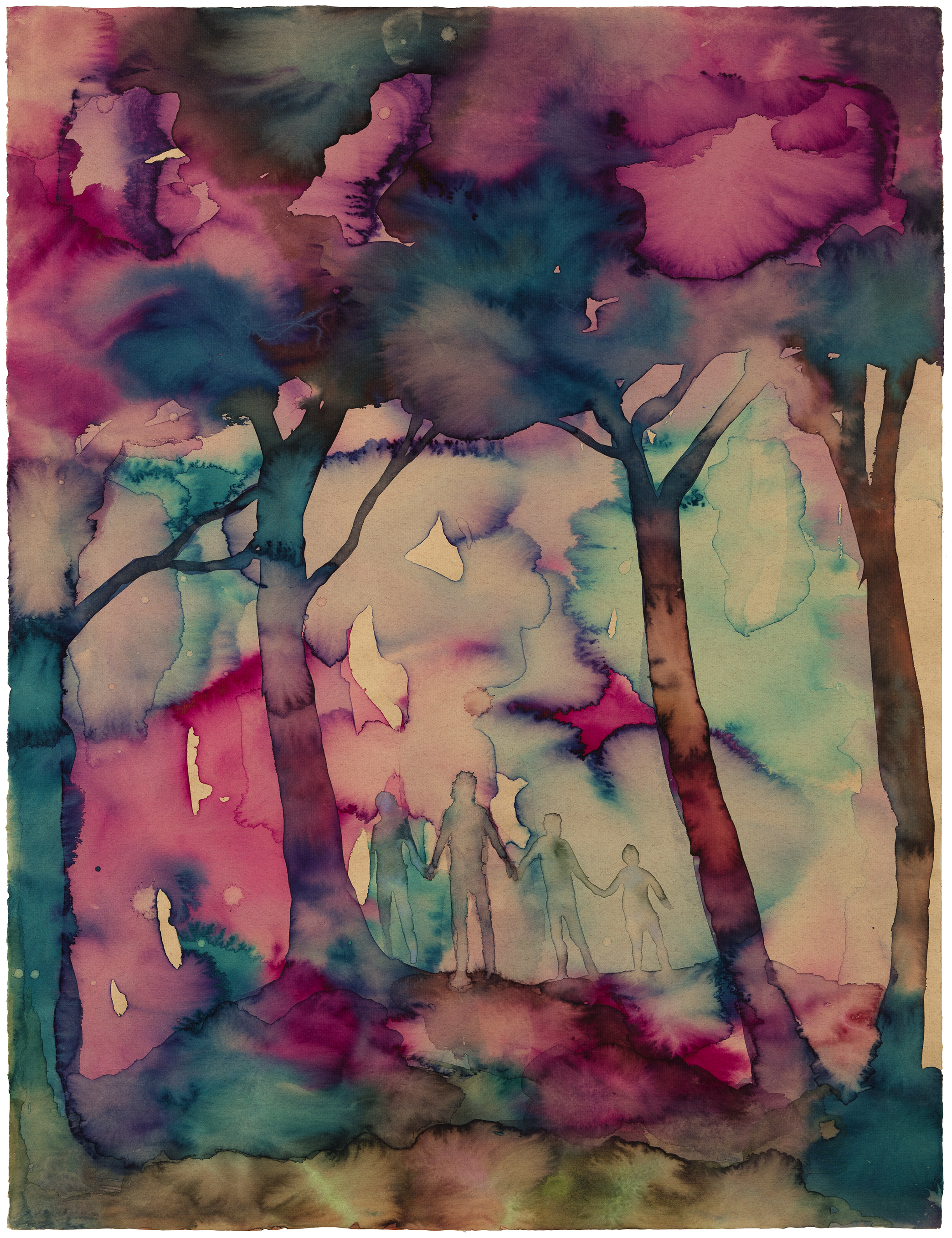 Central part of the exhibition are Salmenkivi’s ink paintings. In the hazy forests of the organic Wald series, characters are climbing trees and the fine-tuned moods are rooted in an interest in the forest. Ink and watercolour technique has enabled spontaneity and has brought an element of surprise to the painting process.