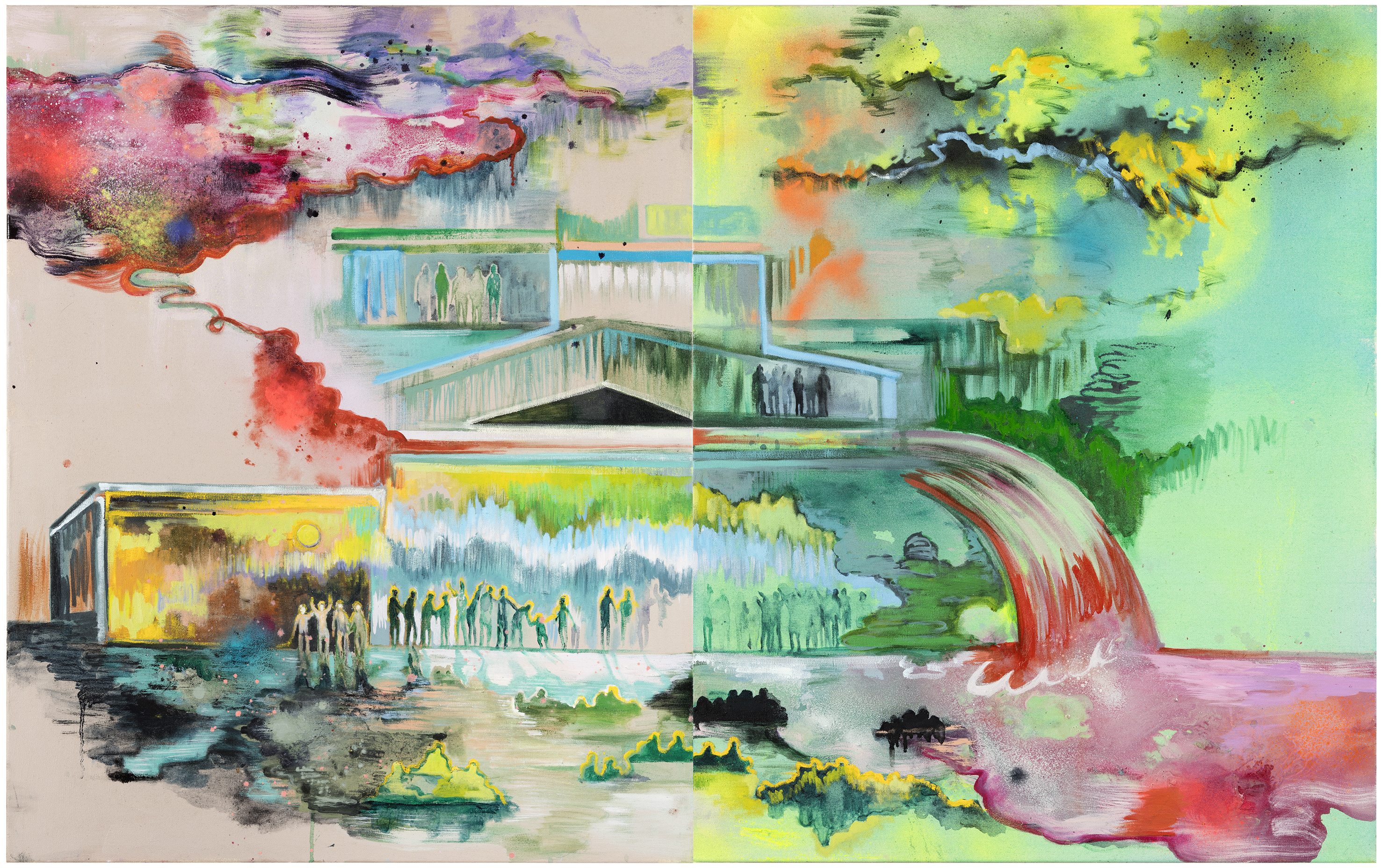 Architecture gets room in the production of Salmenkivi, which has been inspired by urban and fantasy-like moments. Different, and strange to each other, places and cultures meet and the characters in the scenes bring the paintings intensive feeling of presence. Starting point has been simultaneously familiar and unfamiliar architectural subjects and places, which recede from their origin in the paintings. Frank Lloyd Wright’s famous Fallingwater building has inspired a painting carrying the same name and in which a structure of more irregular cots meander.