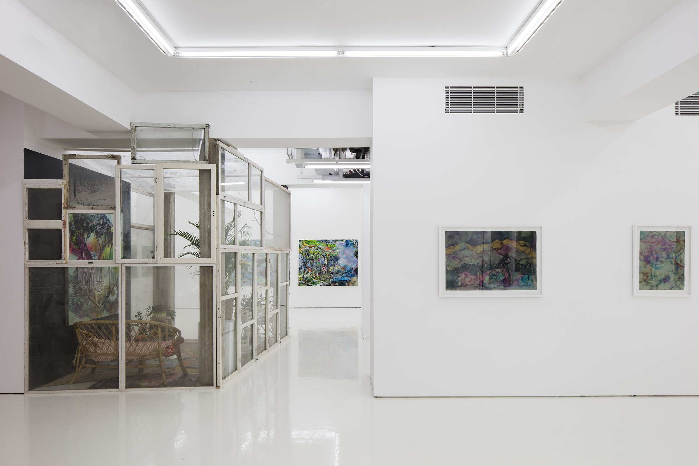 A painting’s relationship to space has always interested Salmenkivi. The starting point of the installation in Happy Garden exhibition is a greenhouse or a space, where we protect something. Spatial work brings tones that connect to the paintings’ charged scenes and Chinese decorativeness.