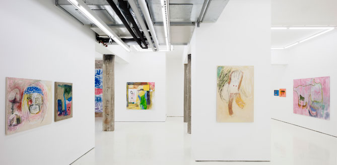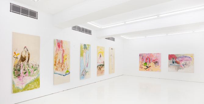 “A lot of the works start with my priming a canvas, I mix things together, I draw and apply colours, and then it takes a while before I myself know what I am doing.”