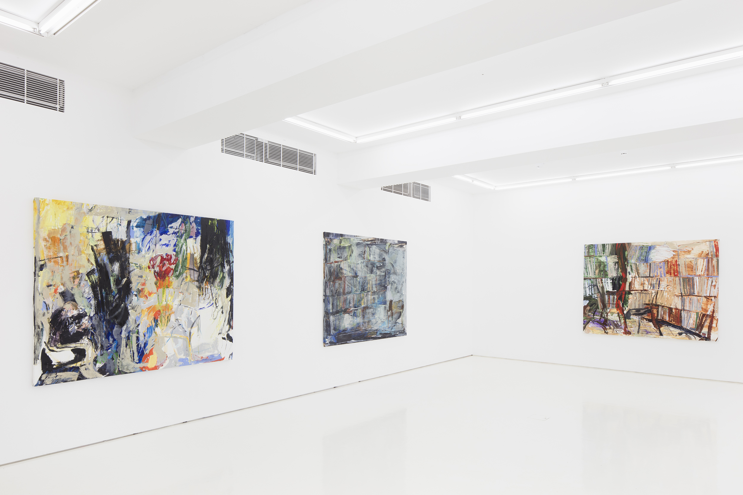 Anna Retulainen’s latest exhibition is called Encounters (Kohtaamisia). Her new series of works consists of ten paintings of equal size (160x200), which initially appear to be more or less abstract, but on closer inspection reveal themselves to be figurative works depicting various spaces. Knowing the artist’s way of working, it is evident that these spatial encounters have occurred between her and her models. The external appearance of the paintings varies, since, at times, their surface is as if covered by a monochrome gauze and, at times, the view has become clear, when the mood and content of the space seem to be revealed.
