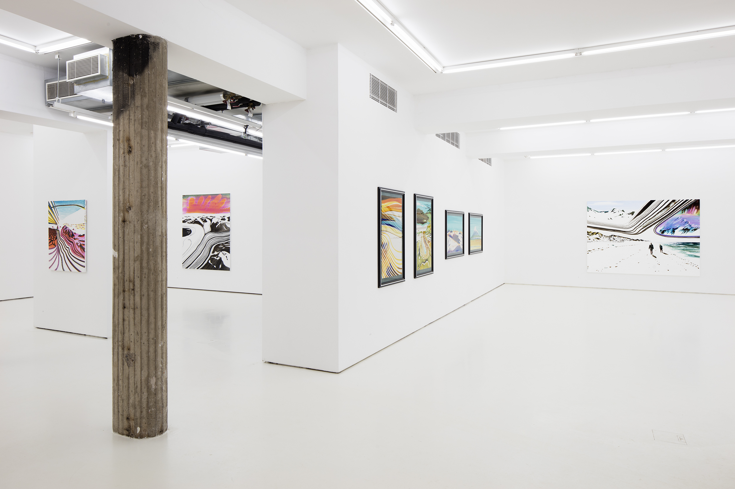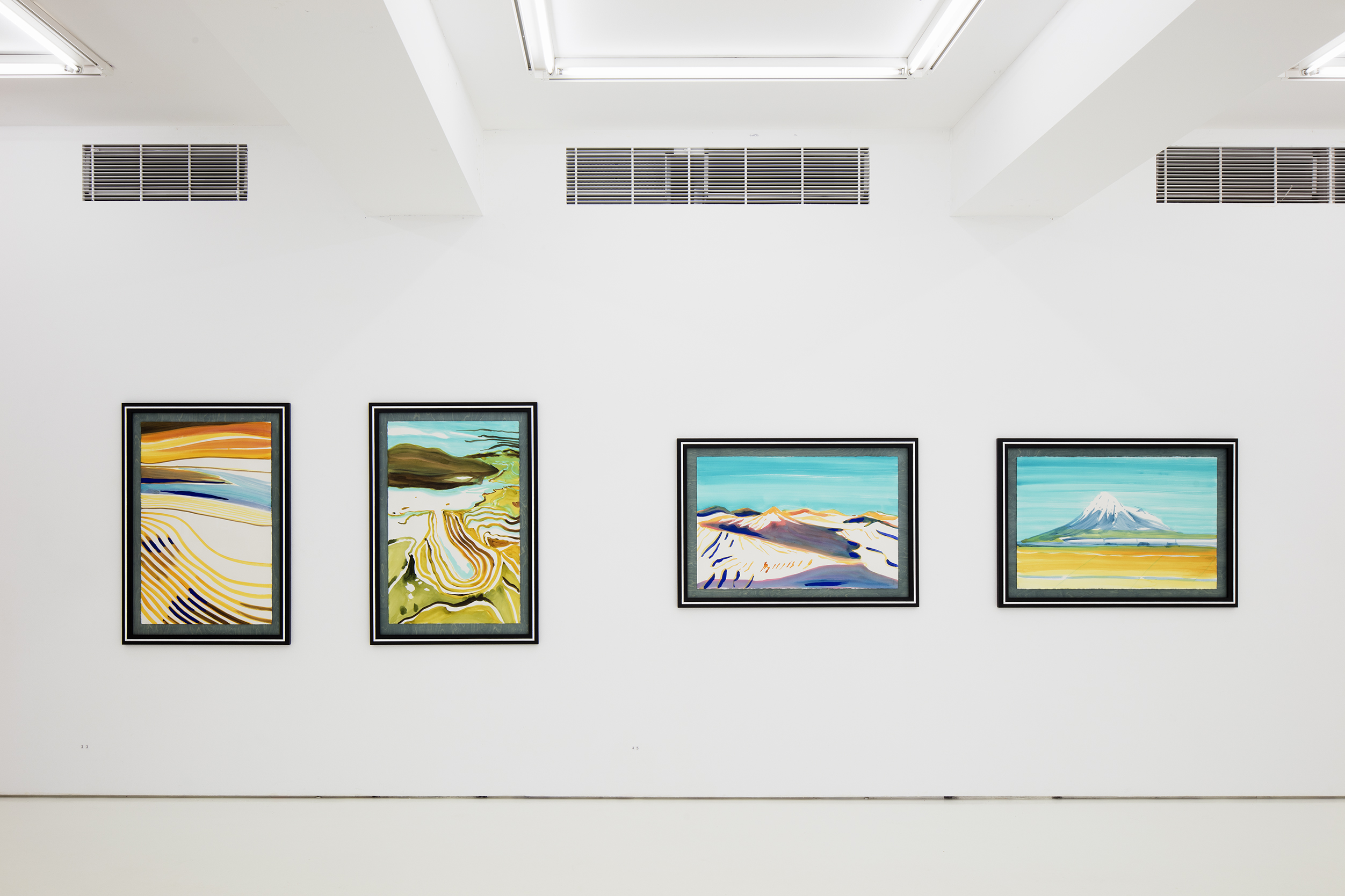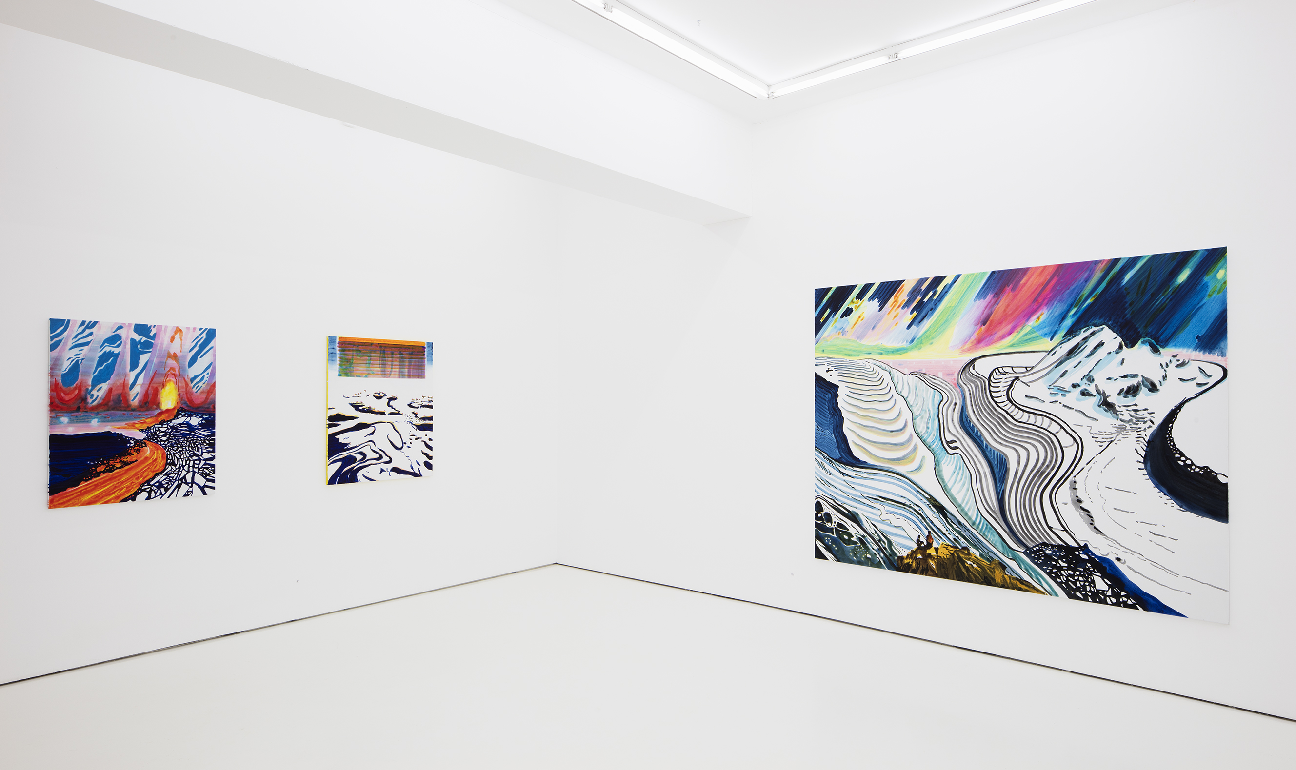 In his February show at Helsinki Contemporary Kørner will focus on a series of new paintings in which he has explored light and liquid elements. Kørner finds it intriguing that light and water behave equally in openings, and bend if they have the opportunity. In the new paintings he explores water especially in its frozen in-between form, as ice and glaciers to liquid and back again. Change, the transformation of an element is at the core of his studies. The paintings of glaciers are not all white, as one could assume, but bright and colourful. What in reality would be cold as ice, is in Kørner’s hands burning red. The vistas and views in the paintings look like a fantasy but still seem to be from our world. They seem to speak simultaneously of the ice age and climate crisis: glaciers formed over thousands of years are now being melted away by human action.