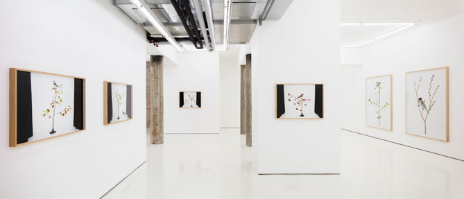 Sanna Kannisto’s photographs are linked to the tradition of staged photography and to the still life tradition in visual art. She constructs her pictures carefully within a studio. The birds appear to be perfectly positioned on their branches, the lighting is deliberate, and the arrangement of the details in each picture, such as the plants, branches and supports, has been carefully considered. The birds have a sculptural aspect in the studio, where their motion is suspended against a white background or where they perch as one element of the artist’s still life arrangement. The pictures do not, however, attempt to mimic the natural, rather, the process has been left visible: we can see cut marks in the plants; they have been combined with cable ties; branches are left to float in emptiness; and parts of the studio structures itself may be visible. The birds’ movements and their own volition disrupt this planned quality and bring an element of chance into the pictures. The images are a mixture of theatrical display and the documentary nature of the photographs.