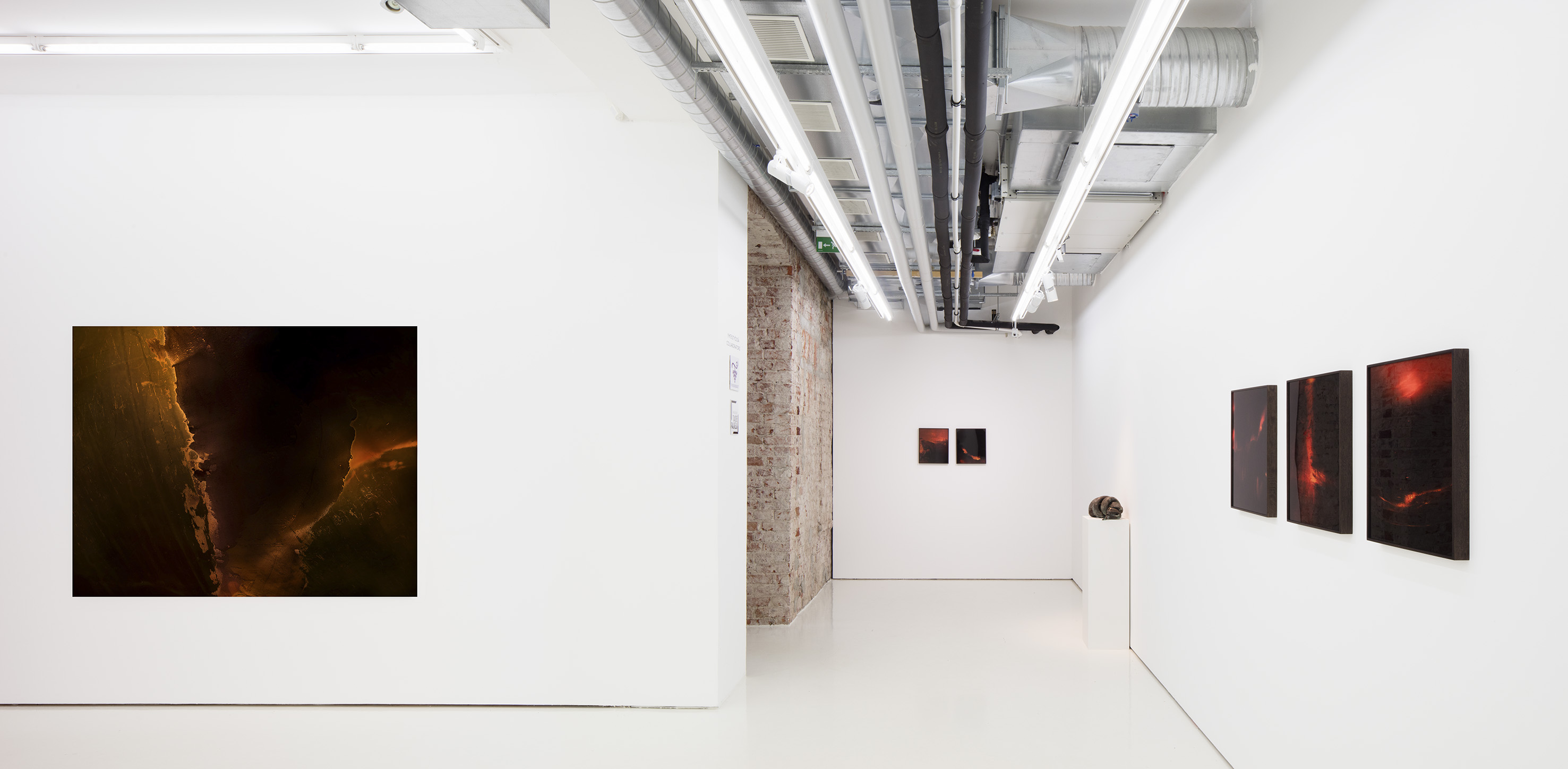 The artist has called the images maps – Maps of Essence. They are like nameless places, untouched by humankind, “no man’s lands” that glow in shades of red, urging us to check our relationship with energy and what it means to people. A central plotline is the observation that oil, seen as a positive material that transmits power, produces more waste and destruction than energy, inherently working against humanity.