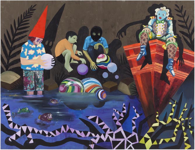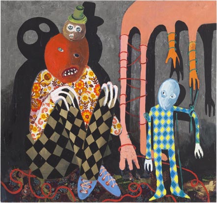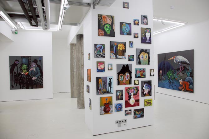 This is painting as a conscious continuation of the expressive mode, taking us on a tour de force via the German masters of the 1920s and 1930s, all the way to classical painters like Hieronymus Bosch and Diego Velasquez. It is always, constantly boiling over and freezing over. It is a process that definitely stays far, far away from the closing doors of neat and tidy harmony. This is where the weirdness of the boring everyday meets scary monsters and animal-like figures: they shake hands furiously and provide fabulous connotations of imaginary conflicts – and, let us not forget, caressing acts.