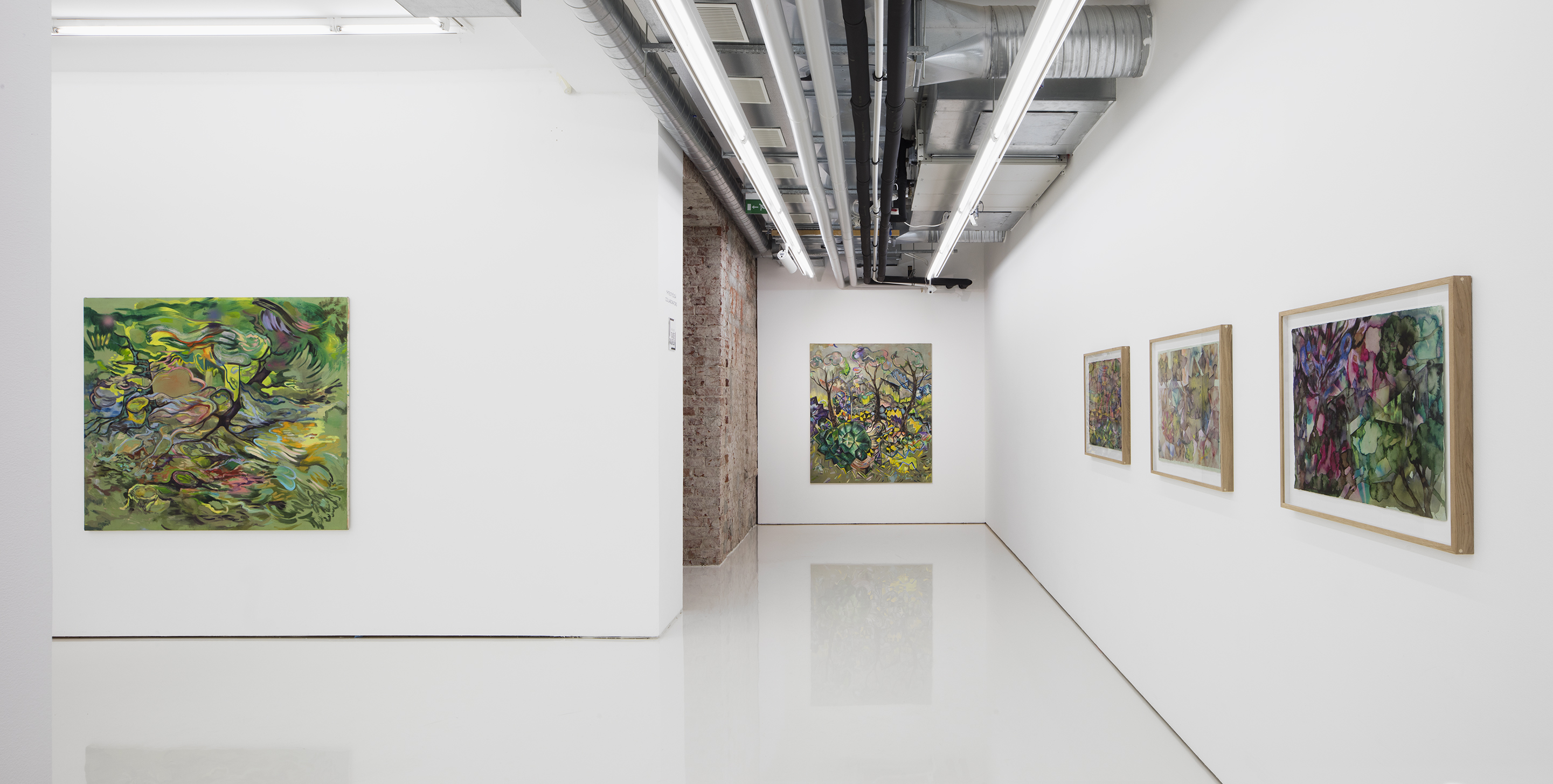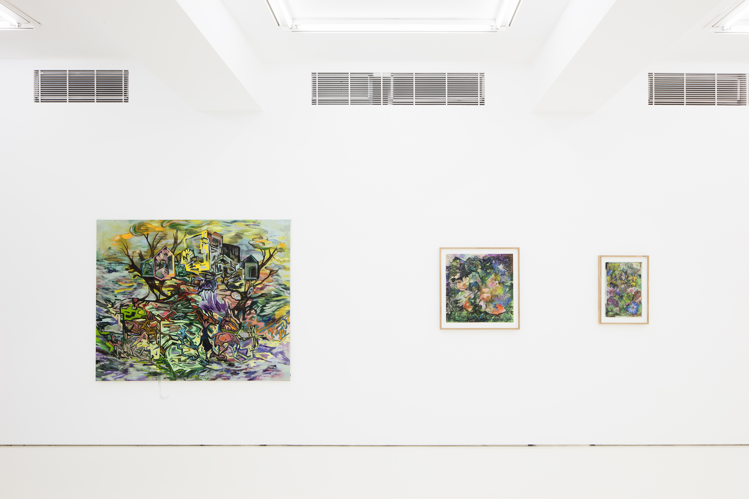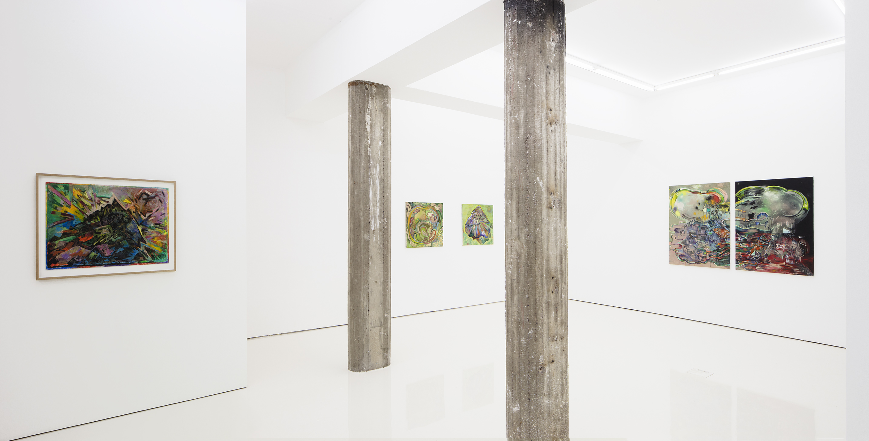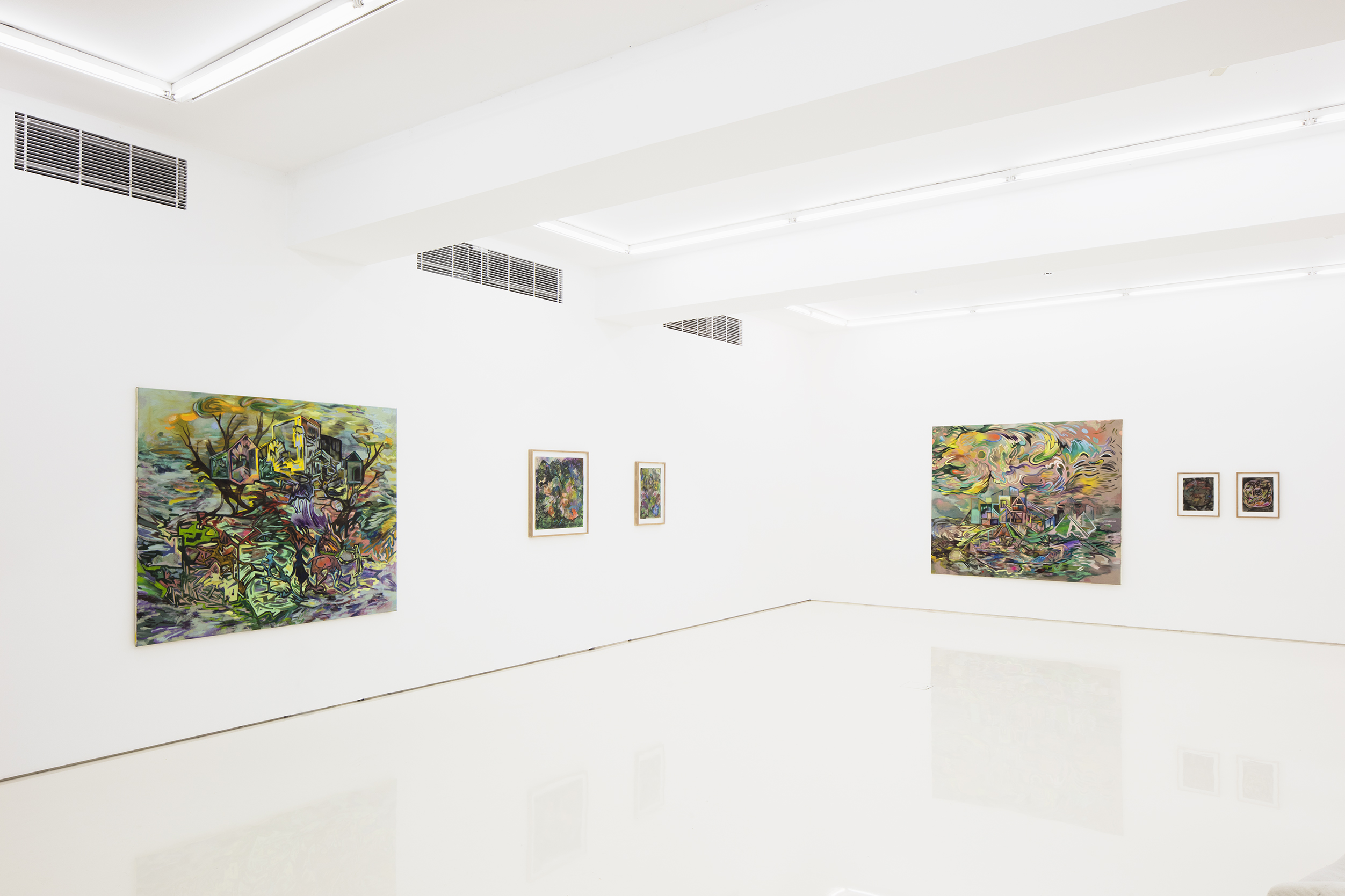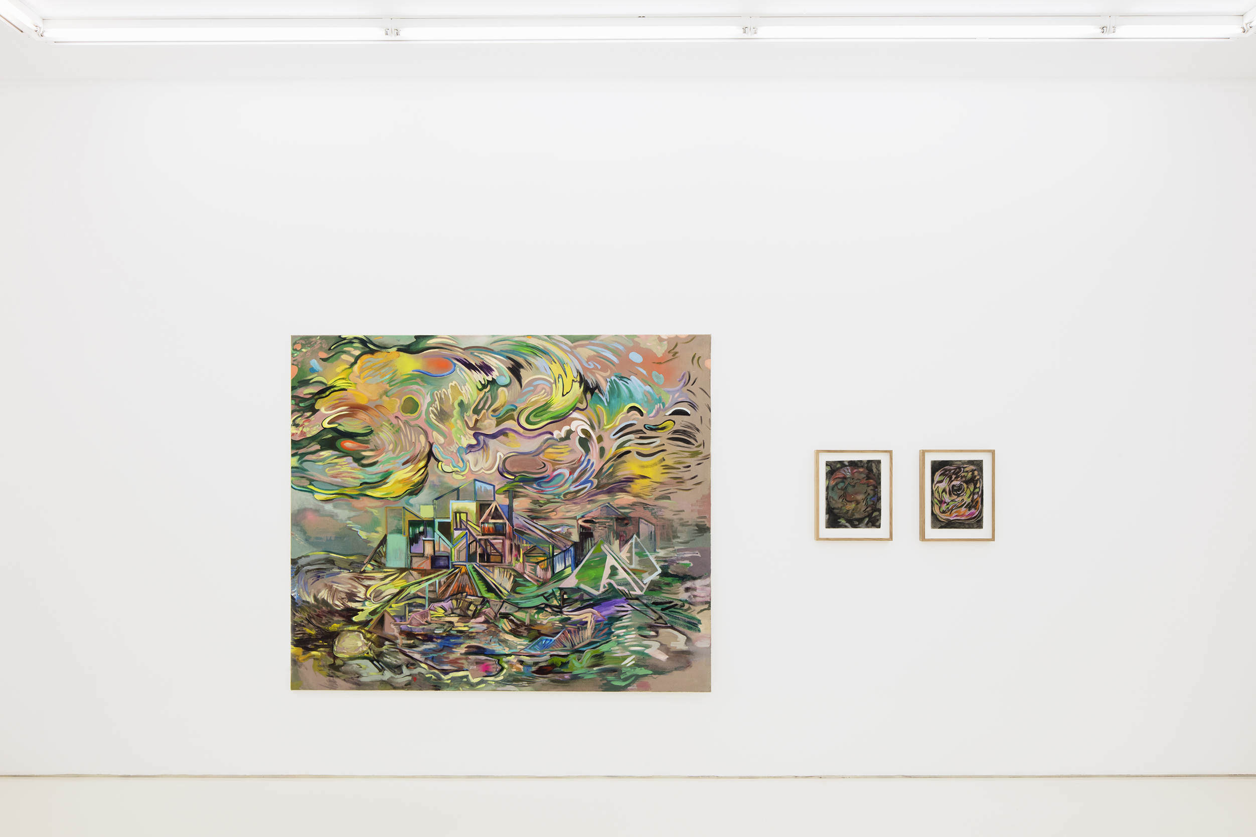 Alongside paintings on canvas, the exhibition features works on paper using charcoal, ink, spray paint, and chalk, inviting the viewer to take a closer look. Mountaintops and prismatically radiant forms emerge when scratched into oil pastel surfaces. The color palette is a blend of neutral tones and intensive hues characteristic of the artist. Painting serves as a map to another world, where natural forces surge, rivers flood, trees sway, and wind stirs the pools of color across the canvas.