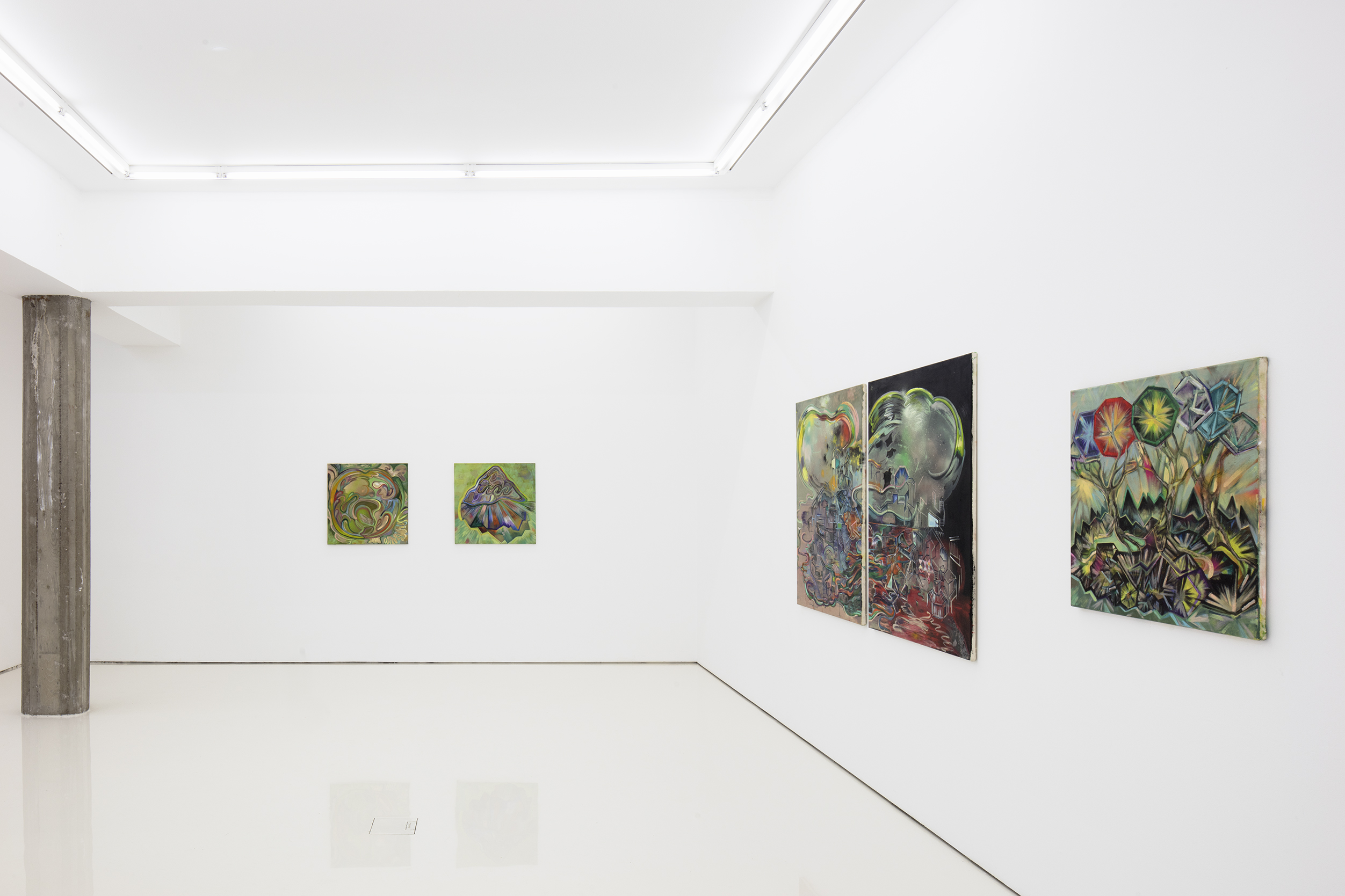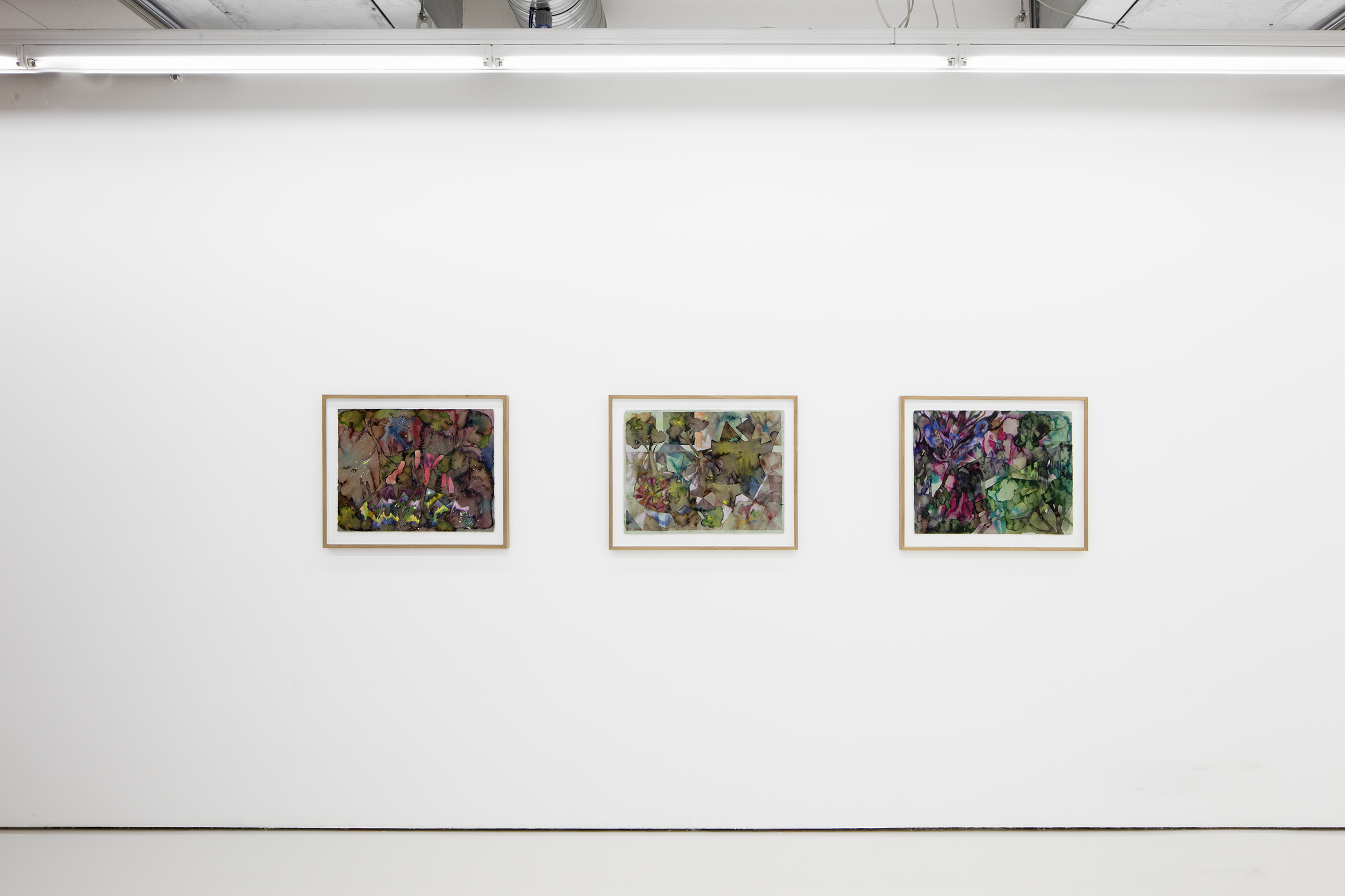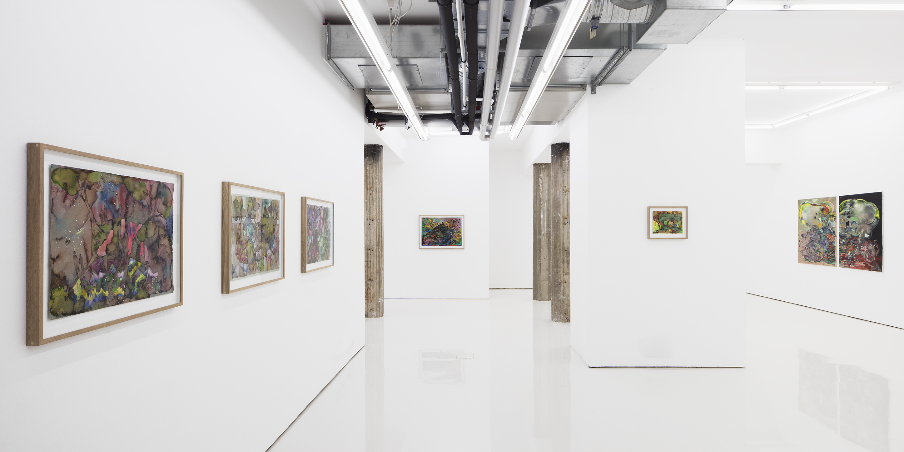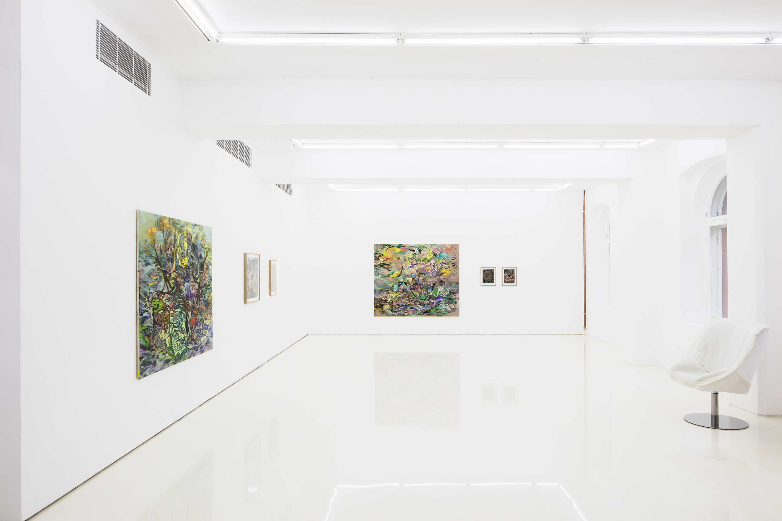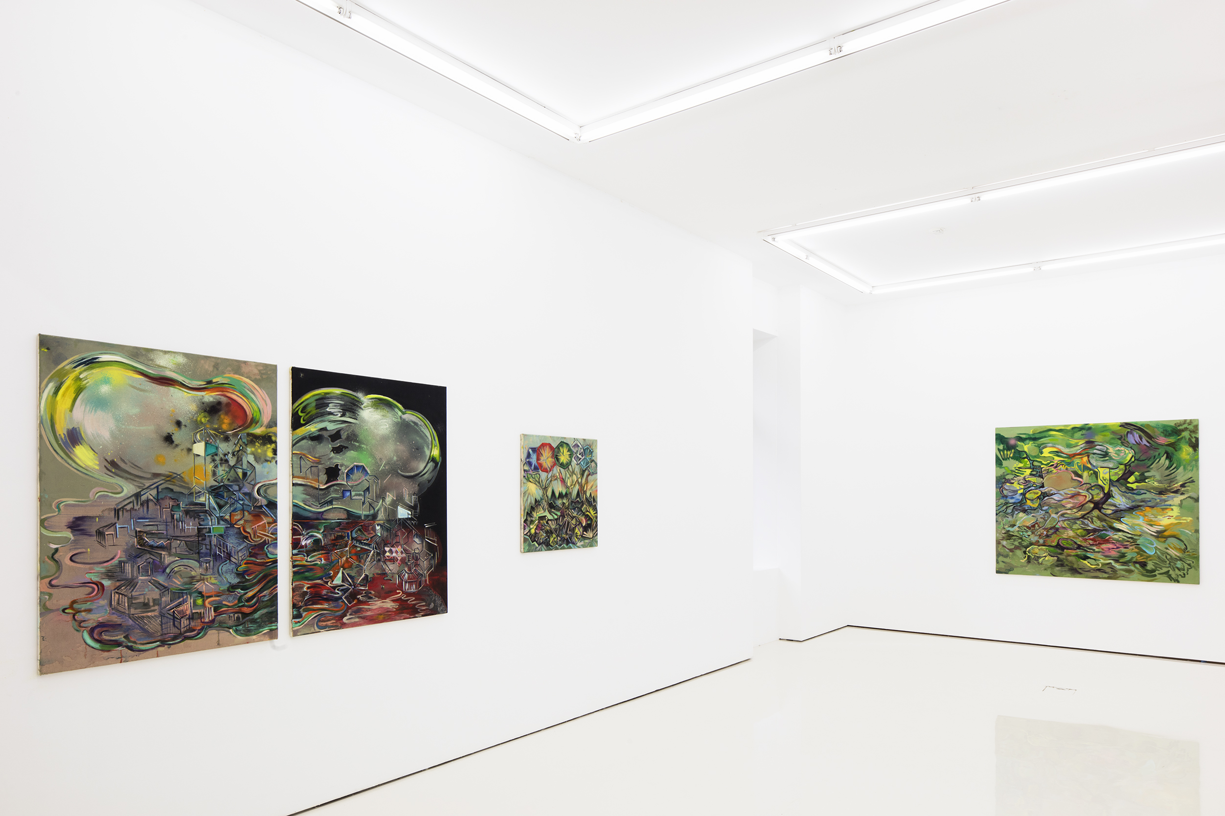 Alongside paintings on canvas, the exhibition features works on paper using charcoal, ink, spray paint, and chalk, inviting the viewer to take a closer look. Mountaintops and prismatically radiant forms emerge when scratched into oil pastel surfaces. The color palette is a blend of neutral tones and intensive hues characteristic of the artist. Painting serves as a map to another world, where natural forces surge, rivers flood, trees sway, and wind stirs the pools of color across the canvas.