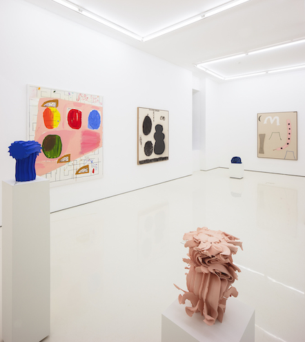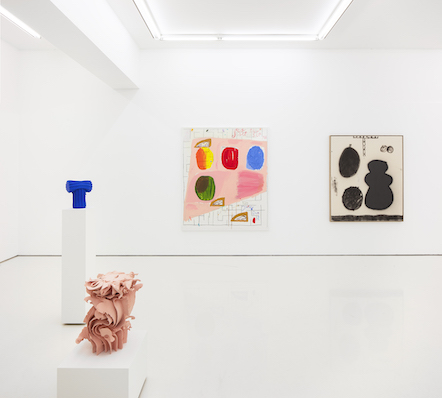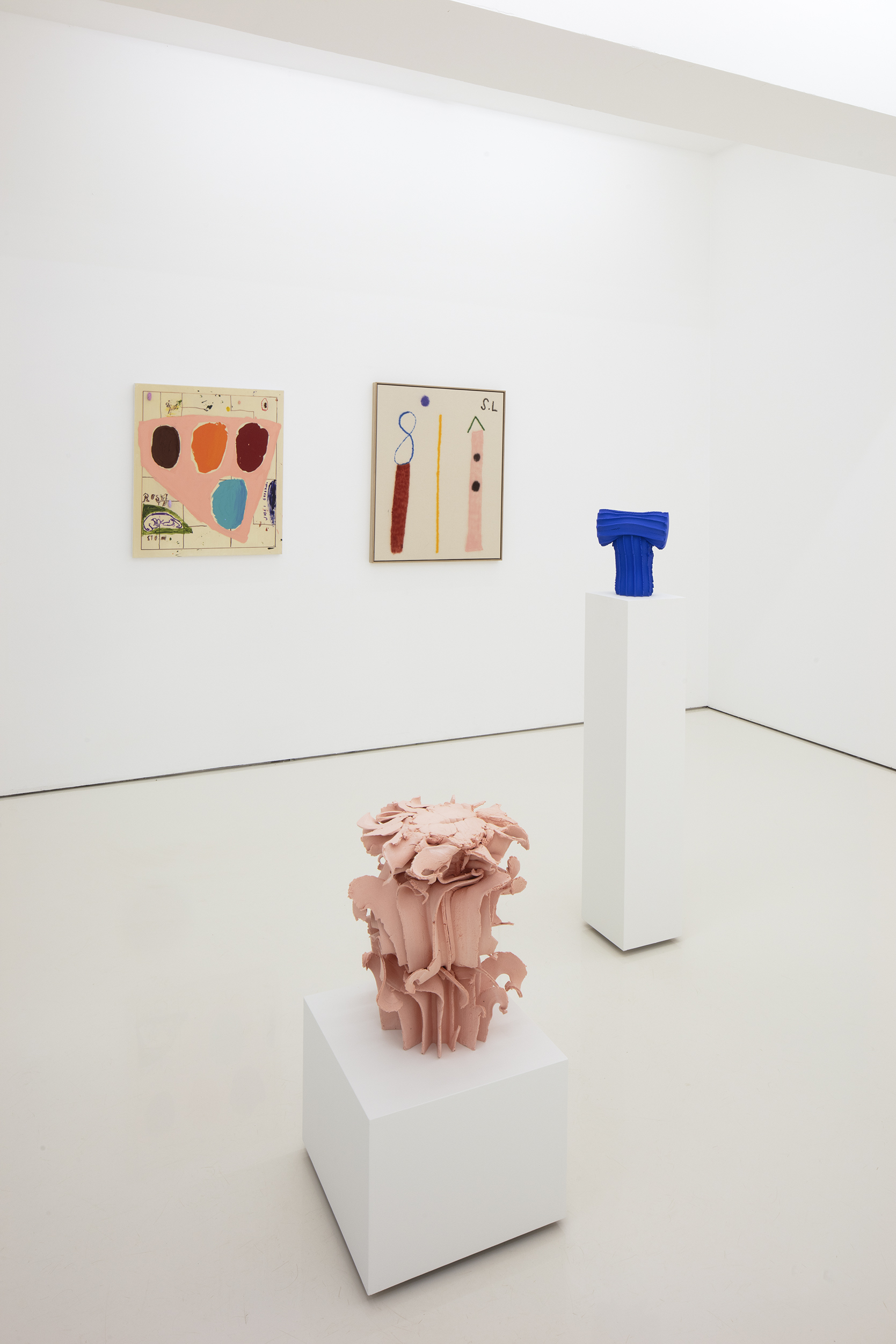 The paintings and sculptures in this group exhibition are woven together in a subtle, porous dialogue. They call out to each other, inciting collisions, their quirky forms and surprising gestures clashing headlong with preconceived assumptions and expectations. Something momentous announces its arrival, while at the same moment something deeply personal slips from our grasp – displayed together, the featured paintings and sculptures freeze this back-and-forth traffic in a densified form. Some of the paintings are steeped in elegant silence (Lehto), while others revel in spontaneous fullness (Goman) – and who could possibly overlook the fact that sculptures are basically brutalist candy (Alvarez)?