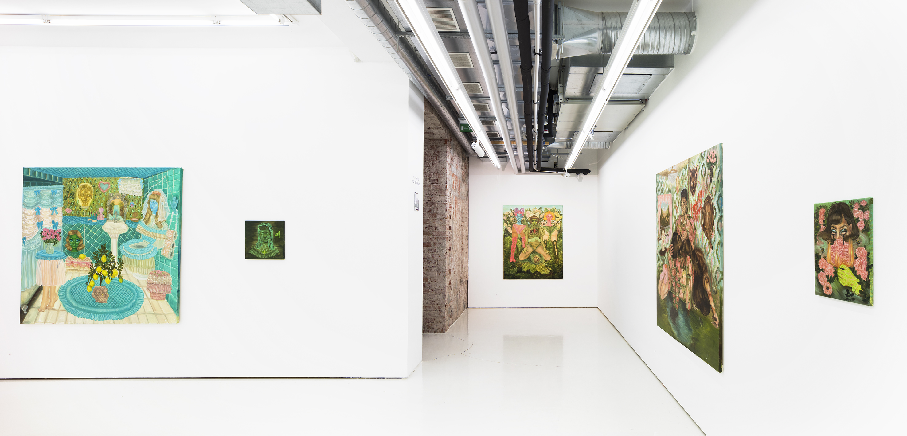 Ainala is known for her prolific, detailed works that explore mythologies and a variety of spaces, both physical and digital – some even imagined. The inner worlds of these new works are governed by their own rules. Mingled together in them can be the everyday, the sublime, and multiple other levels, unquestioned, as in a dream. The oppressive-looking interiors of the new body of works could be compared to untamed outdoor spaces, to the realms of witches and vampires. In both the walls that close in on us and the verdant exteriors we can make out figures from the realms of fairy tale, like forces of rescue or consolation, stories in which we can immerse ourselves or escape.