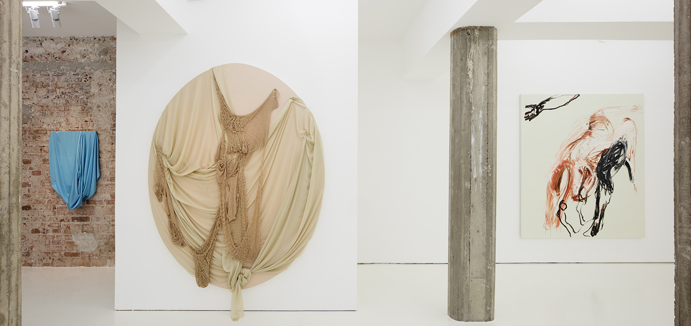 The exhibition as a whole consists of various elements that support each other. The crocheted and painted works have equal status in the exhibition. The dialogue between the materials and the relationships between the objects generate an interesting tension in the space. In his works Rusanen has focused attention on the sensory side of the materials. The exhibition’s textile collages contain a lot of silk – often associated with luxury, fragility and the feminine. Paired with silk, the powerful materiality of the paint would have created a harsh contrast, so Rusanen felt it necessary to adopt a thinner layer of paint and a finer line.