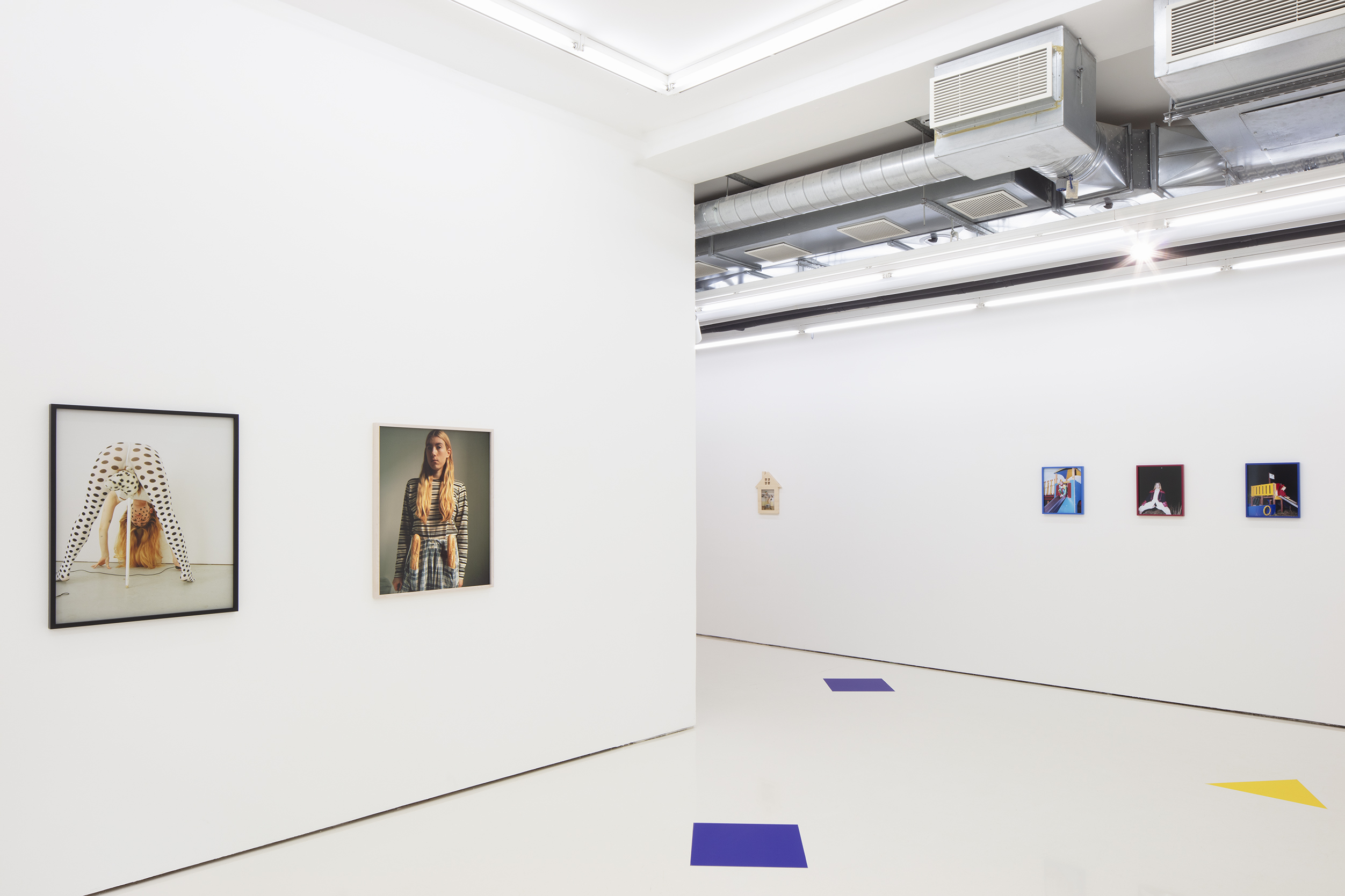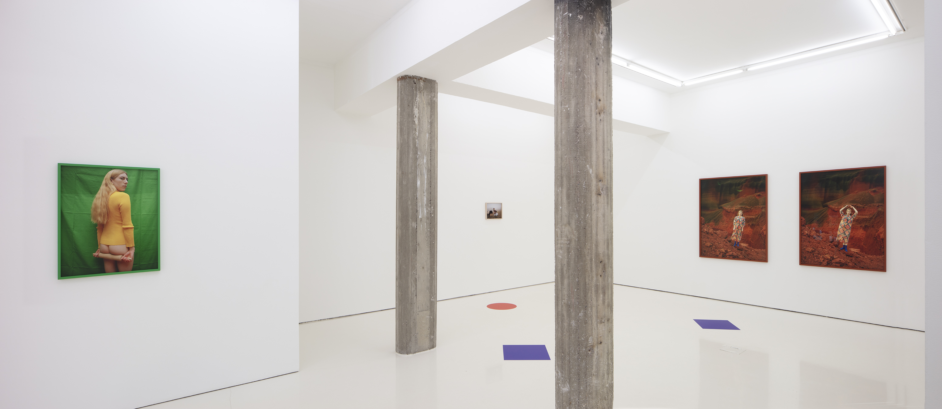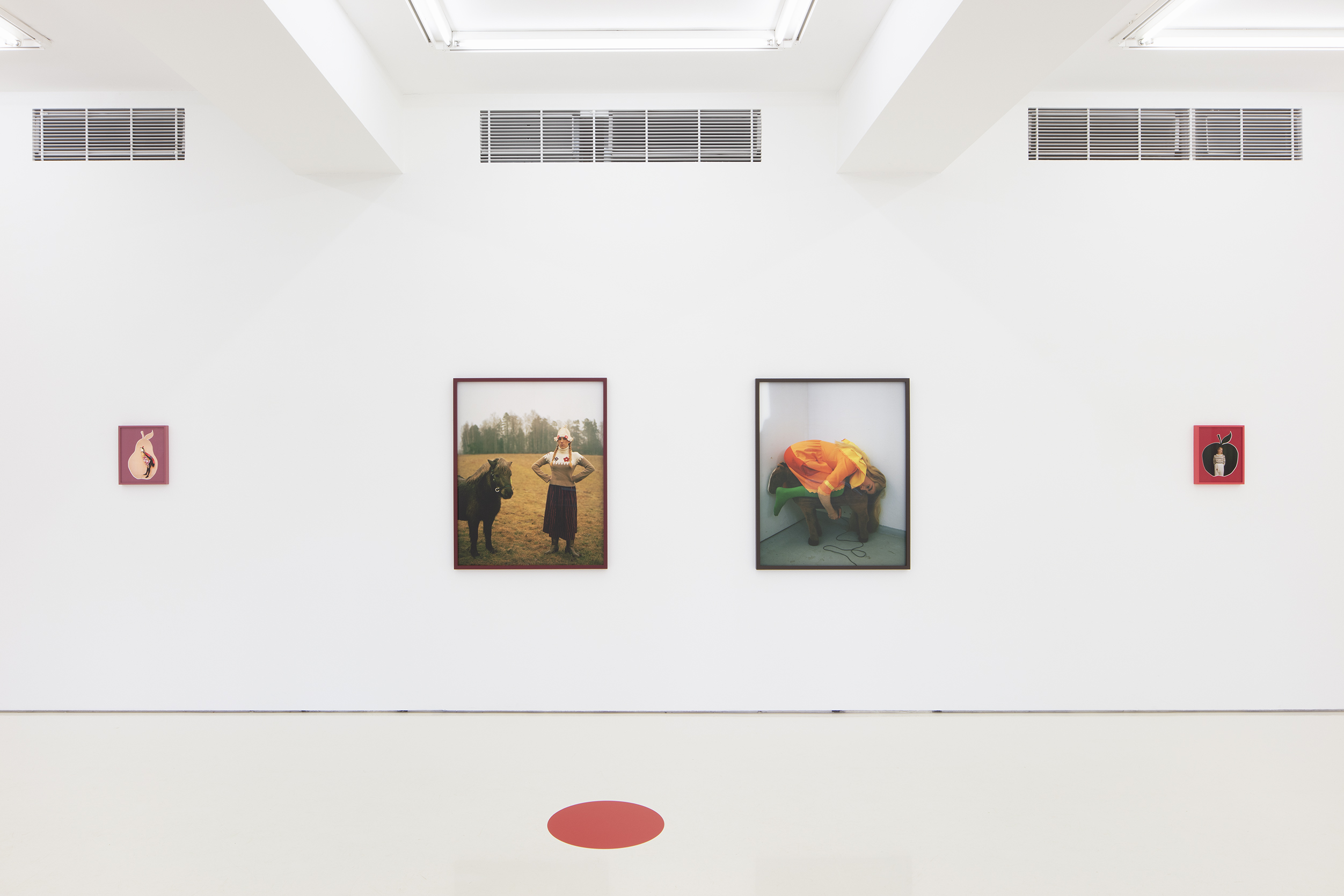 Sarpaniemi constructs her characters not only through colours, but also through objects and shapes. Buildings, objects and costumes are evocatively interwoven, blurring the line between the imaginary and the real. Landscapes, domestic interiors and settings such as a children’s playground serve as backdrops for her self-portraiture. A shy-looking clown seated on a slide echoes the garish colours of the monkey bars, while the polka dots on a hobby horse spread across the rider’s legs and face. The artist’s worlds expand beyond the image itself, invading the frames and passe-partouts.