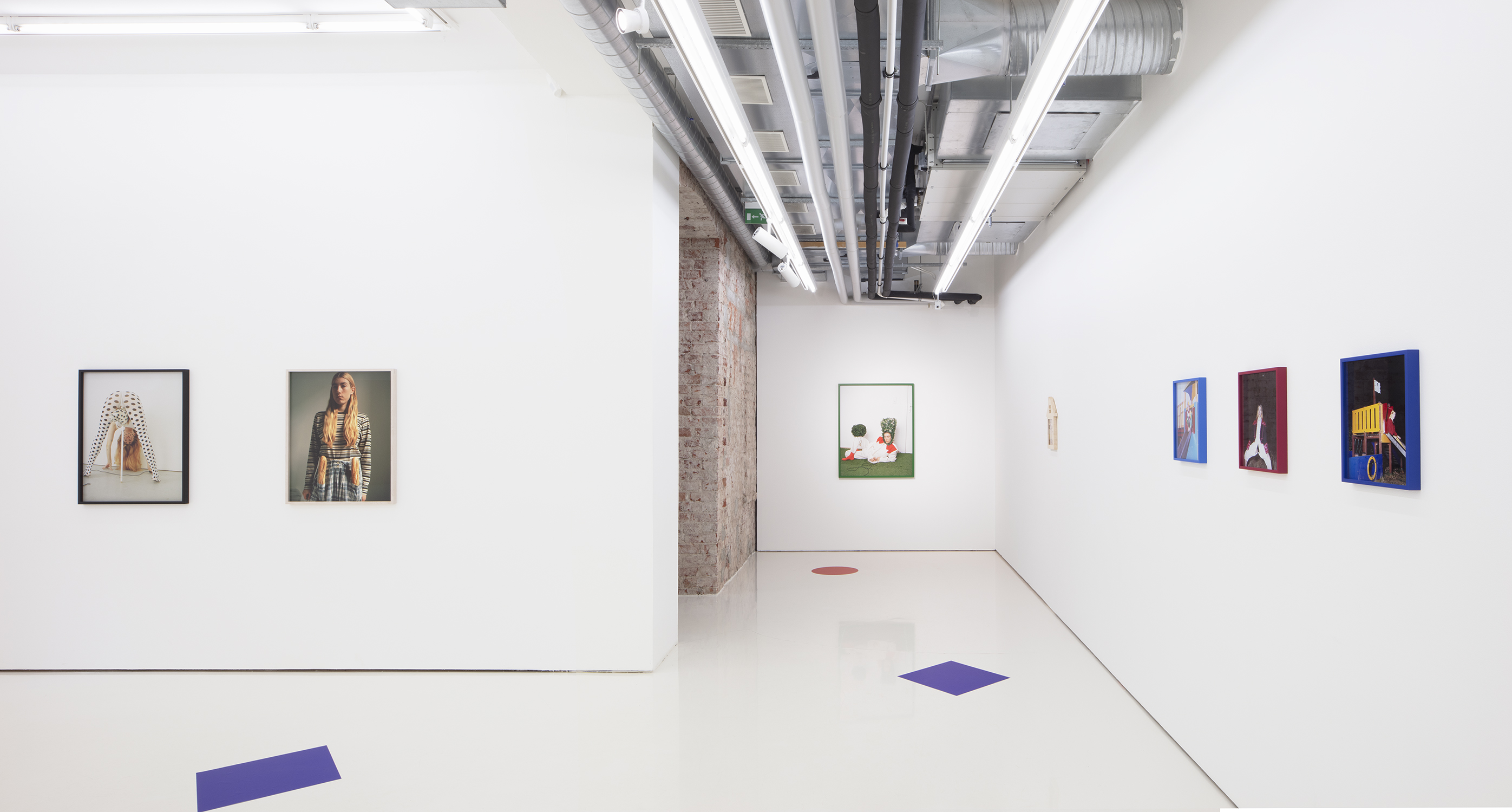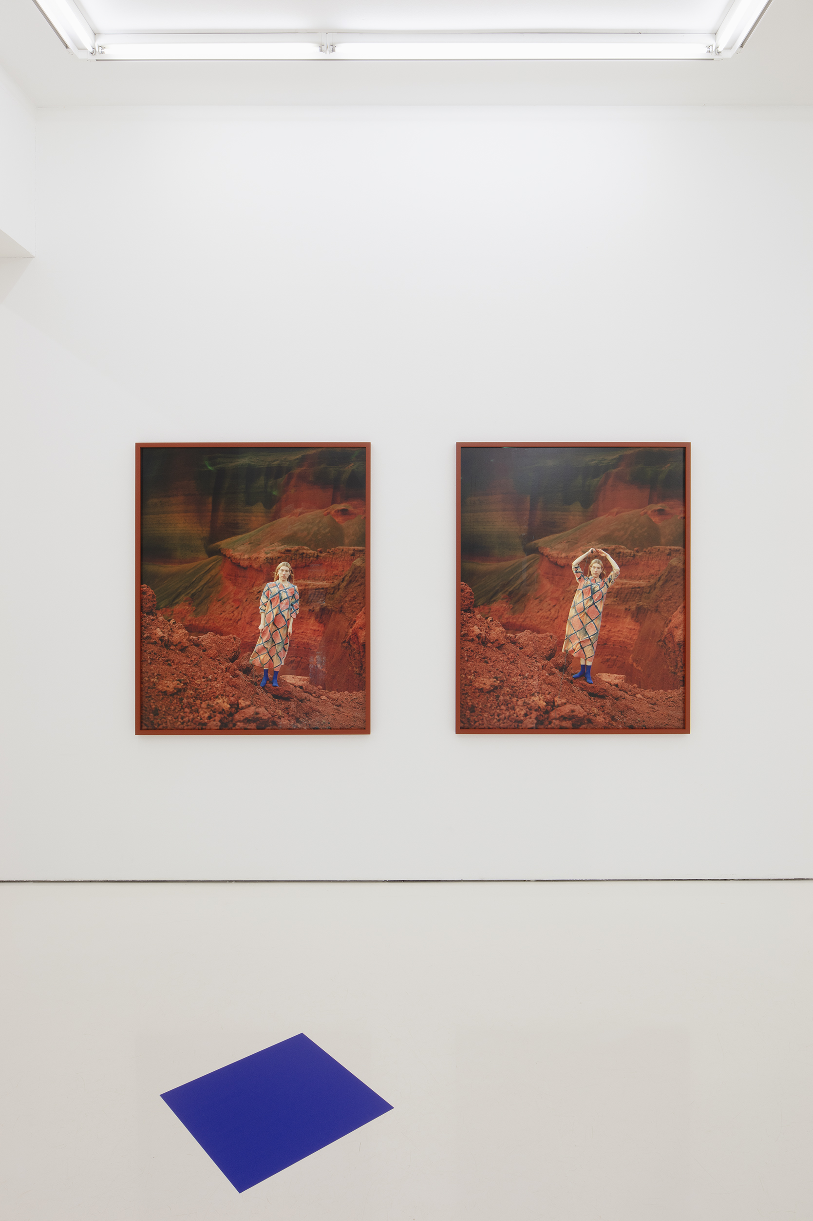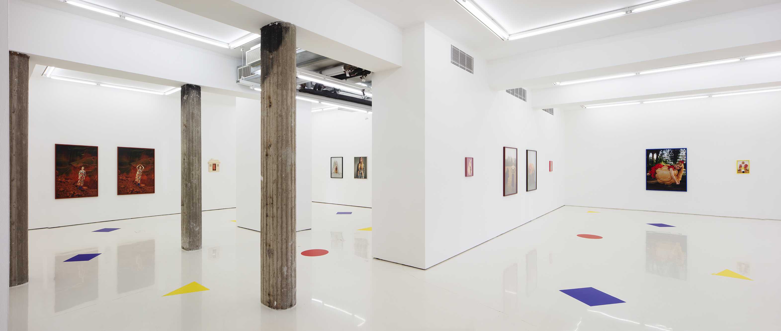 Sarpaniemi constructs her characters not only through colours, but also through objects and shapes. Buildings, objects and costumes are evocatively interwoven, blurring the line between the imaginary and the real. Landscapes, domestic interiors and settings such as a children’s playground serve as backdrops for her self-portraiture. A shy-looking clown seated on a slide echoes the garish colours of the monkey bars, while the polka dots on a hobby horse spread across the rider’s legs and face. The artist’s worlds expand beyond the image itself, invading the frames and passe-partouts.