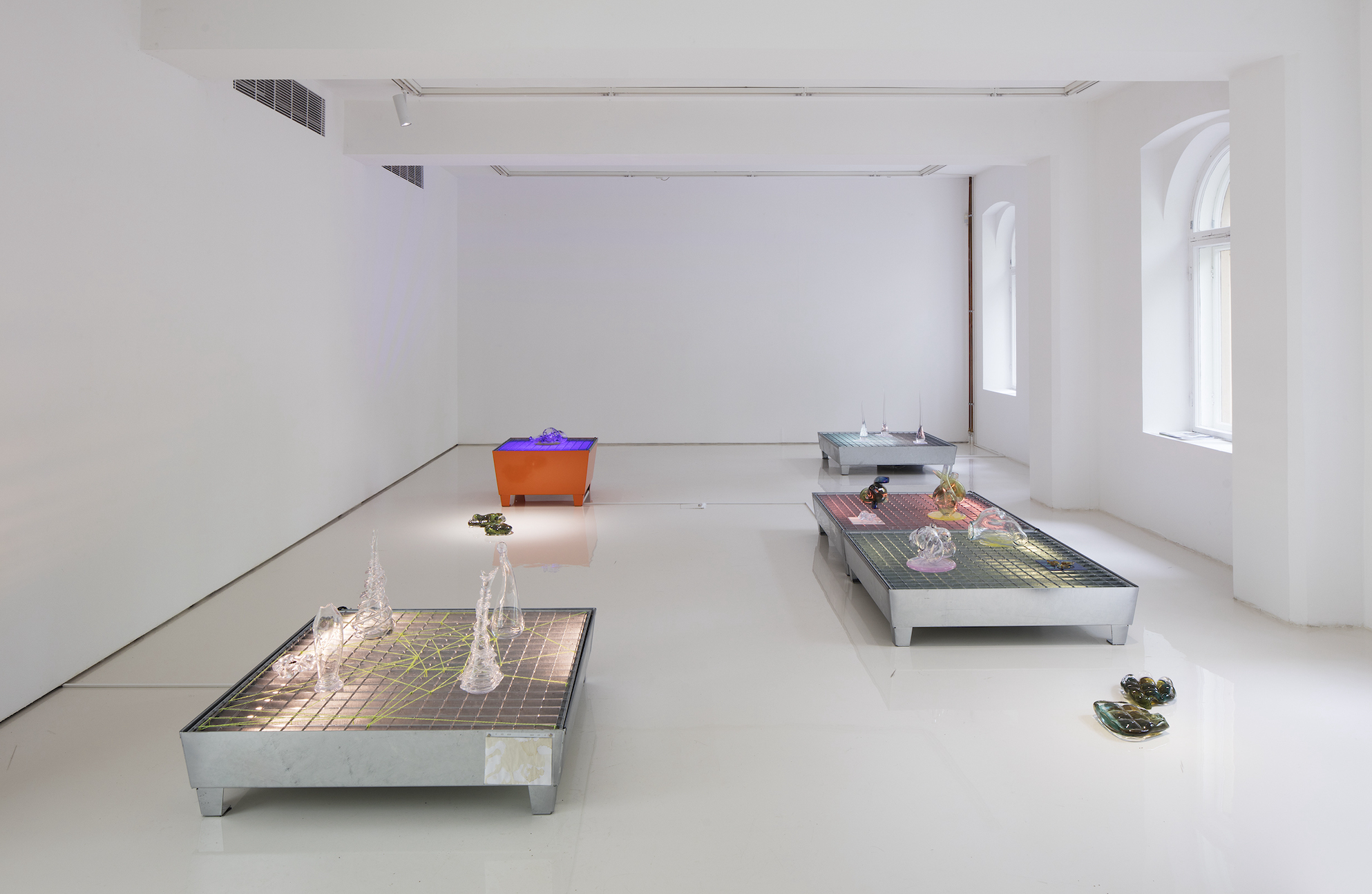The exhibition is based on containment vats or spill pallets used for environmental protection for different industries. These containers have a particular use in storing hazardous materials and solvents, but in this context, they also refer to 1970s and 1980s science fiction sets, where a service tunnel of a spaceship (like Nostromo in Alien, 1979) might have these kinds of steel grids. On these table-like containers, there are sculptures from the series of works that Laitinen has produced for Octopuses, and a setting connected to the history and mythology of coffee. These works are all related to Laitinen’s research on shapeshifting bodies, other-than-human oceanic lifeforms, and the alteration of neurotransmitters. In a broader sense, the pieces highlight the sensual qualities of glass as biomorphic forms made with the agency of sand, gravity, and air, and also as a mediator in the history of knowledge production. Glass has made it possible to see very near and very far. In the exhibition, the material acts as a “carrier bag” container, a tear vial, an alchemical tool, and a shelter.