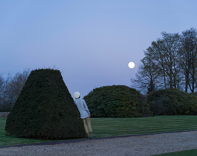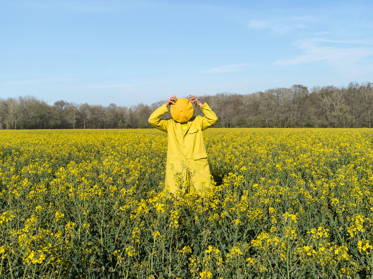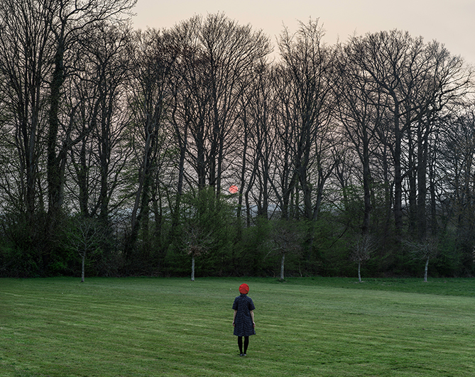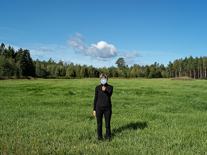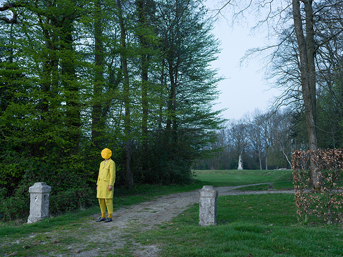 On a more personal level the pictures are publicly avowed tributes, contact makings, and rememberings. In her works Brotherus has for years used the list of ideas that the US conceptual artist John Baldessari (1931–2020) gave to his pupils in the 1970s. In the Helsinki Contemporary exhibition the dialogue with Baldessari has links with the coloured dots that have become his trademark. In the new works in the Baldessari in the Park series place and space emerge as landscape-like shots, in private moments that can be light-hearted or profound. In the pictures Brotherus makes adventurous experiments in the grounds of Château du Bois-Héroult in Normandy using coloured berets. With this gesture she transposes Baldessari’s circular symbols from paper to space. The dots give structure to the picture surface and direct the eye. They are also accents that point out something worth noticing in the surrounding landscape.