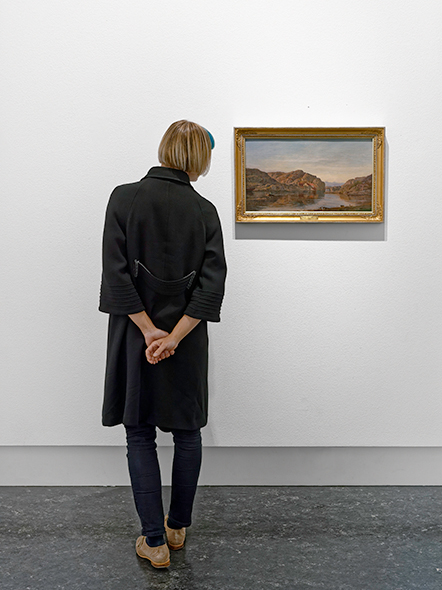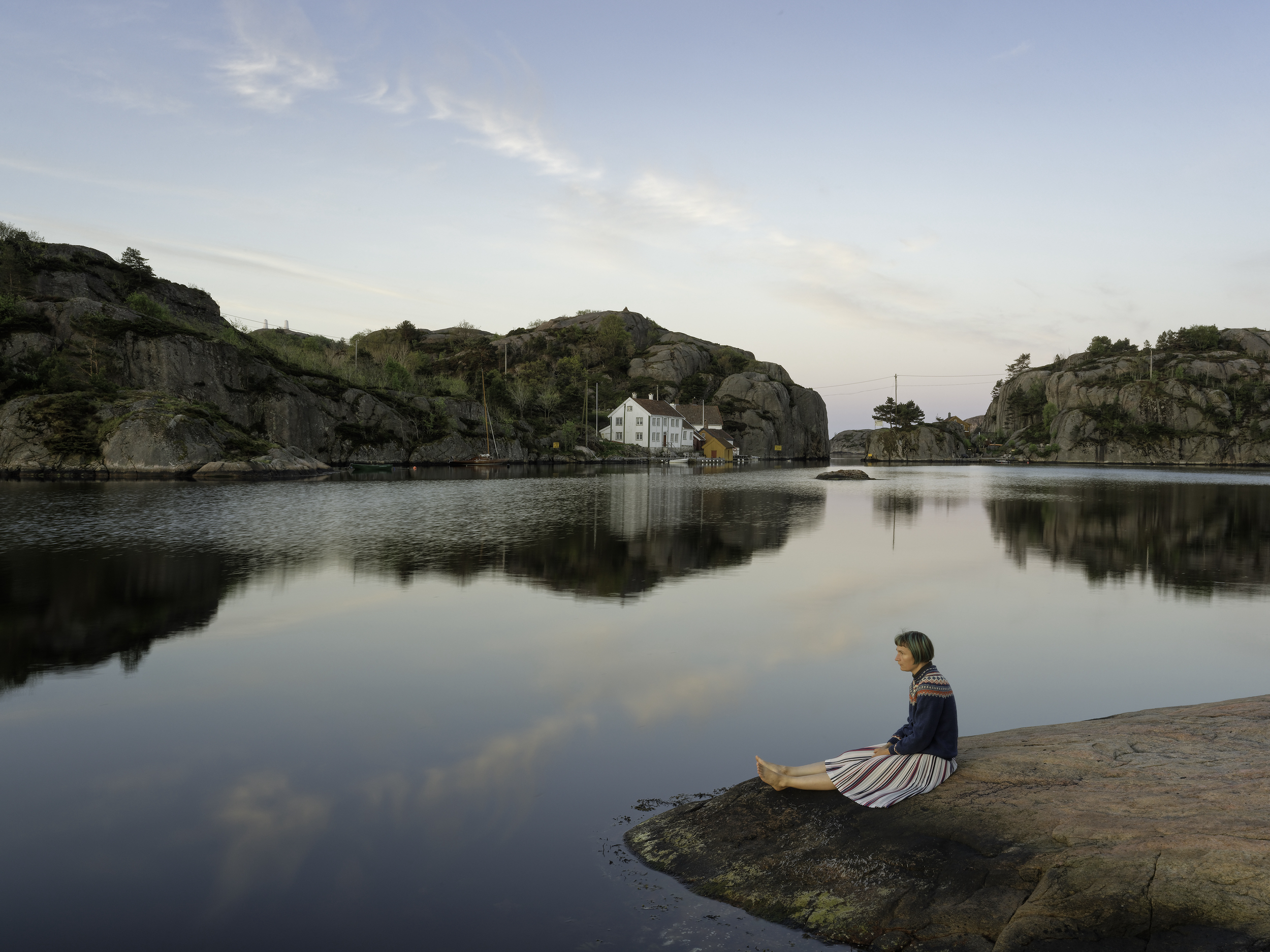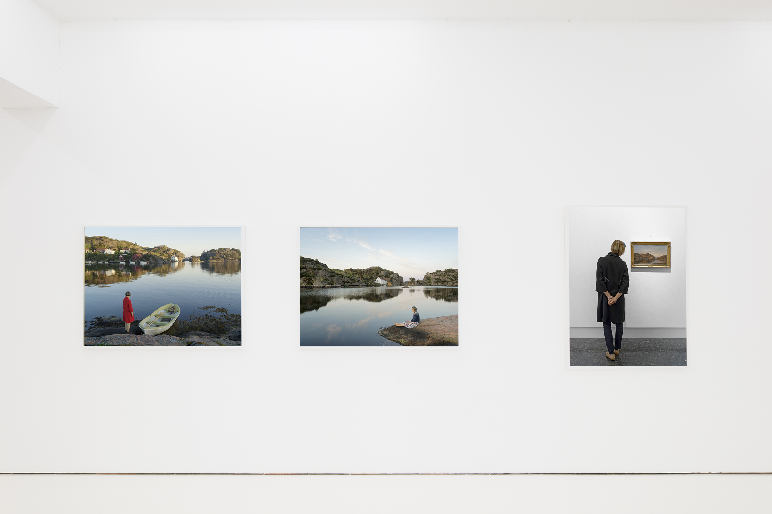 The genesis of the works is bound up with stories, adventures and visits around Europe. Following in the footsteps of the 19th-century Norwegian Romantic painter Amaldus Nielsen (1838–1932), Brotherus got to photograph in Ny-Hellesund, an archipelago off South Norway, in the same landscape that Nielsen painted more than a hundred years ago. In her pictures Brotherus has captured sunrises and sunsets, as Nielsen did in his time. “I thought it was interesting that he had painted a lot of works of the same place, it involved a serial thinking that is attractive to a photographer: that one picture is not enough and cannot tell us everything, that the content, which transcends the individual pictures, arises out of variants, out of observing and showing the variation.”
