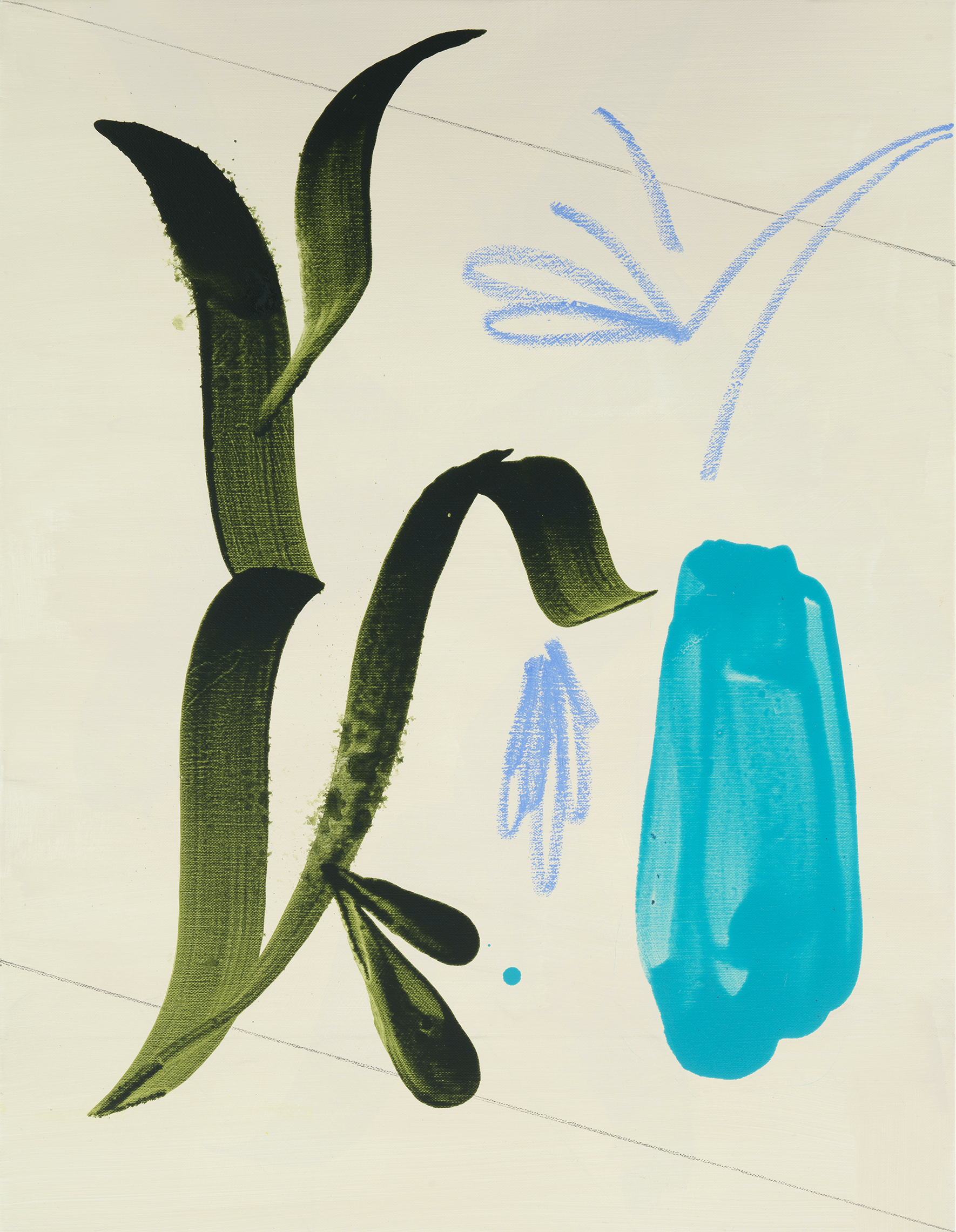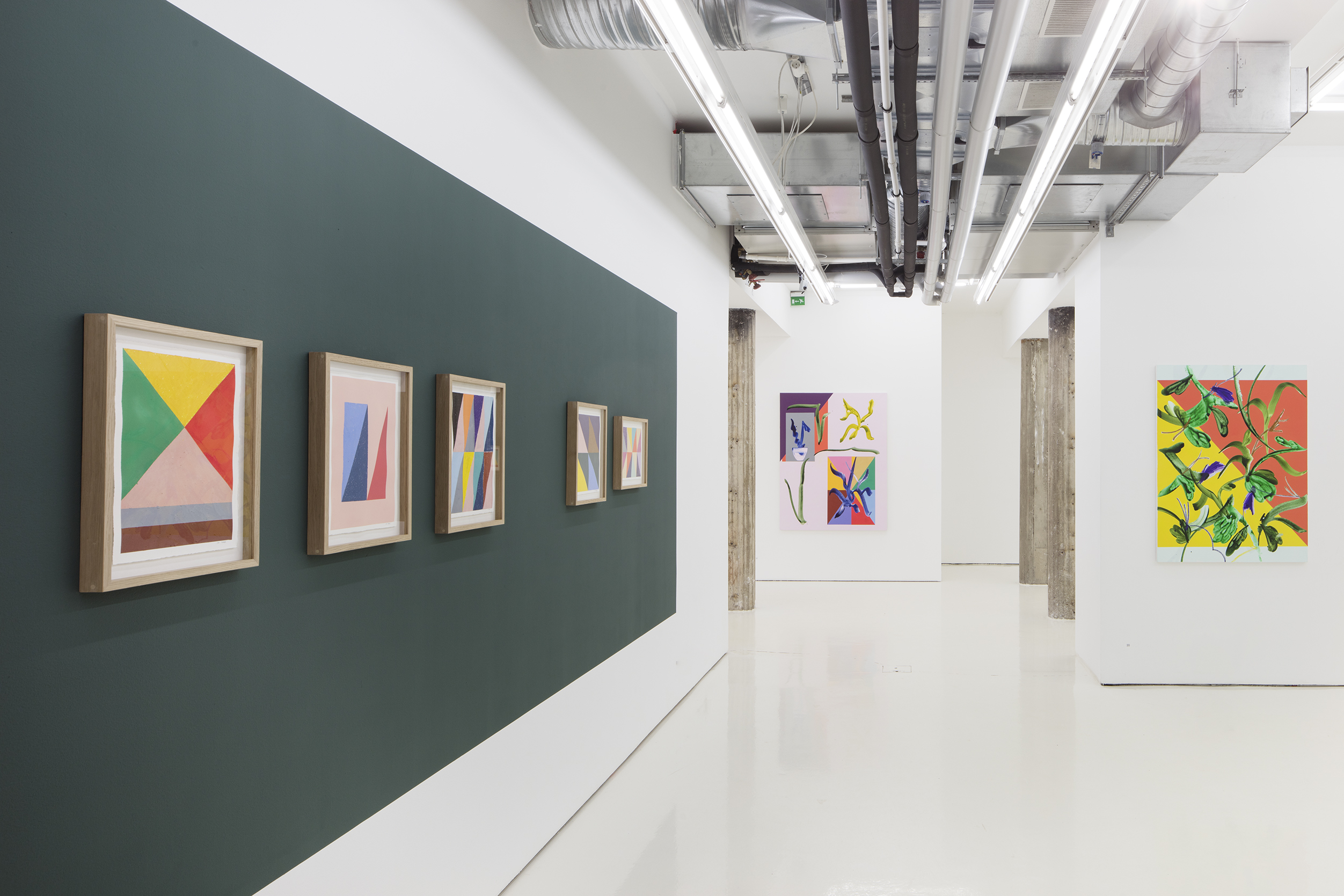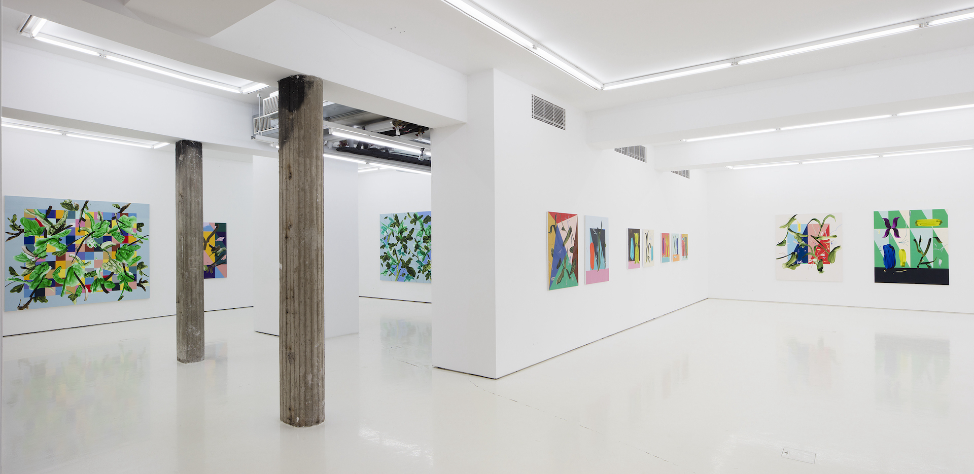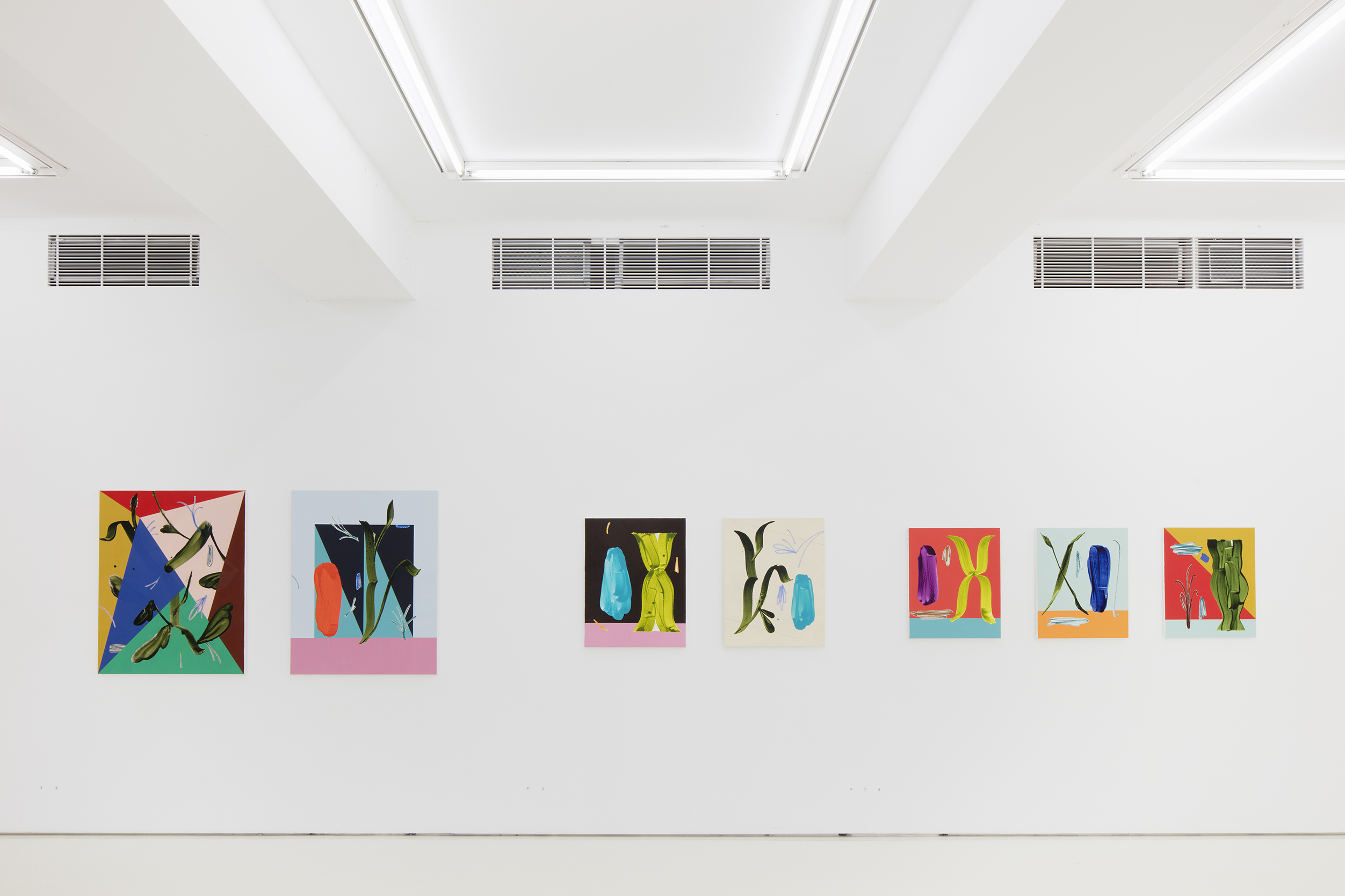 Spirit, a solo exhibition by Ilari Hautamäki, brings the radiance of spring to Helsinki Contemporary. In his new, richly coloured works Hautamäki continues his investigation of the relationships between the organic and the constructed, of the fine balance between chaos and order. Developing his familiar theme of plants has led him to focus on the movement of the hand and to the inclusion of elements reminiscent of typography and calligraphy. Organic material painted with spacious brushstrokes breaks up the geometric shapes and full colour fields.