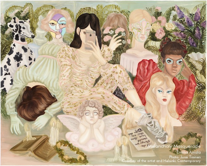 Emma Ainala's detailed and rich paintings are brimming with references to pop culture, the world of social media and art history. Ainala’s works of art combine candy colours with earthy tones, and their topics strike a balance between beauty and terror.