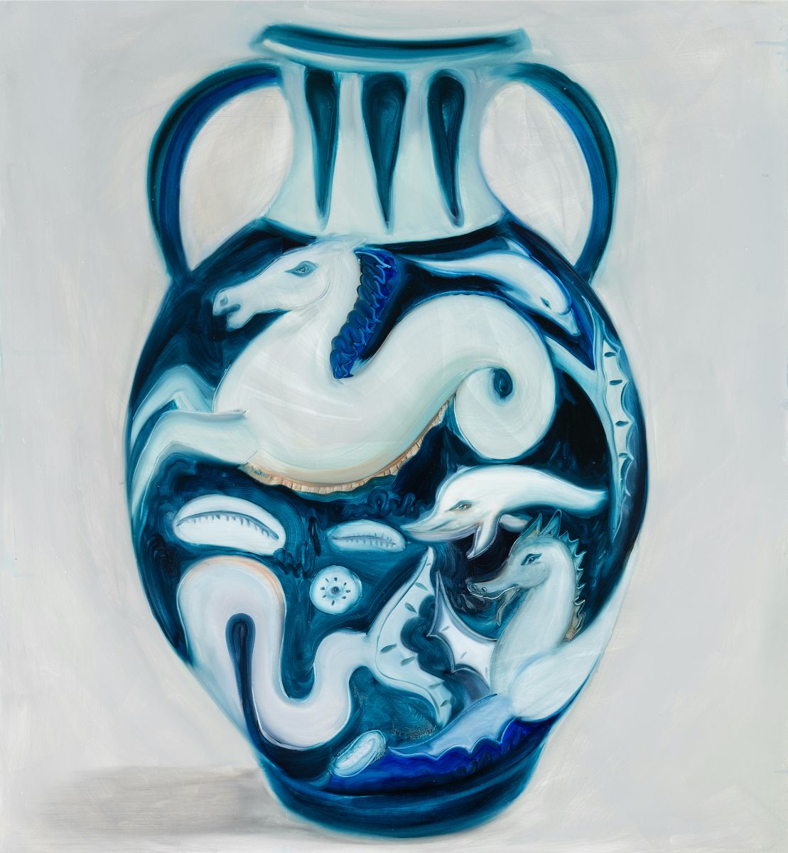 HANNALEENA HEISKA’s paintings, drawings, video works and installations create illusions of captured moments, different worlds, and subcultures. She makes her paintings in a single sitting, “alla prima”, striving to achieve brushwork that looks effortless and easy. This gives her paintings the feeling of being a fleeting moment, and a sort of melancholy. Her imagery has been inspired by multiverses, artificial intelligence, the future, and the possibility of life after death. The new works explore timelessness, humanity and signs of utopia, with a starting point in the forerunner of sci-fi, the novel The Blazing World by Margaret Cavendish, from 1666.