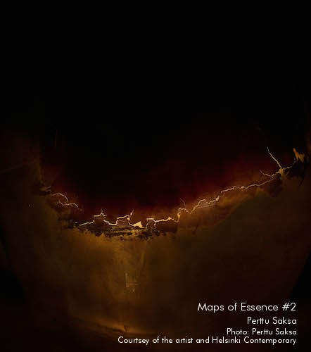 PERTTU SAKSA’s photographic series Maps of Essence deals with man’s relationship with energy and its significance for humanity. Saksa was interested in the concrete nature of the topic while traveling in Western Africa: oil and energy as a structural component of society and its localization as a physical element on the human level. Saksa through-lit petrol canisters, so that the light permeated the layer of mud covering the containers and the cloudy petrol, thus generating a series of intense, abstract works. Despite this reductive approach, the images’ abstract subject matter, petrol, began to seem individual and tangible.