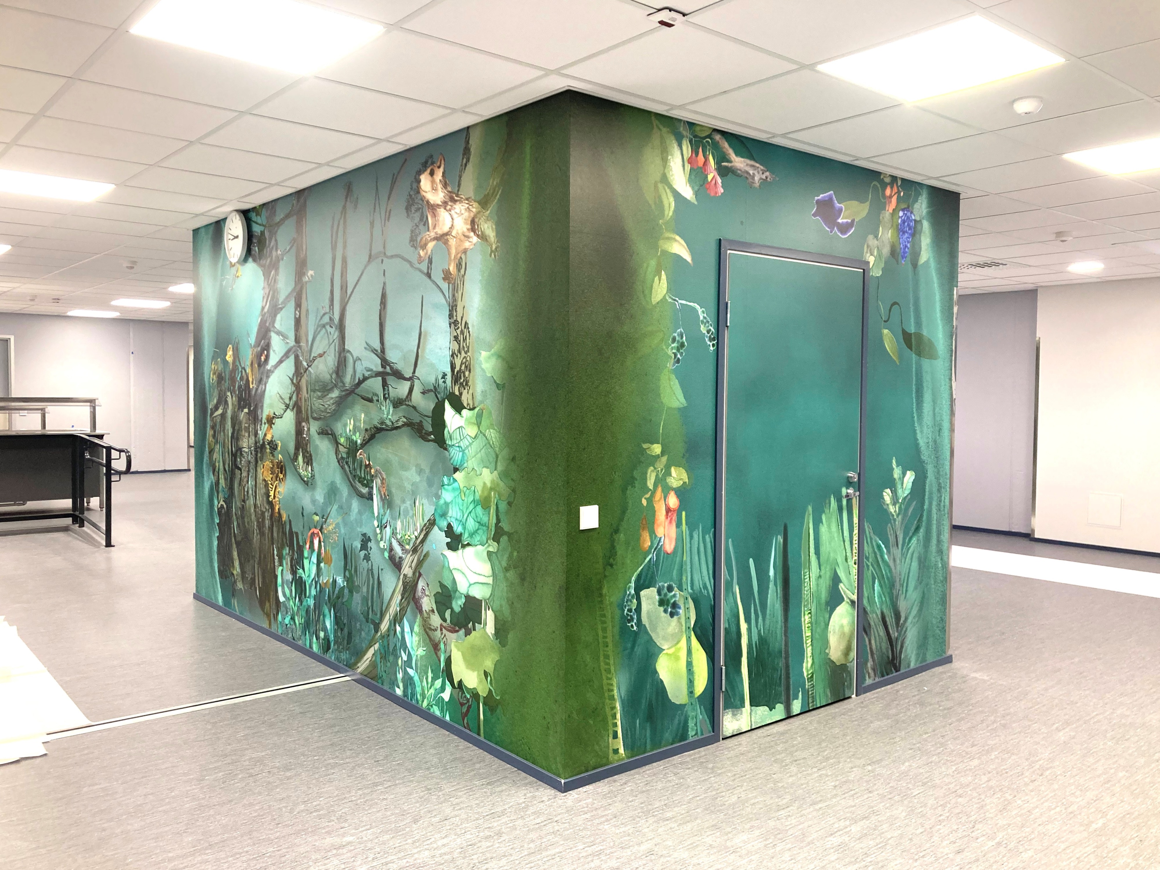 The work consists of an art wallpaper in the dining hall, sticker prints attached to the glass surfaces in the classrooms, an animation, watercolor paintings on birch plywood, and a poetry book that Immonen created in collaboration with the school's students and author Emilia Lehtinen.